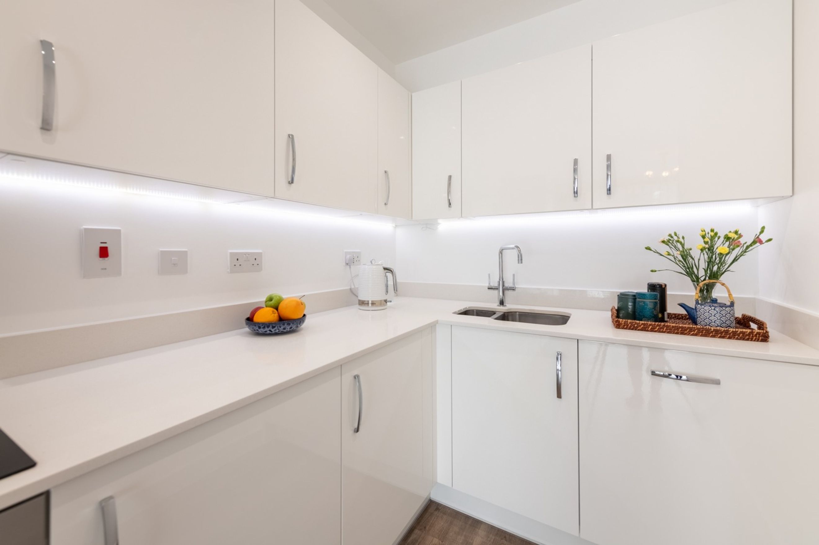 The open plan living area flows into a semi separate modern kitchen, fully fitted with integrated appliances including an oven, hob, extractor hood, fridge freezer and dishwasher. Sleek white cabinetry with chrome finishes and under cabinet lighting completes the contemporary feel.