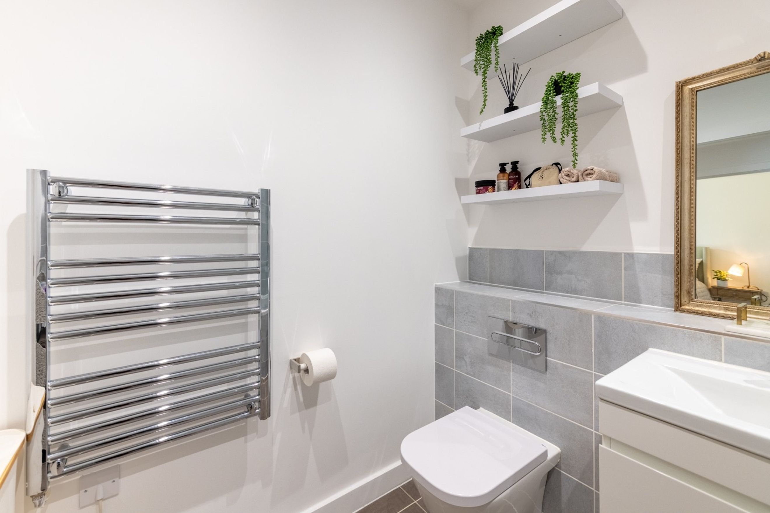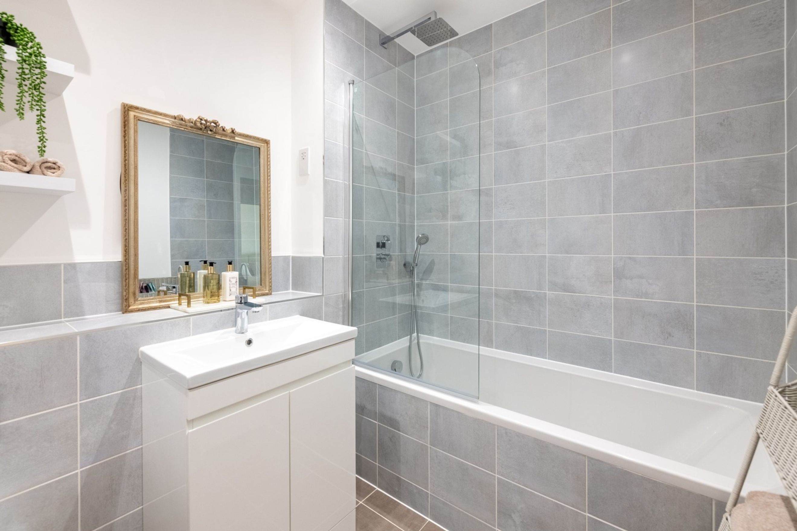 A generously sized double bedroom features a fitted wardrobe, while the modern bathroom offers grey tiling, a clean white suite, chrome mixer tap, electric heated towel rail and an over bath shower with glass screen.