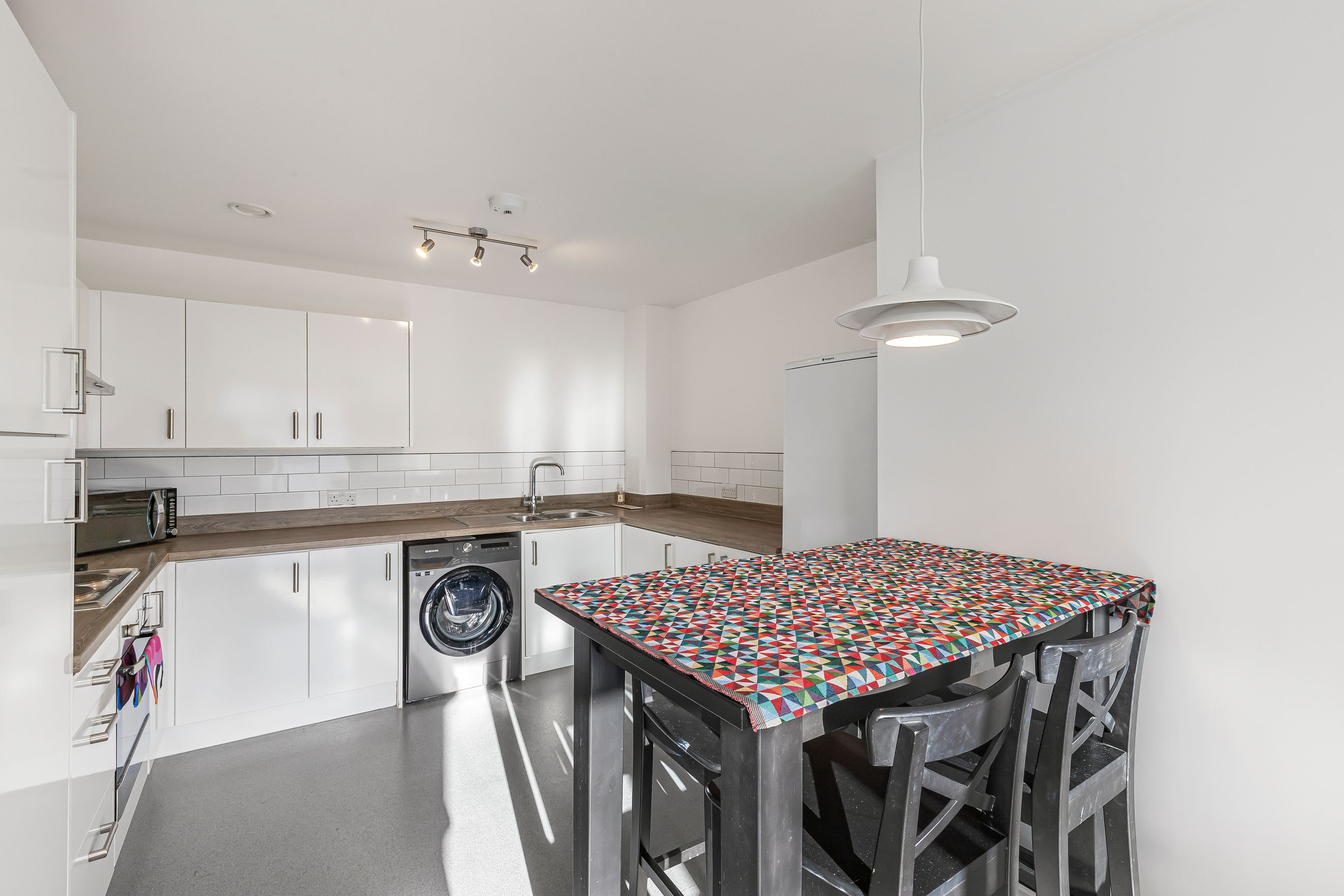 The kitchen is equipped with essential white goods including an integrated extractor, cooker, and freezer.