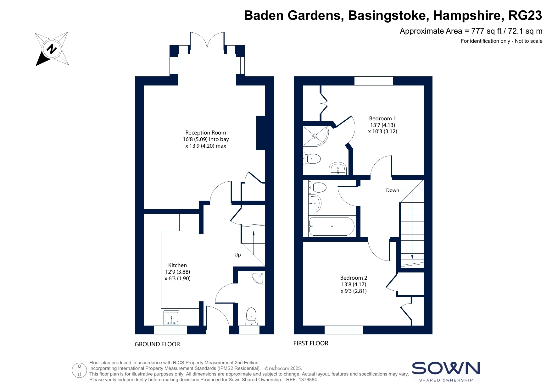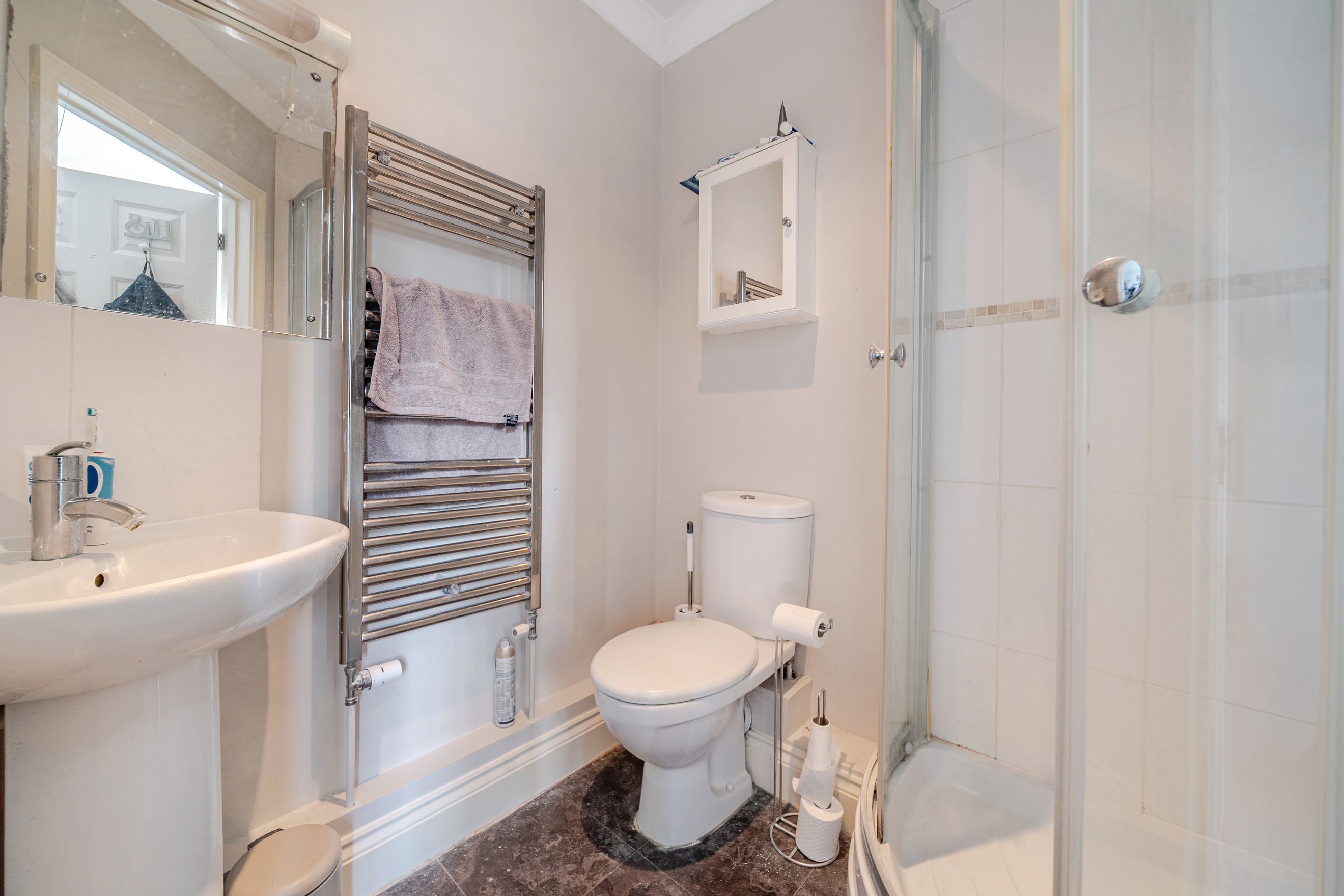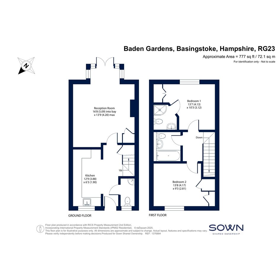 The ground floor features a bright kitchen positioned at the front of the house, complemented by a spacious reception room at the rear with French doors opening onto the garden, creating a wonderful flow of natural light. A handy cloakroom completes the downstairs accommodation. Upstairs, there are two well-proportioned bedrooms, including a main bedroom with its own en-suite shower room. A modern family bathroom serves the second bedroom, providing comfort and practicality for everyday living. Outside, the property benefits from a private, corner plot rear garden and allocated parking to the front.