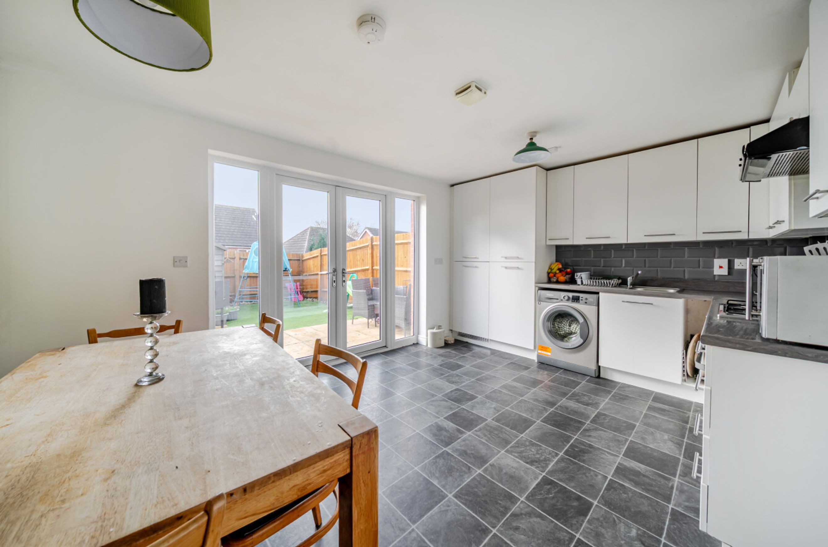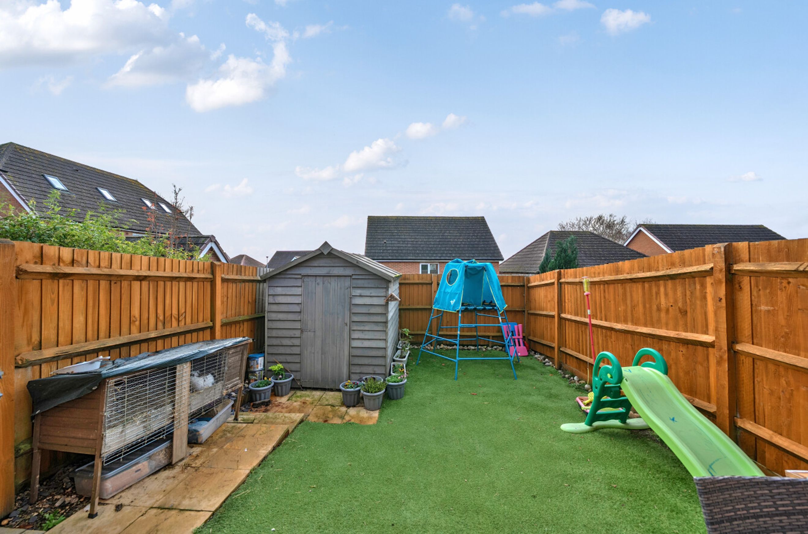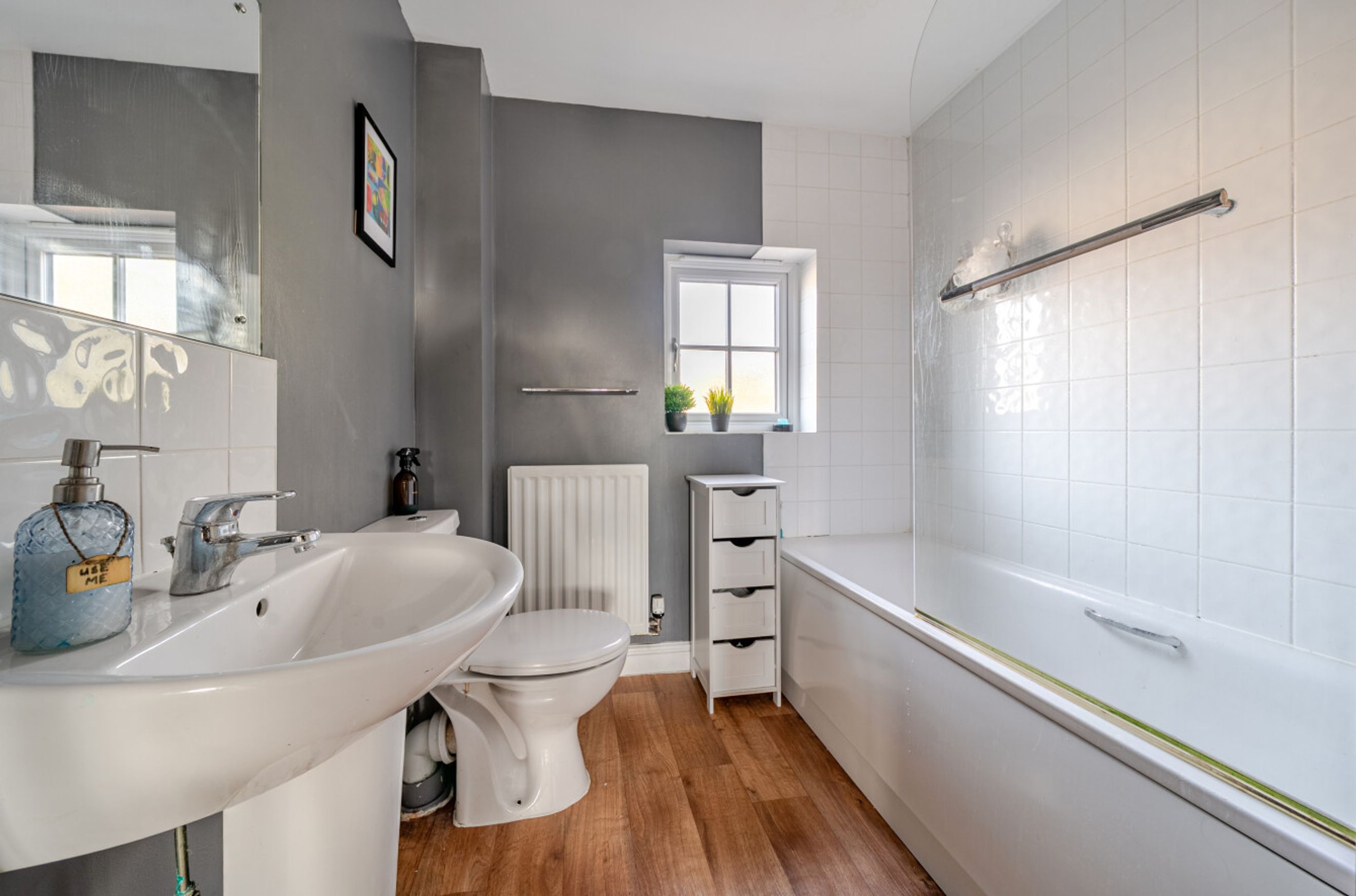 Upstairs, there are three comfortable bedrooms. The bathroom has a modern, white suite. Two parking spaces are provided, as well as your own back garden with a shed.
