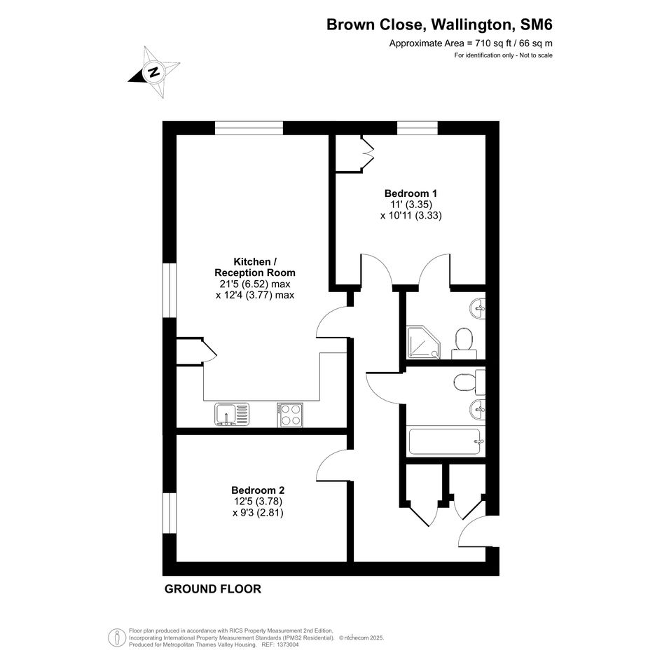 The property comprises an entrance hallway, an open-plan living room and kitchen, two bedrooms and two bathrooms.