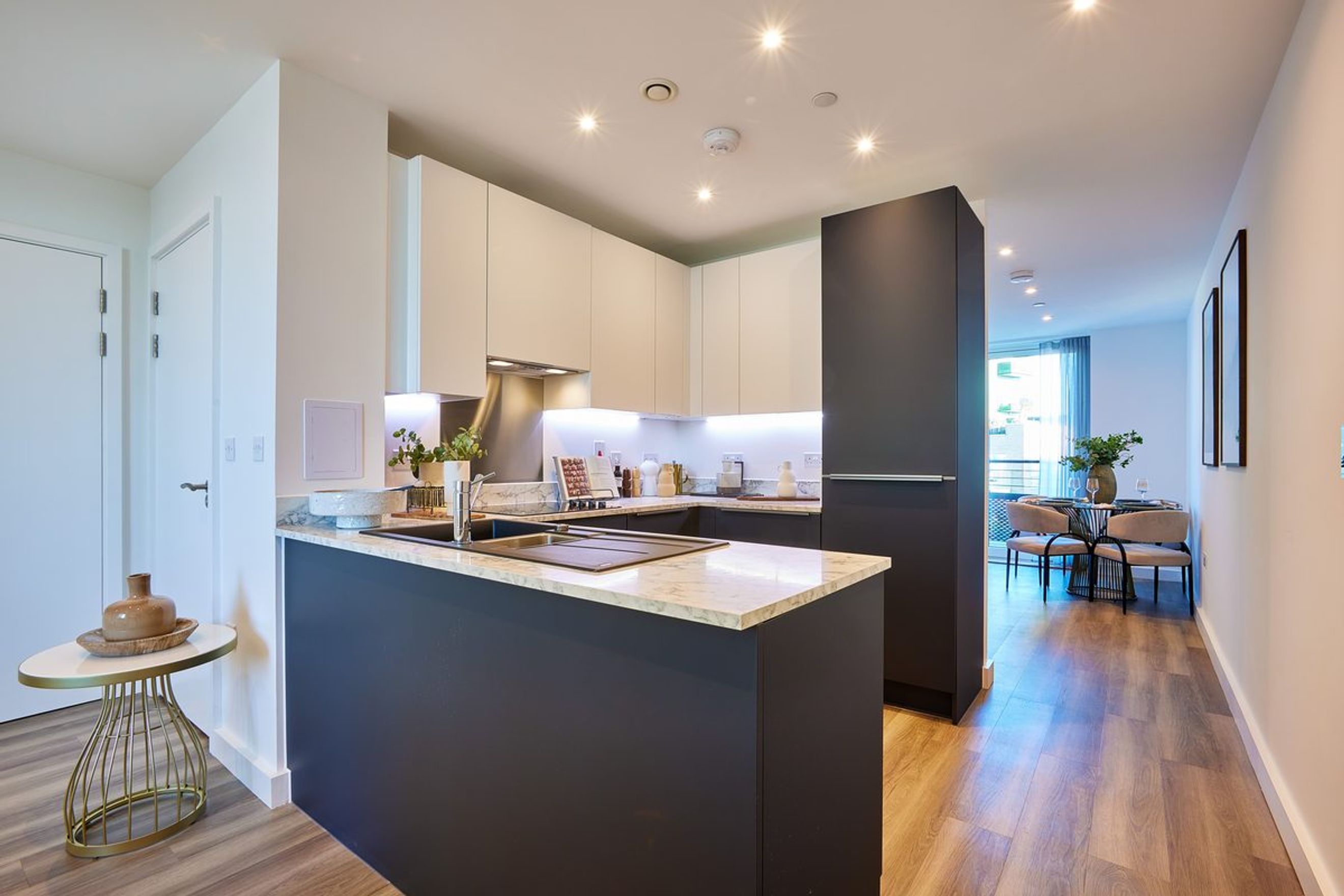 The indigo kitchen units provide plenty of space for all your essentials. Fully integrated appliances include an electric oven, hob, extractor fan, dishwasher and fridge/freezer. There's also a free-standing washer/dryer located in the utility cupboard.