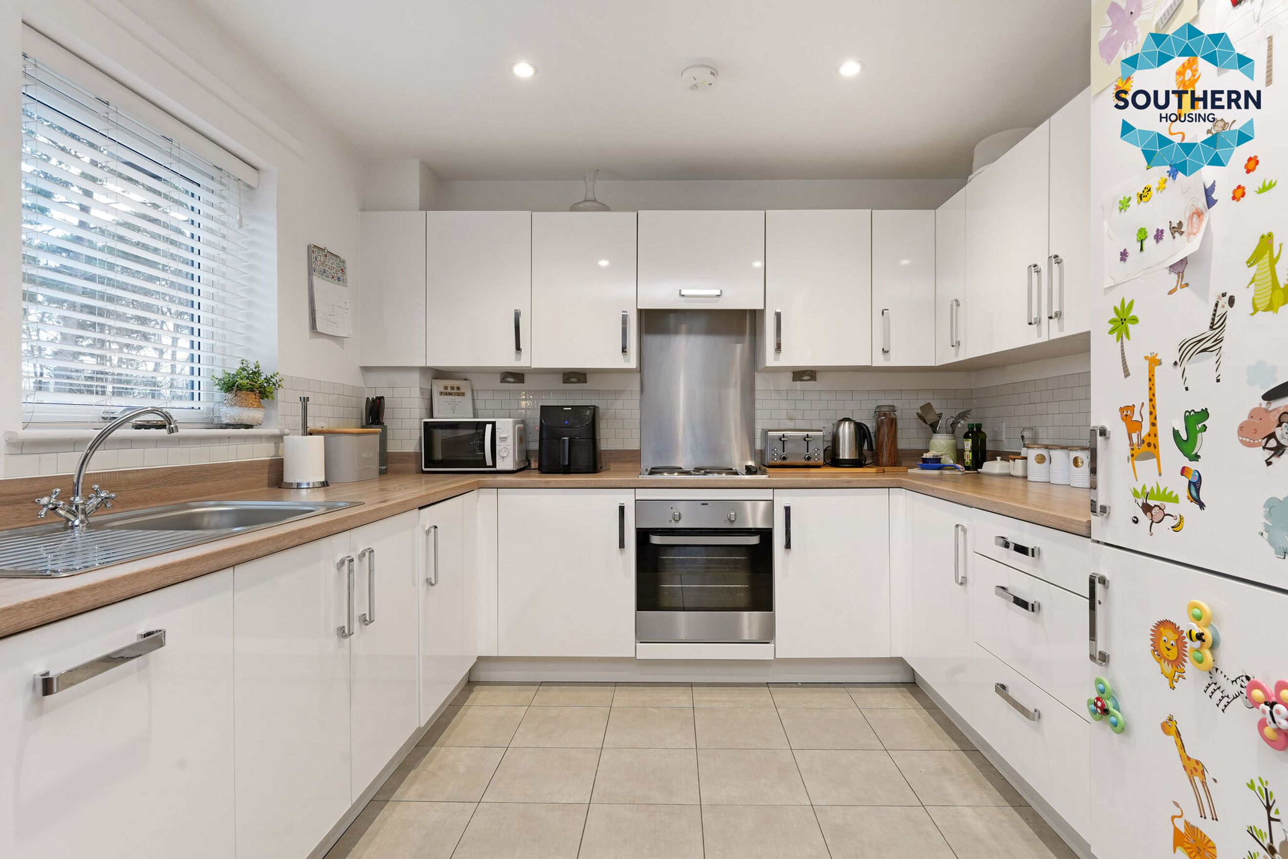 The kitchen features modern, white gloss cupboards and light wood countertops, which together offer plenty of storage and food prep space. You also have fully integrated appliances including the oven, hob, extractor fan, fridge/freezer and dishwasher.