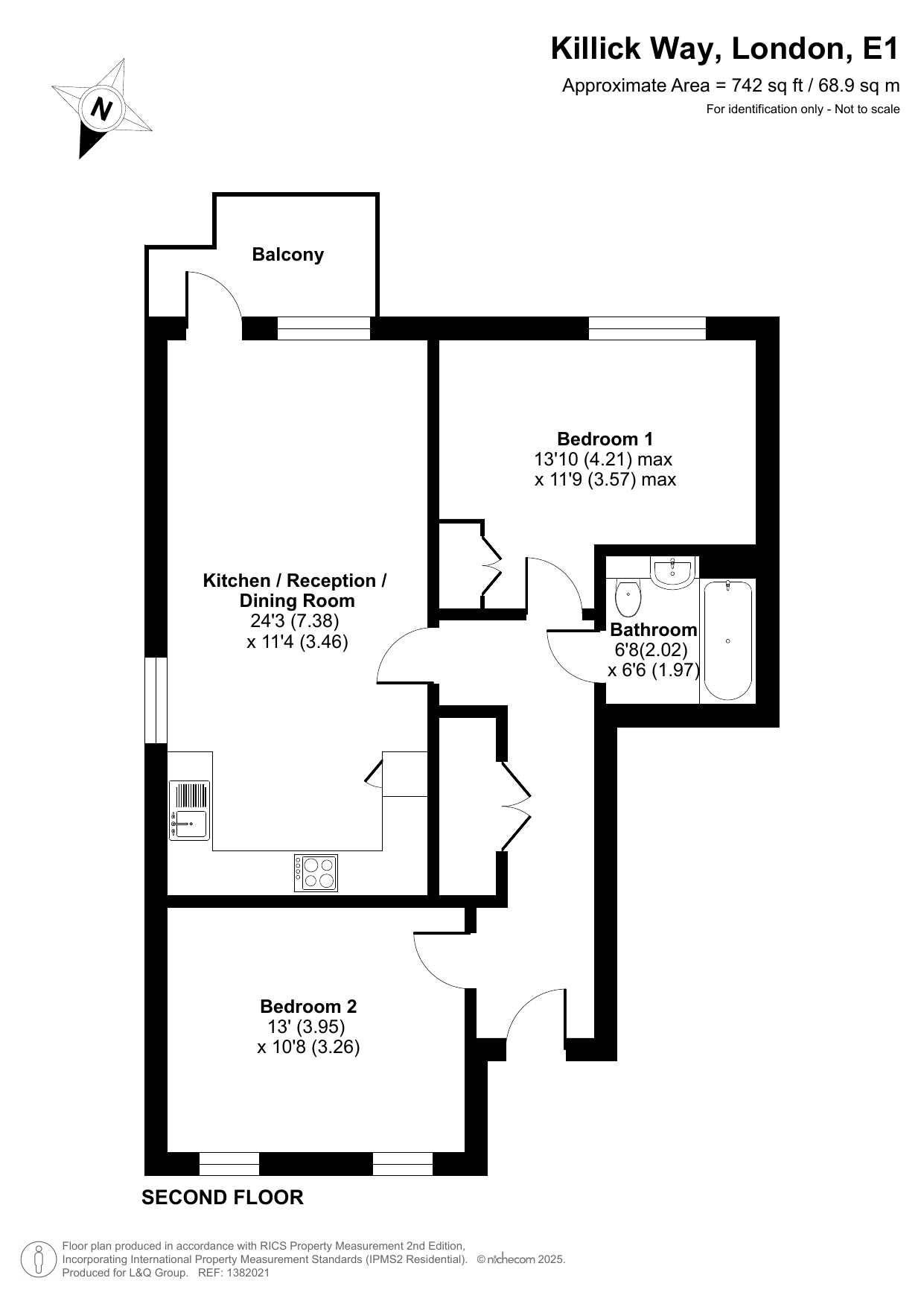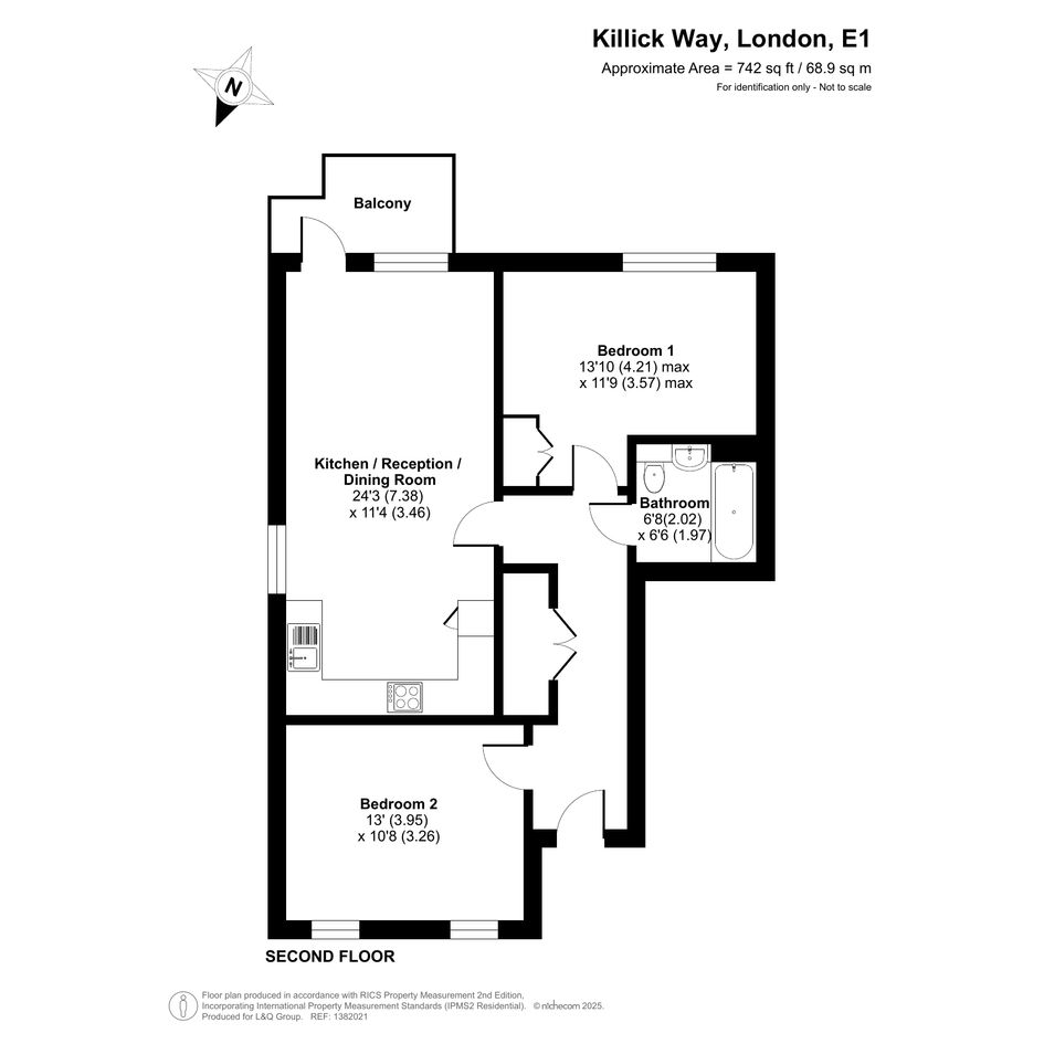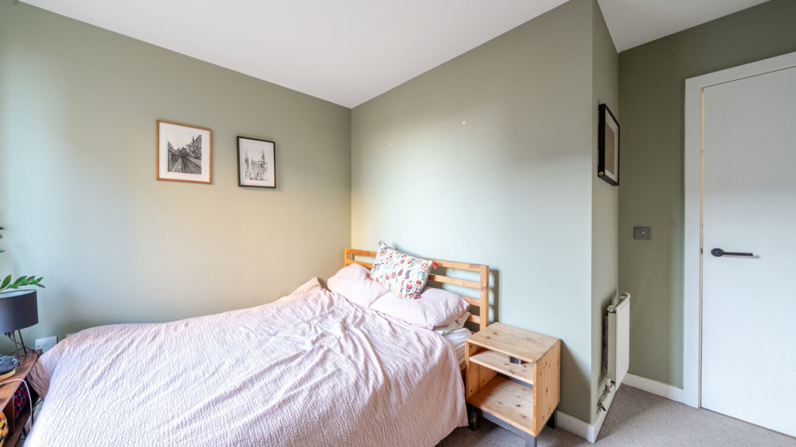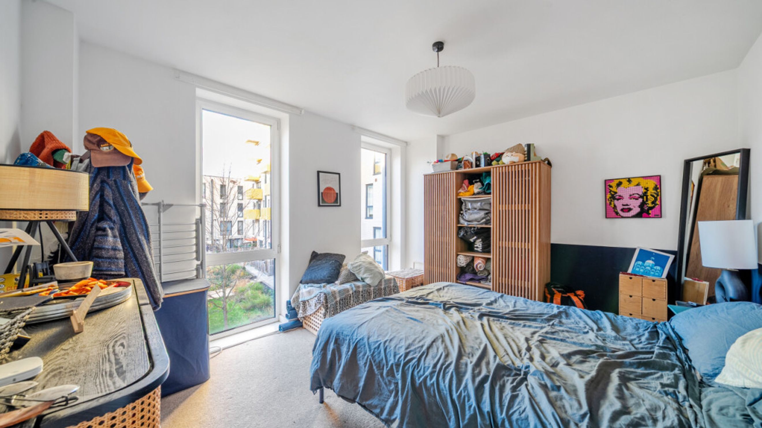 Enter this modern triple aspect apartment via a spacious hallway with storage. The dual aspect open plan living area opens onto a south facing private balcony overlooking the communal gardens and a modern kitchen includes integrated appliances. There are two double bedrooms, one with benefit of built-in storage. A contemporary bathroom with shower over bath, completes the accommodation.