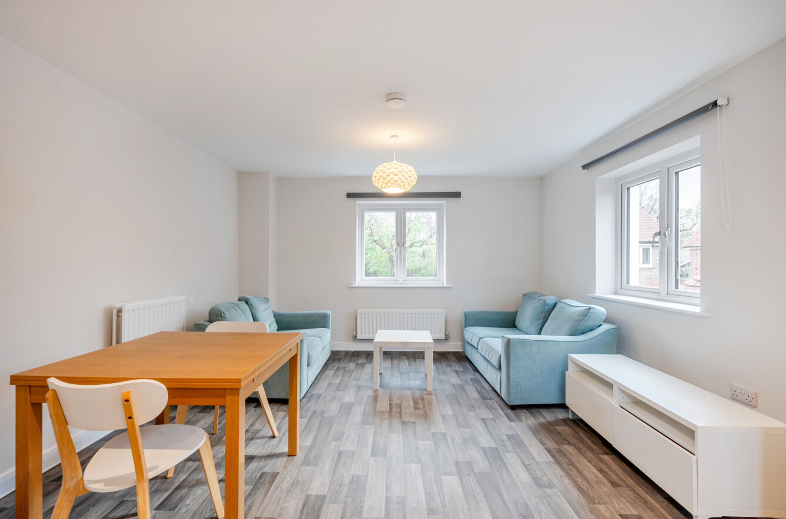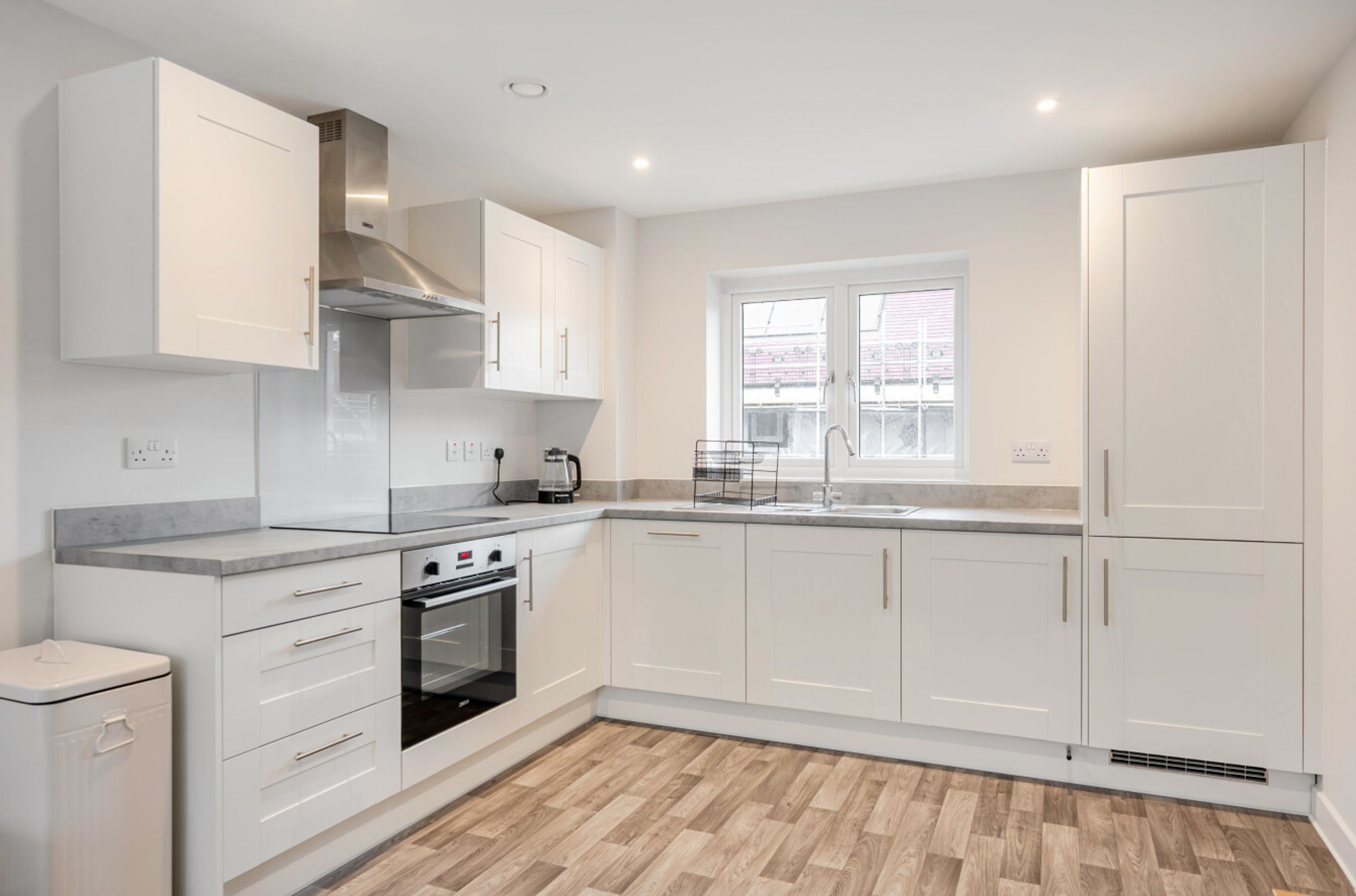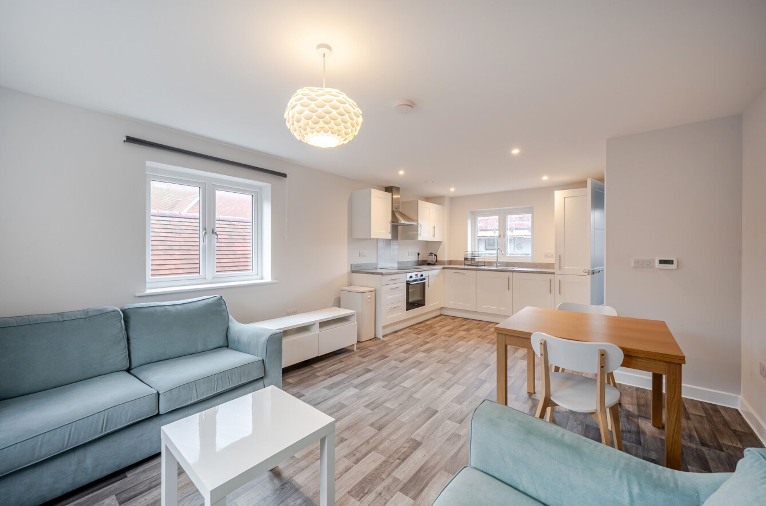 Featuring a spacious open-plan living area with dual-aspect windows. The kitchen is fitted with integrated appliances including an oven, hob, hood, dishwasher and fridge freezer.