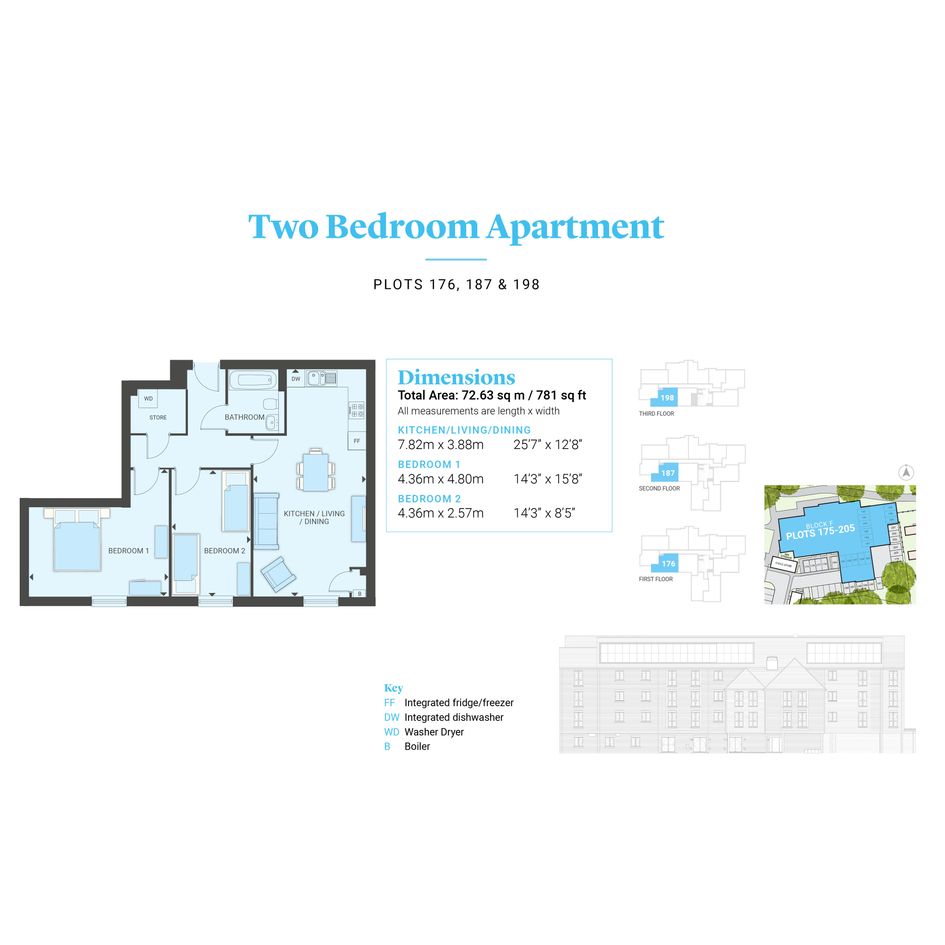 Spread across 781 sqft, the apartment includes an open-plan kitchen/living area with integrated appliances and a freestanding washer/dryer, with allocated parking and cycle storage.