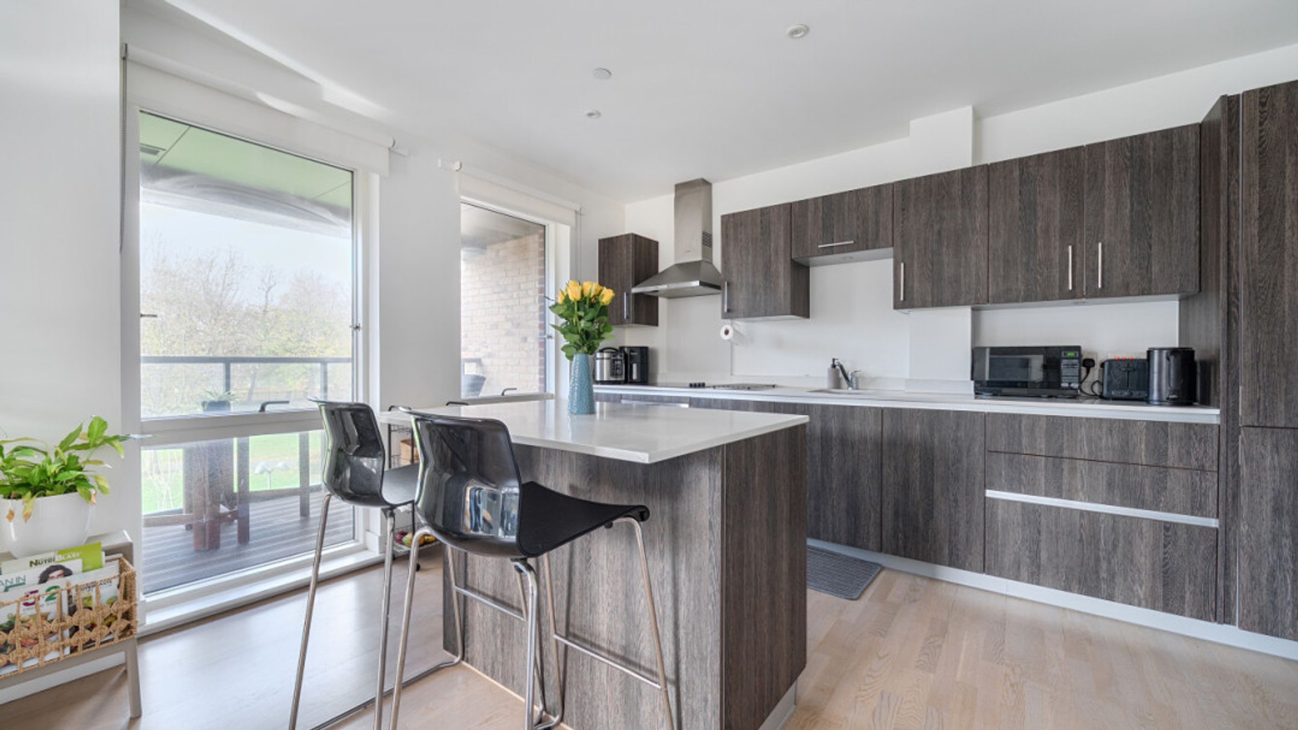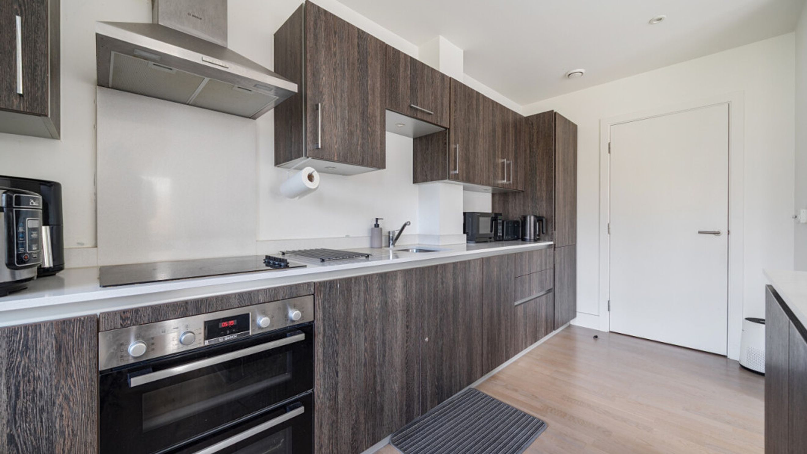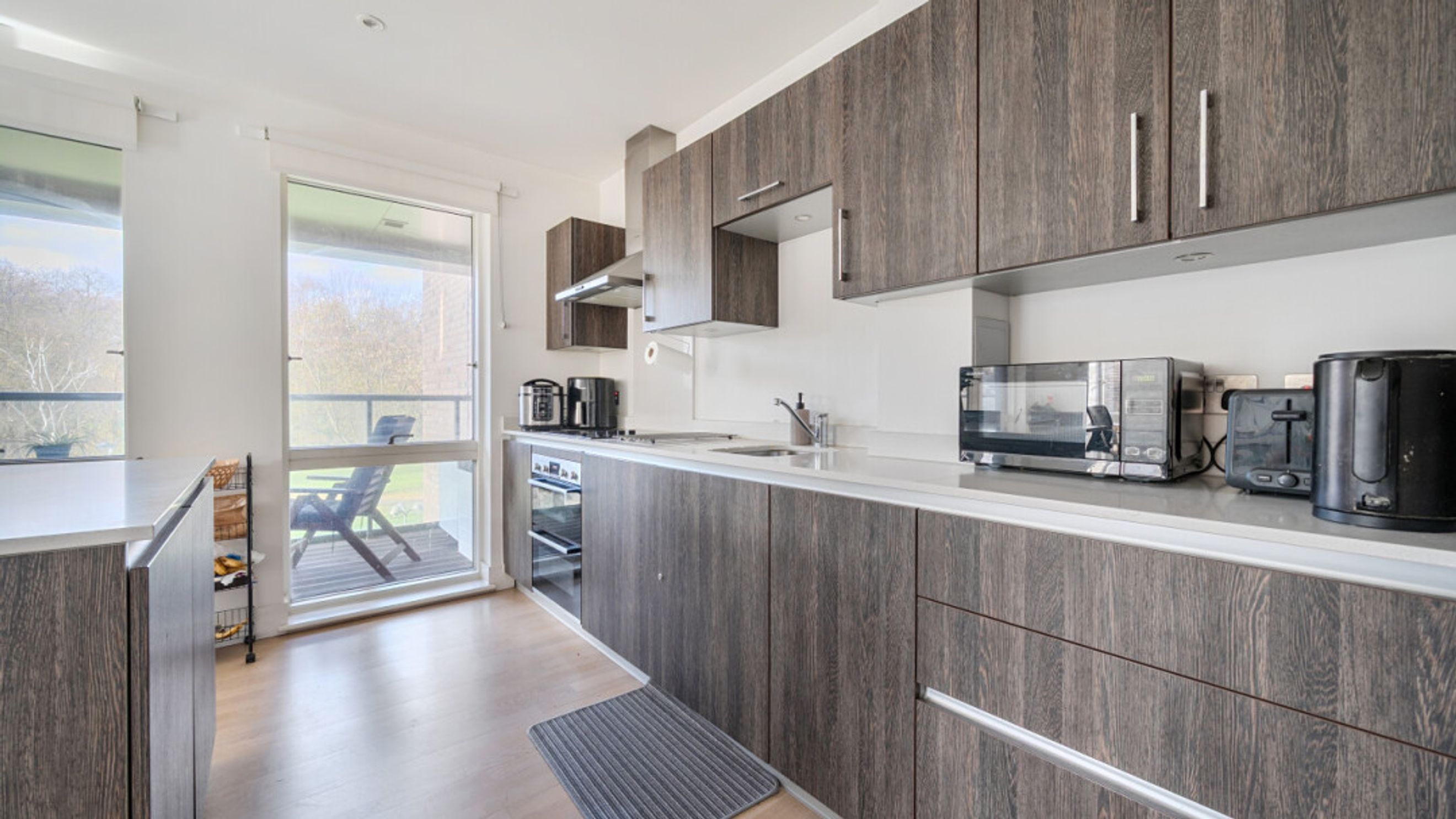 This apartment consists of an open-plan kitchen and living area, flooded with natural light from floor-to-ceiling windows, opening onto a private balcony. The kitchen is fitted with oak effect wall and base units, with stylish under-cupboard lighting, and a white gloss work surface and benefits from integrated appliances including a fridge freezer, double oven, hob, and extractor fan. There are 2 double bedrooms, the first bedroom has built in storage and an en-suite and the contemporary bathroom comes complete with a white three-piece suite with a shower over the bath. The apartment also has a walk in storage/utility cupboard.