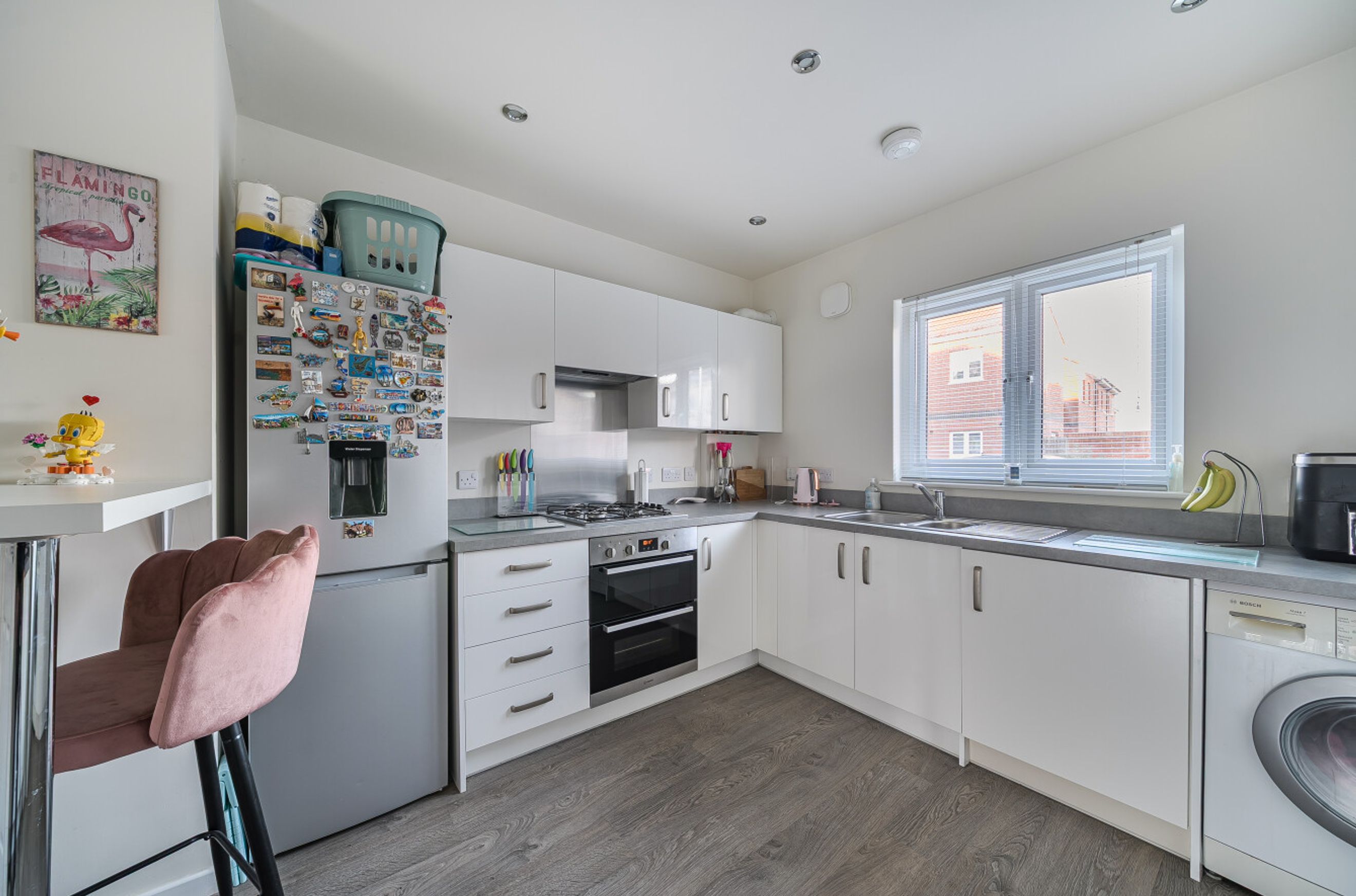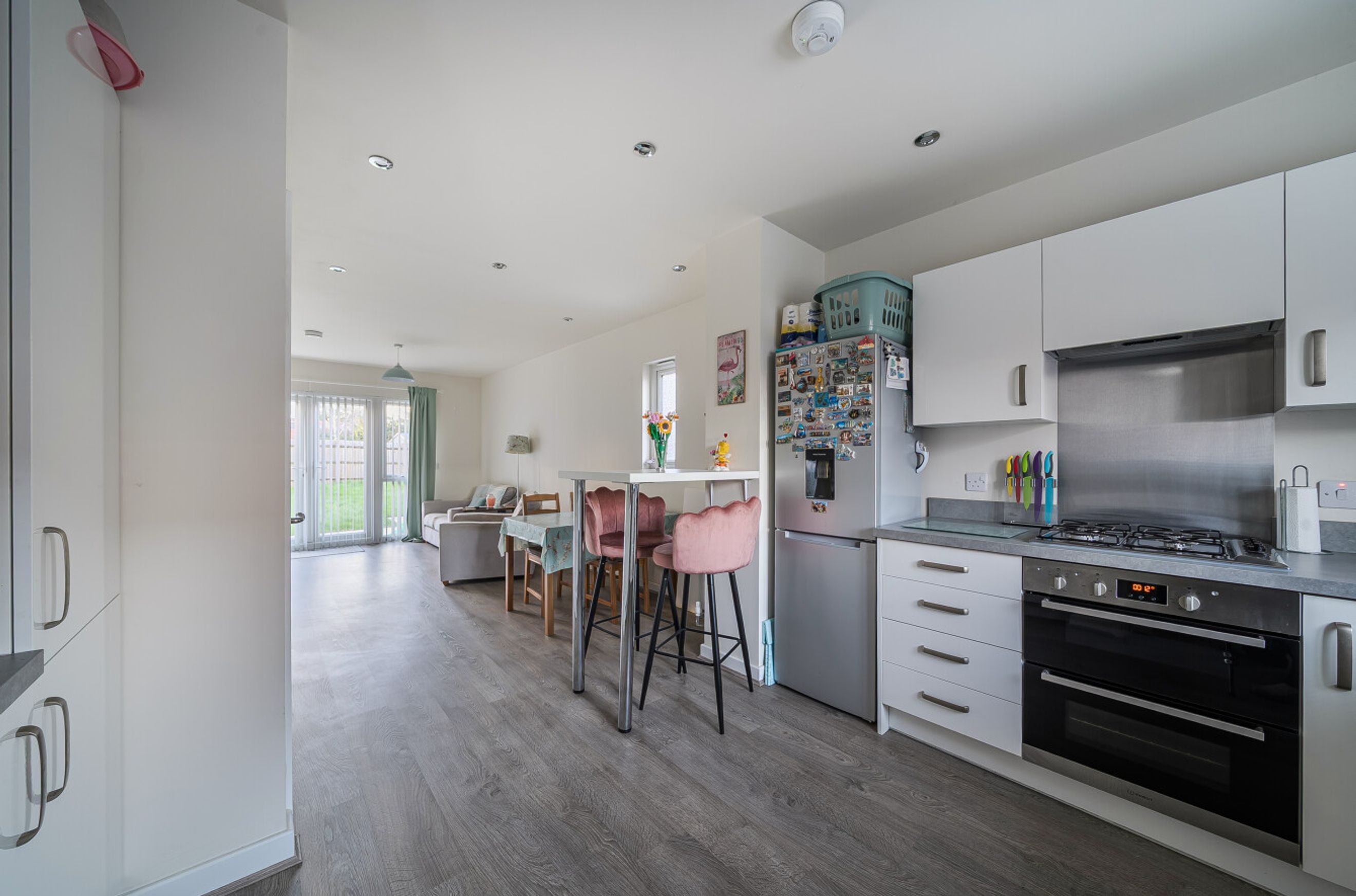 Featuring an open-plan living area with doors to your back garden. The kitchen is fitted with an integrated oven, hob and hood. On this floor, you'll also find a WC.
