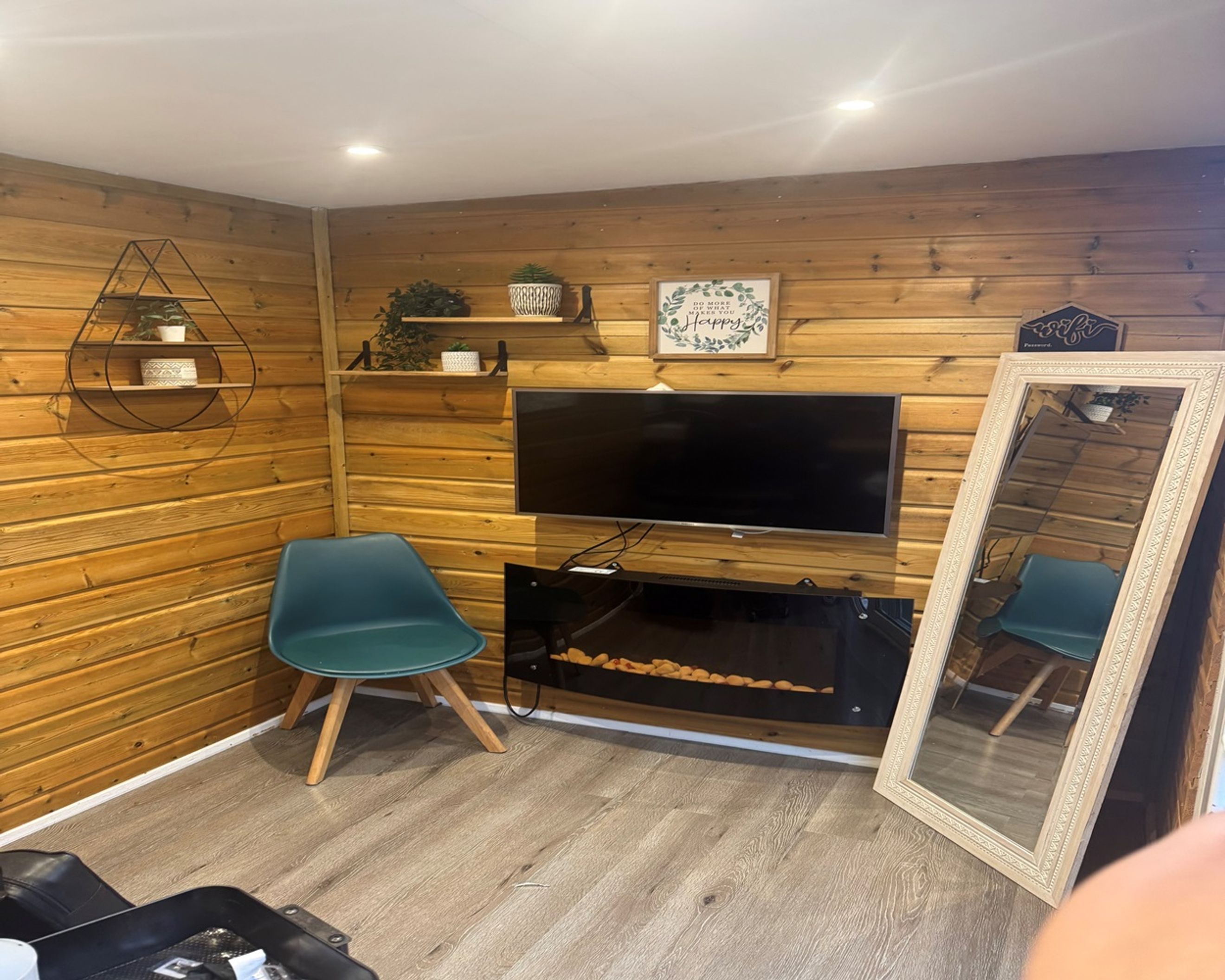 A log cabin fully insulated office with electric and sink added in the garden to work from home or use as another bedroom.