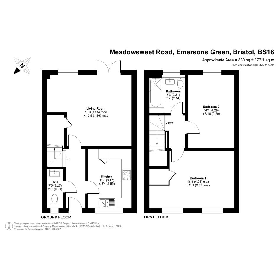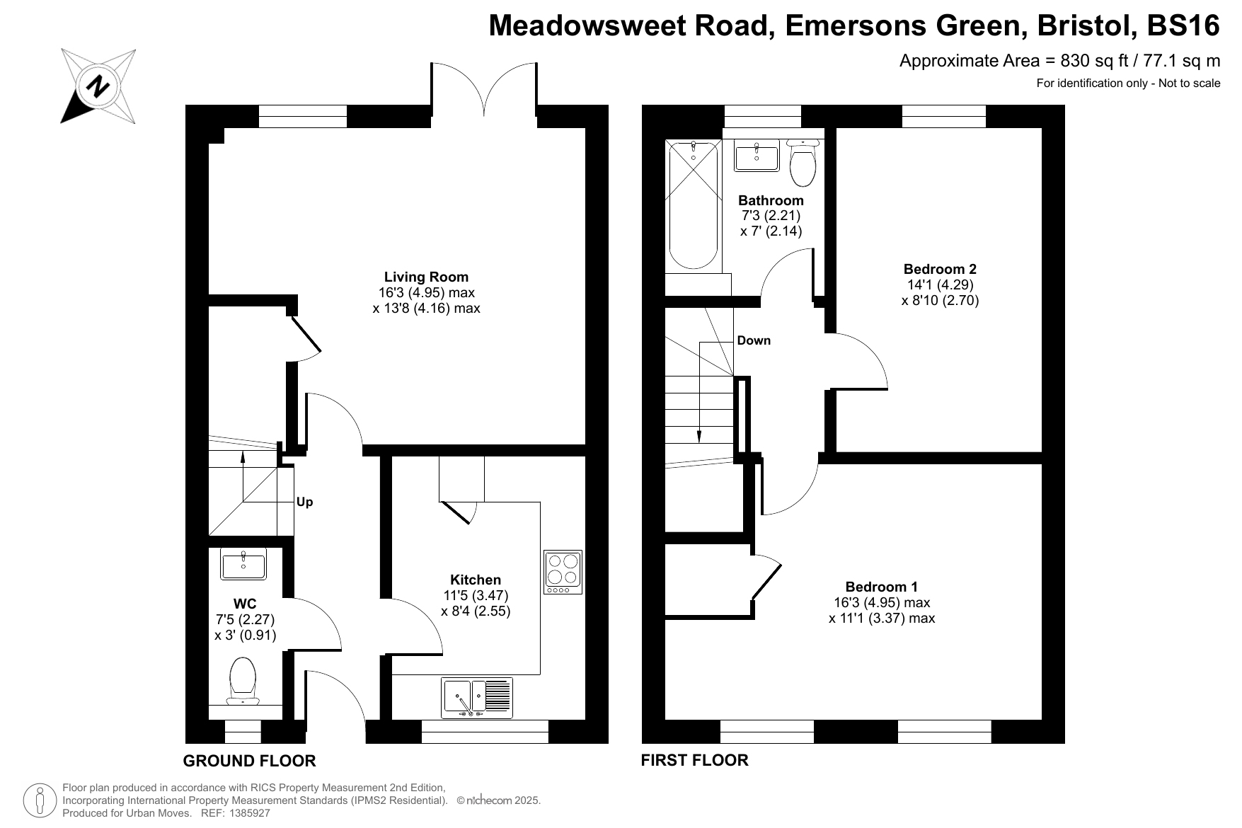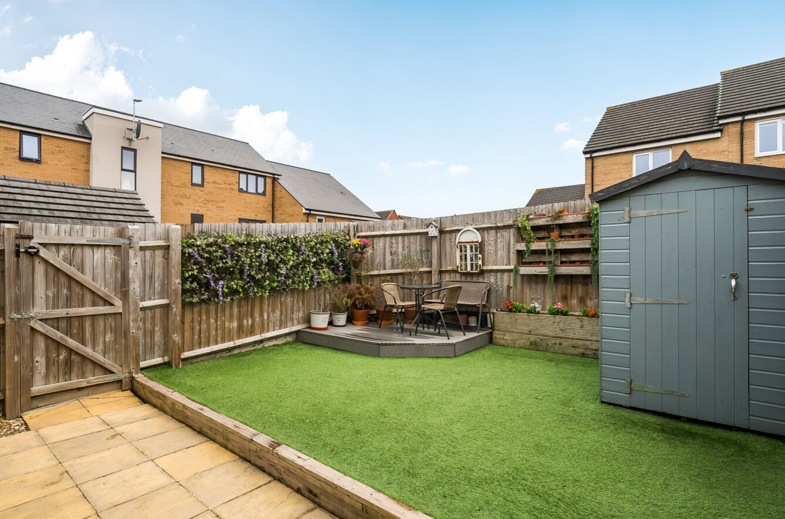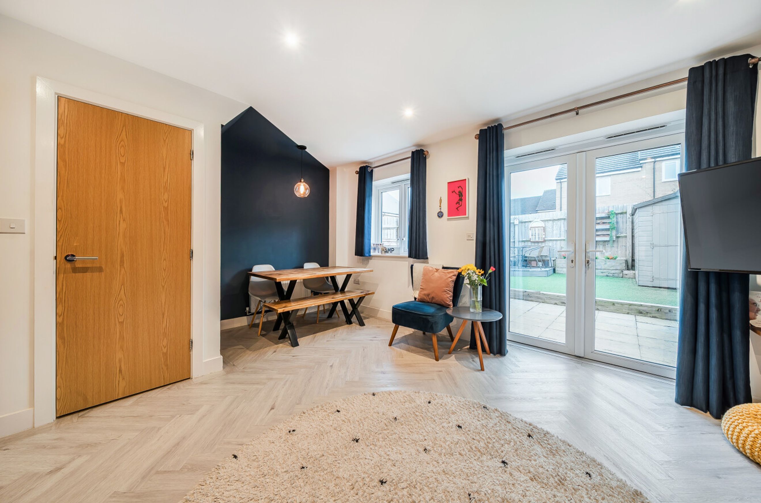 This smartly-presented property forms one end of a short, three-house terrace in the Lyde Green/Emersons Green suburb of Bristol. There is a cloakroom/WC just off the entrance hall, a spacious kitchen and a reception room with patio doors that open onto the south-east-facing rear garden. Hall, kitchen and reception all feature attractive, herringbone flooring. Upstairs, on the first floor of the house, is a full-width main bedroom plus a generously-sized second bedroom and stylish, naturally-lit bathroom. Well insulated walls, roof and floor, high performance glazing and a modern gas central heating system all contribute towards a very good energy-efficiency rating. The house comes with an allocated, off-street parking space and the city centre can also be easily reached via bus from nearby Willowherb Road. Junction 19 of the M4 is only a ten minute drive away (Google Maps estimate), if travelling further afield.