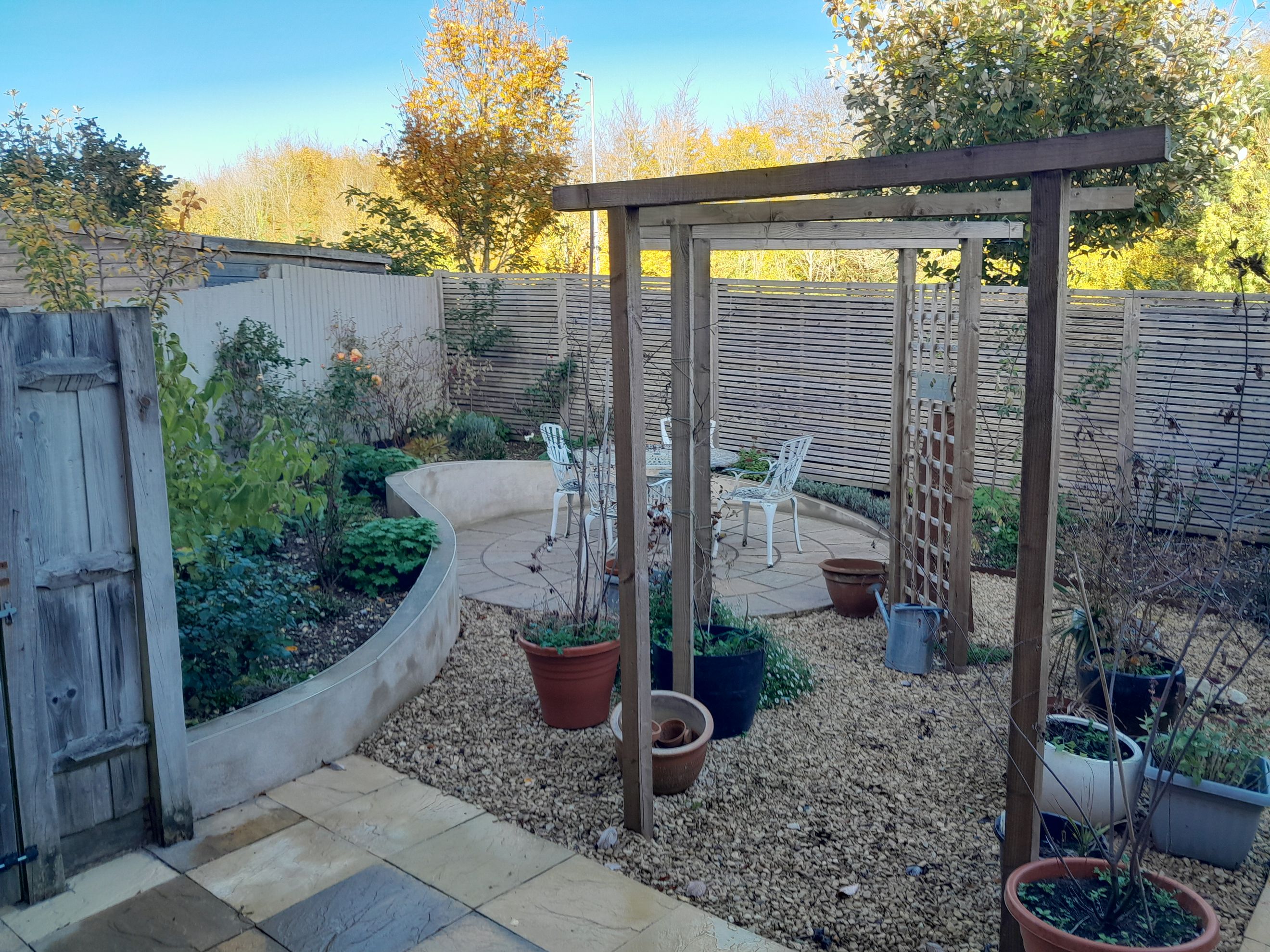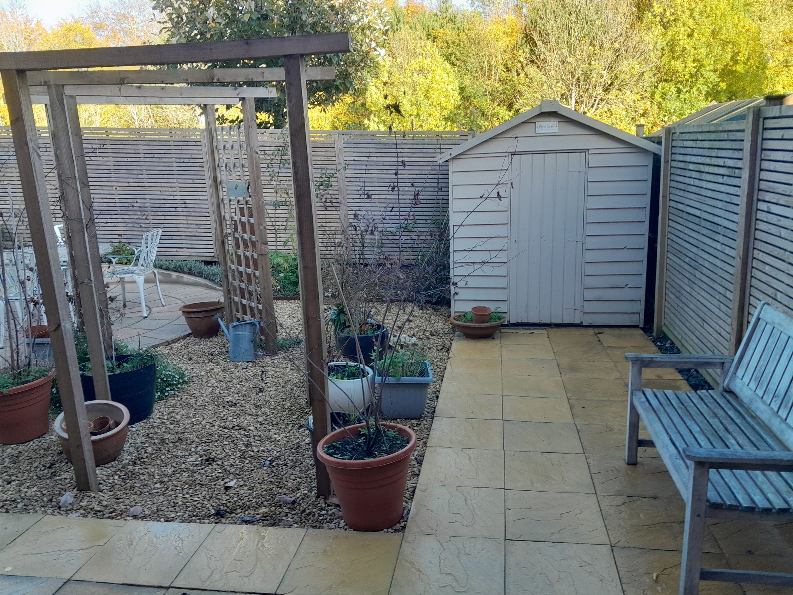 Good sized private garden, landscaped for low maintenance. Garden shed.