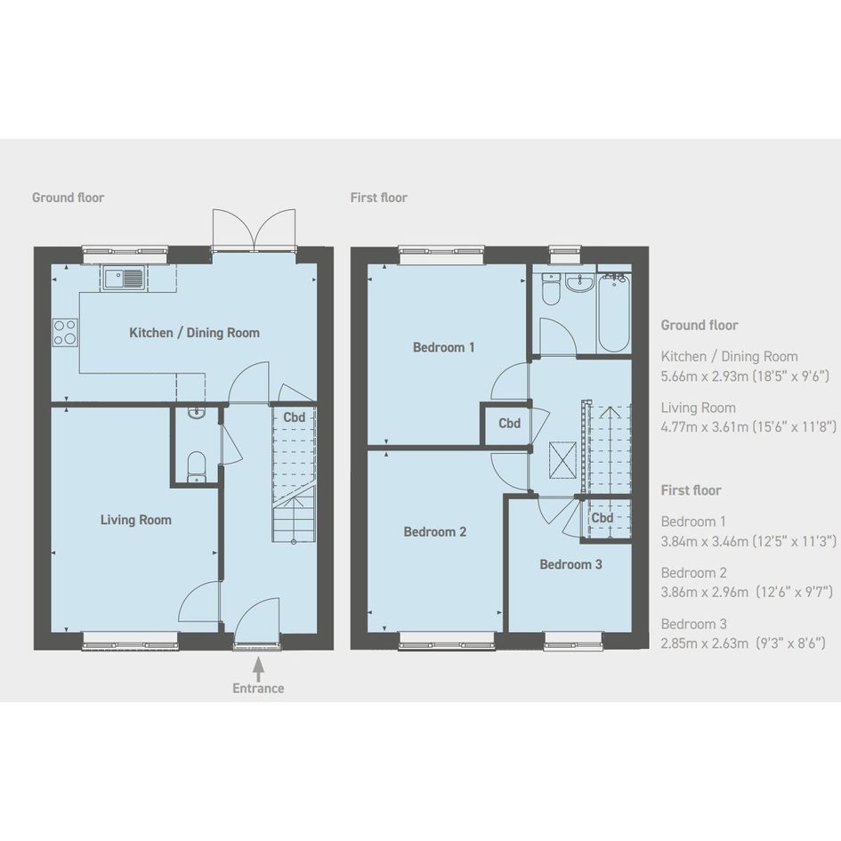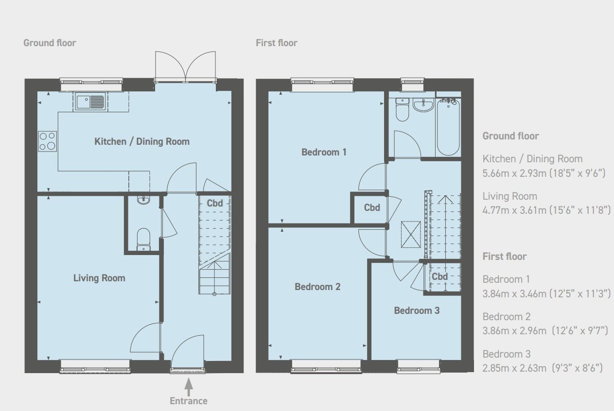 The three bedroom houses feature a long entrance hall with an under-stairs cupboard, a living room, a kitchen/dining room and a cloakroom with WC and hand basin.