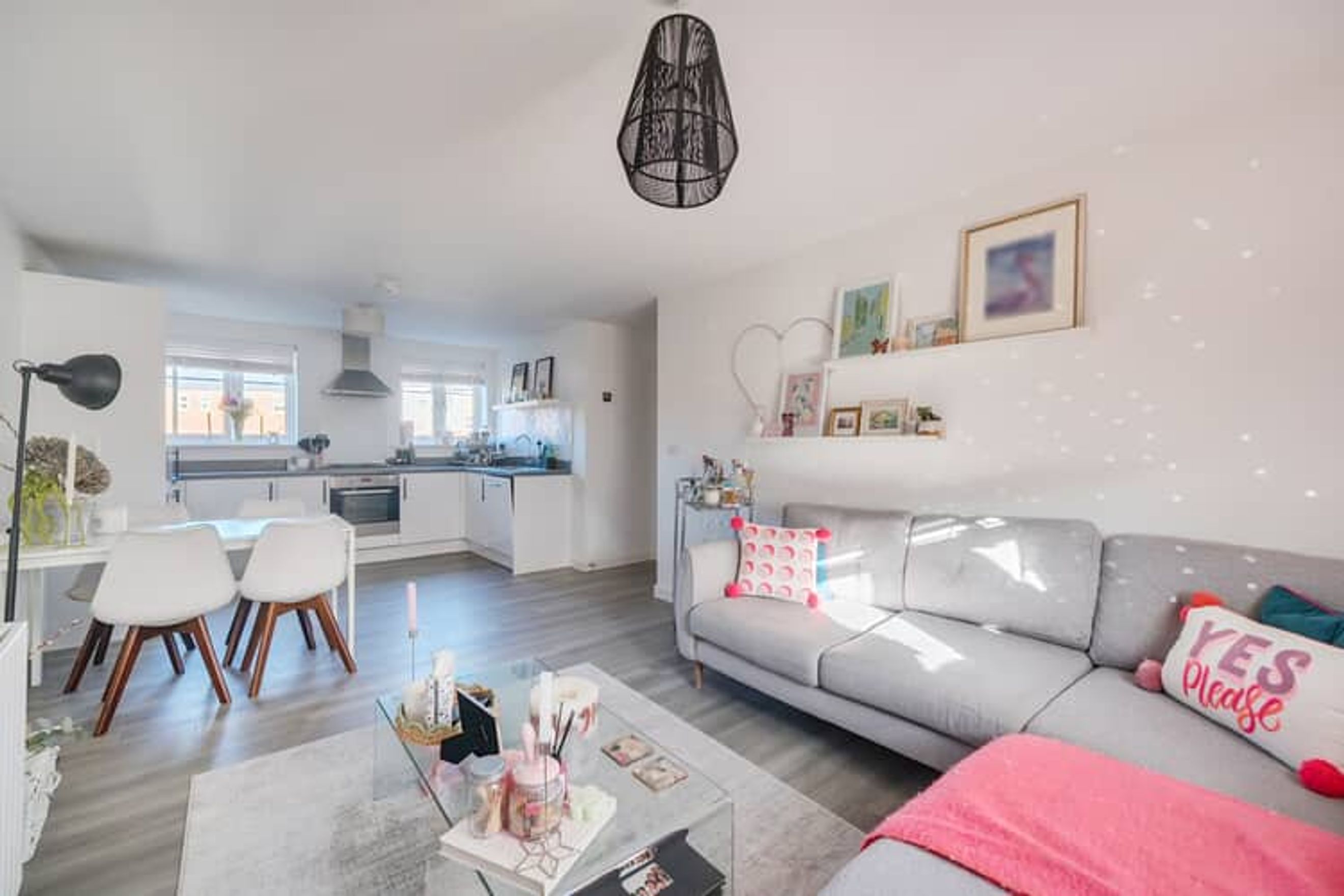 The property on the first floor comprises an entrance hall with storage cupboards, a spacious living room with a modern open-plan kitchen, two good-sized bedrooms (one en-suite) and a bathroom.