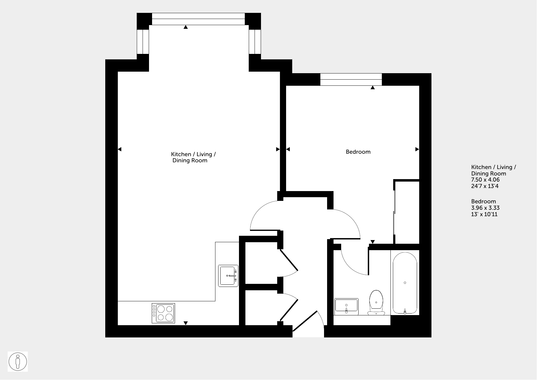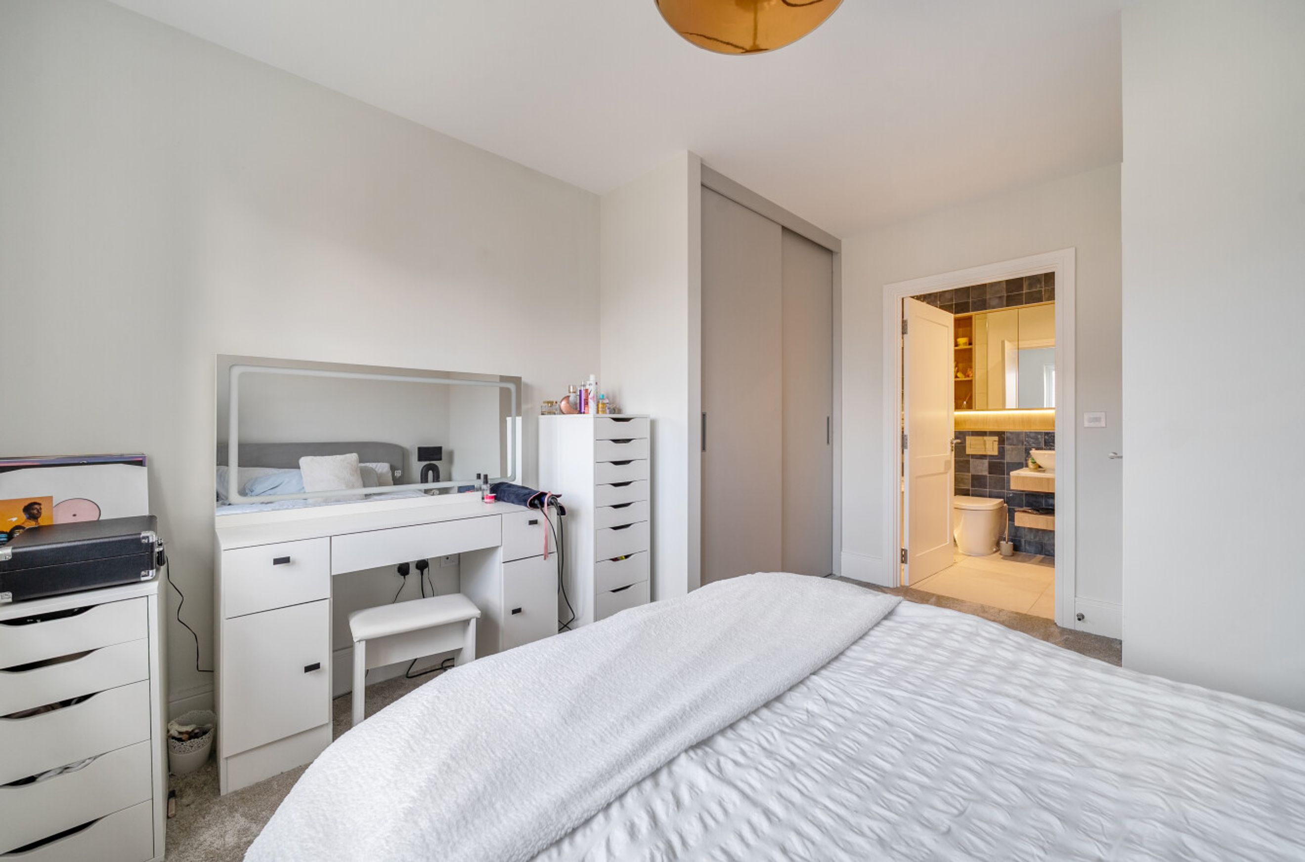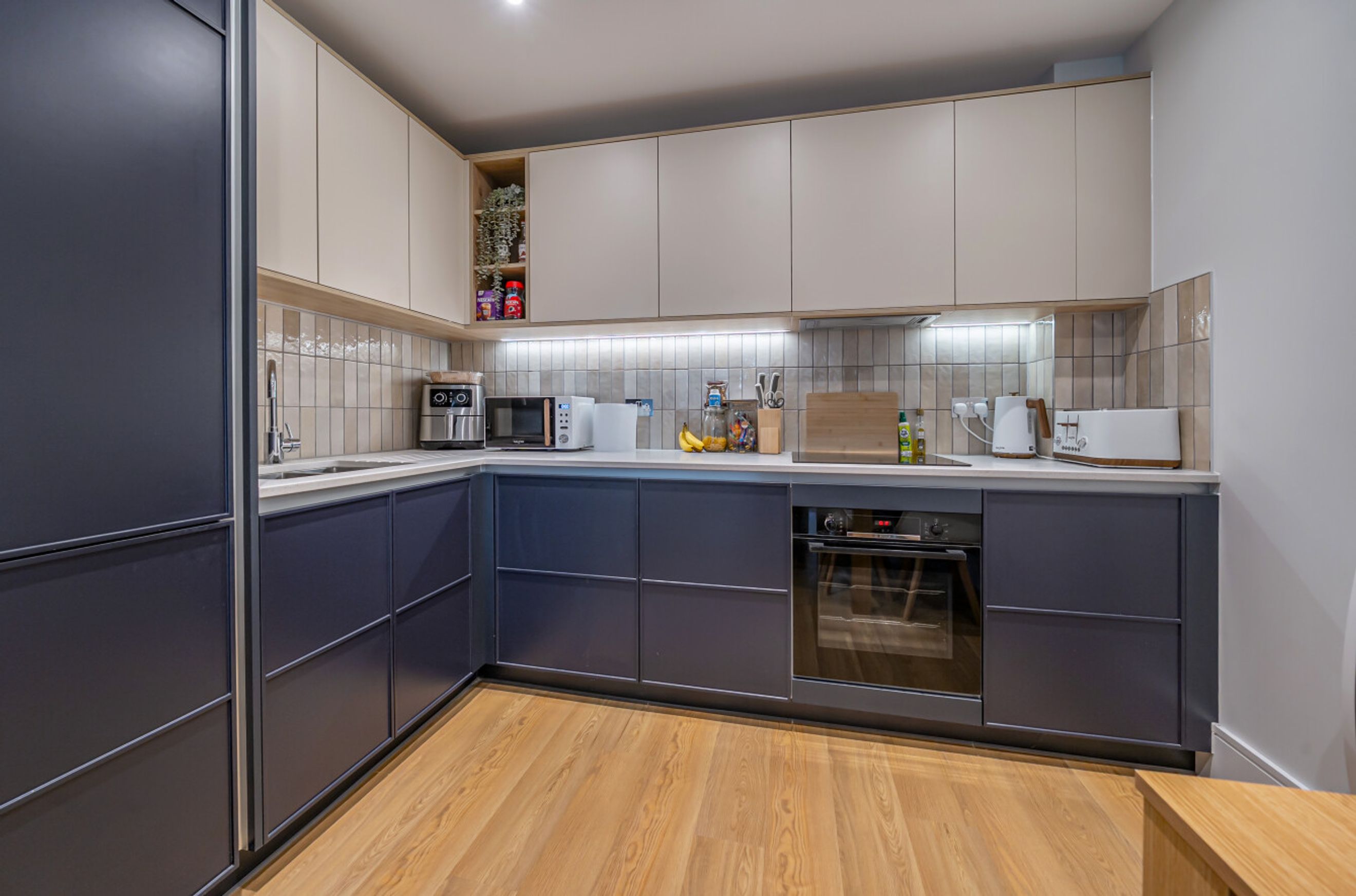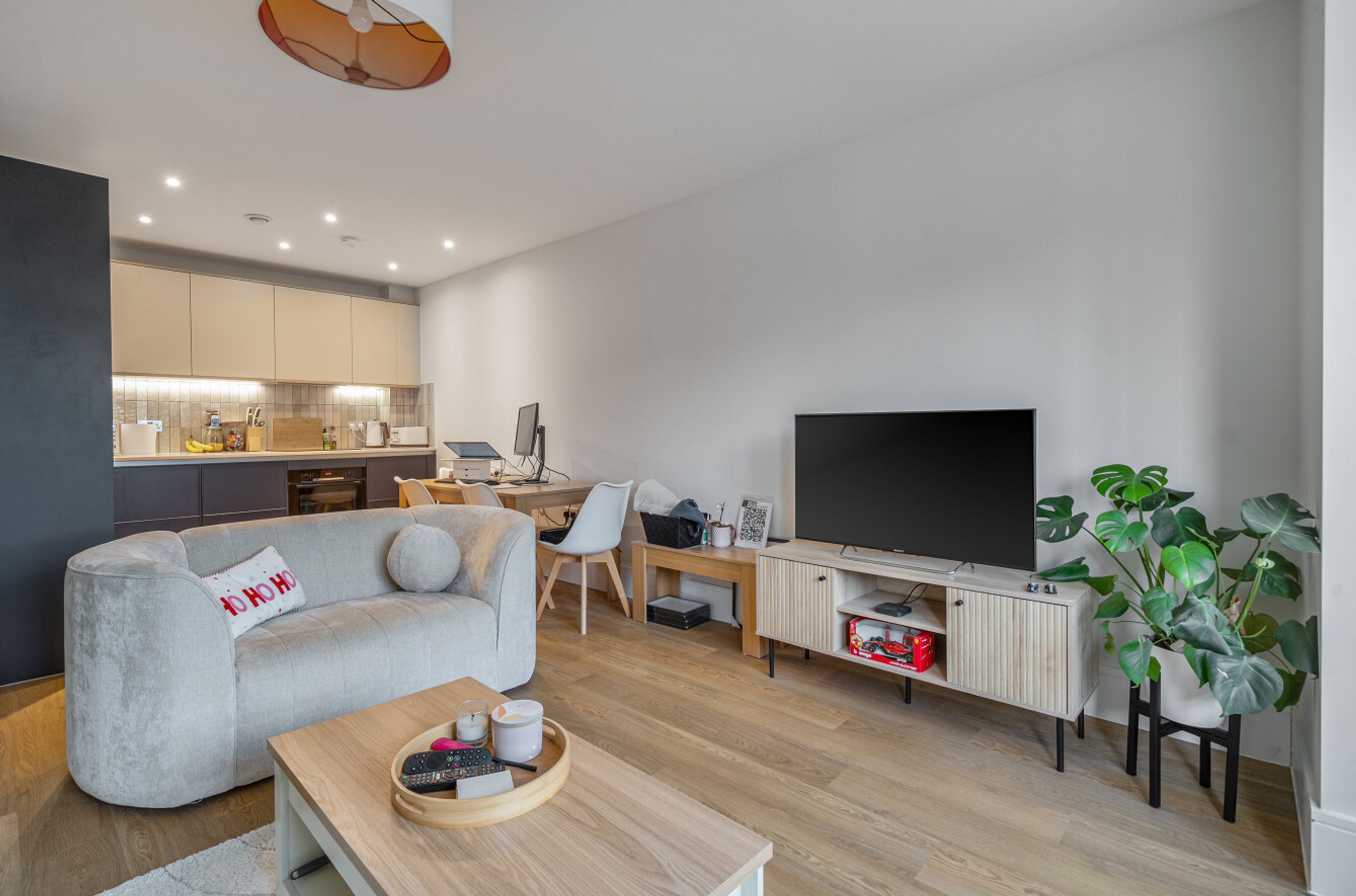 Featuring an open-plan living area, with a bay window. The modern kitchen has an integrated oven, hob and hood.