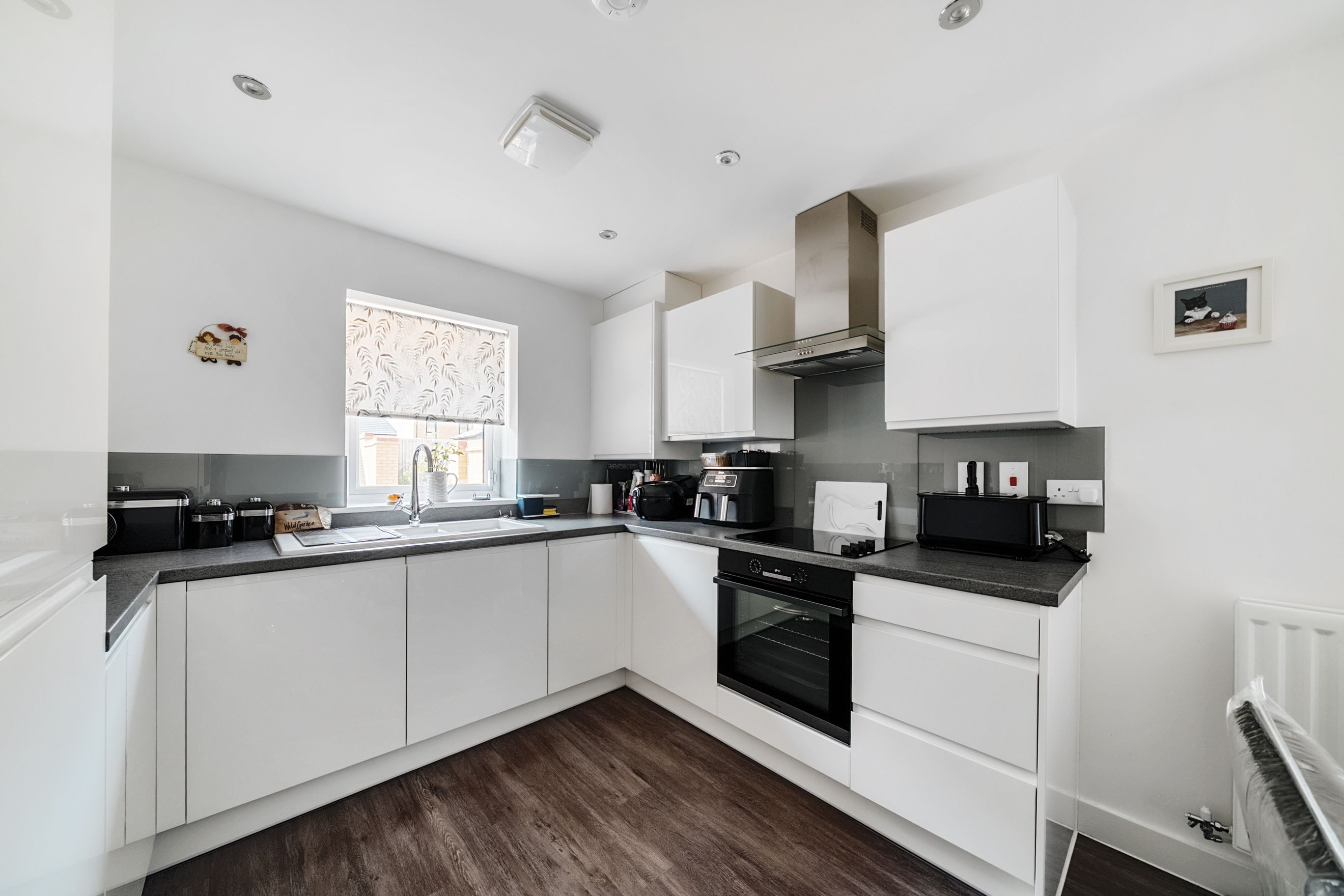 The ground floor welcomes you with a bright, airy reception room stretching across the rear of the property, enjoying direct access to the garden—perfect for relaxing or entertaining. At the front, the contemporary kitchen provides ample workspace, modern fittings and plenty of room for day-to-day cooking and dining. A central hallway links the spaces seamlessly and includes a useful cloakroom and understairs storage.