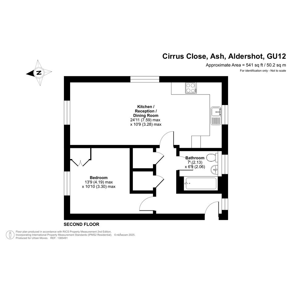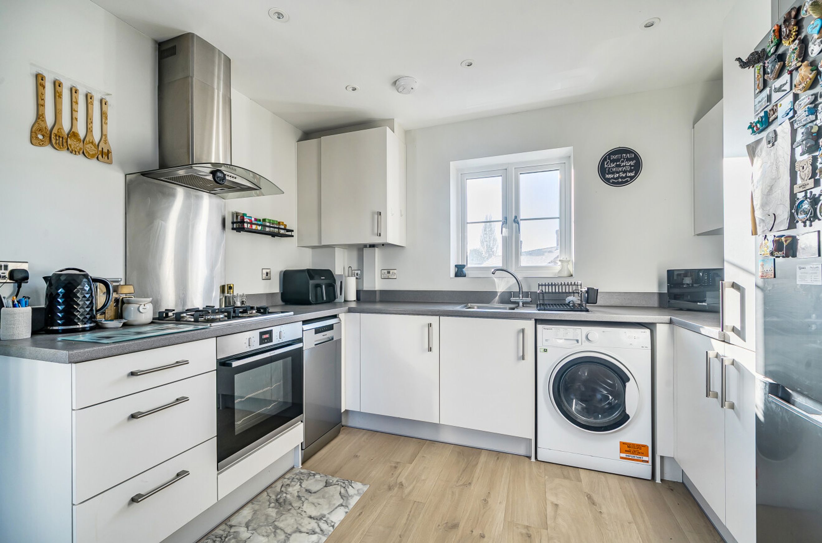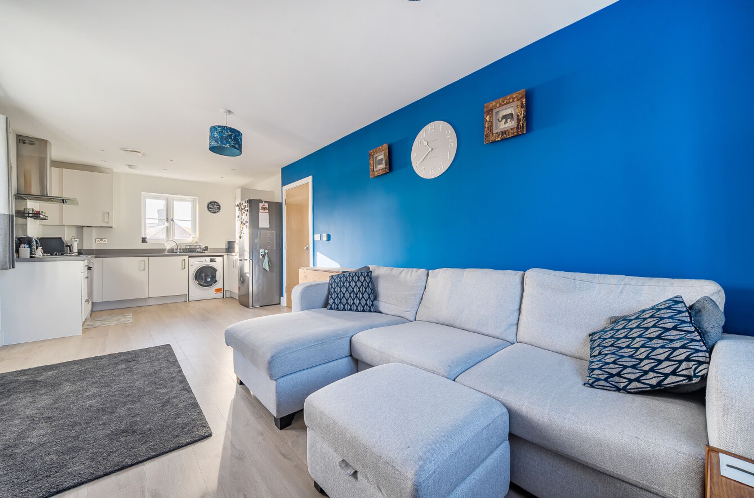 This smartly-presented flat is on the top (second) floor and has an approximately twenty-five-foot reception room with attractive flooring, a spacious, open-plan kitchen area and windows on three sides. The bedroom is a good-sized double and includes a fitted wardrobe. A pair of built-in storage/utility cupboards have been provided in the naturally-lit entrance hallway and the bathroom is simple, stylish and modern. The block is part of a recently-constructed development. Well insulated walls and roof, high performance glazing and gas central heating have resulted in very good energy-efficiency ratings. The flat comes with use of an allocated parking space and is also within walking distance, or brief cycle ride, of Ash Railway Station.
