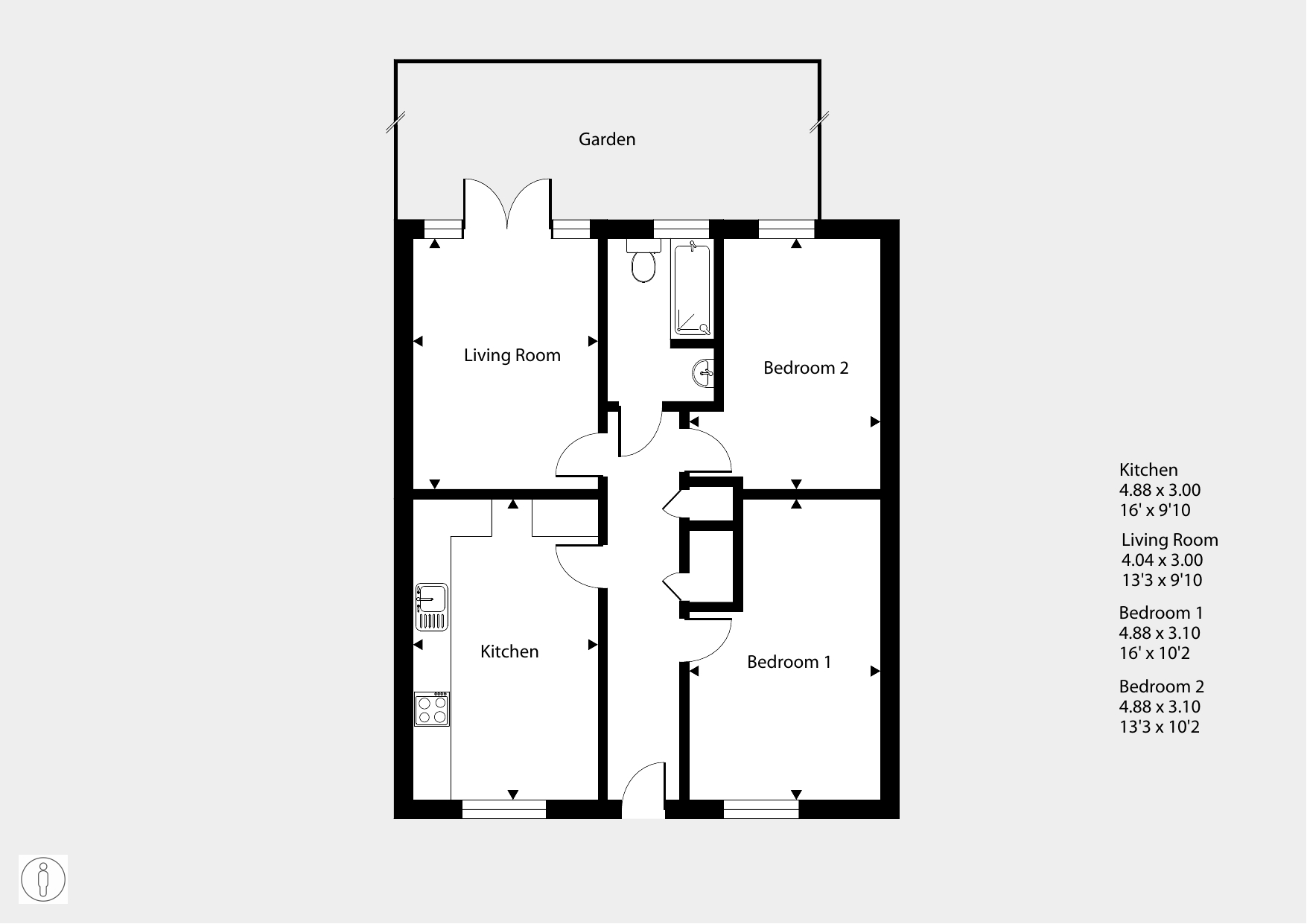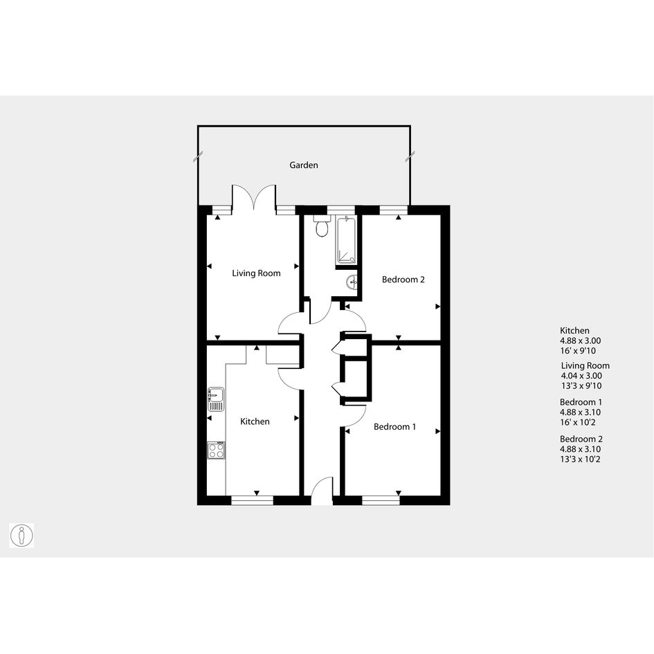 Featuring a spacious living area, with doors to your garden. The kitchen has an integrated oven, hob and hood. There are two comfortable bedrooms. The bathroom has a white suite.