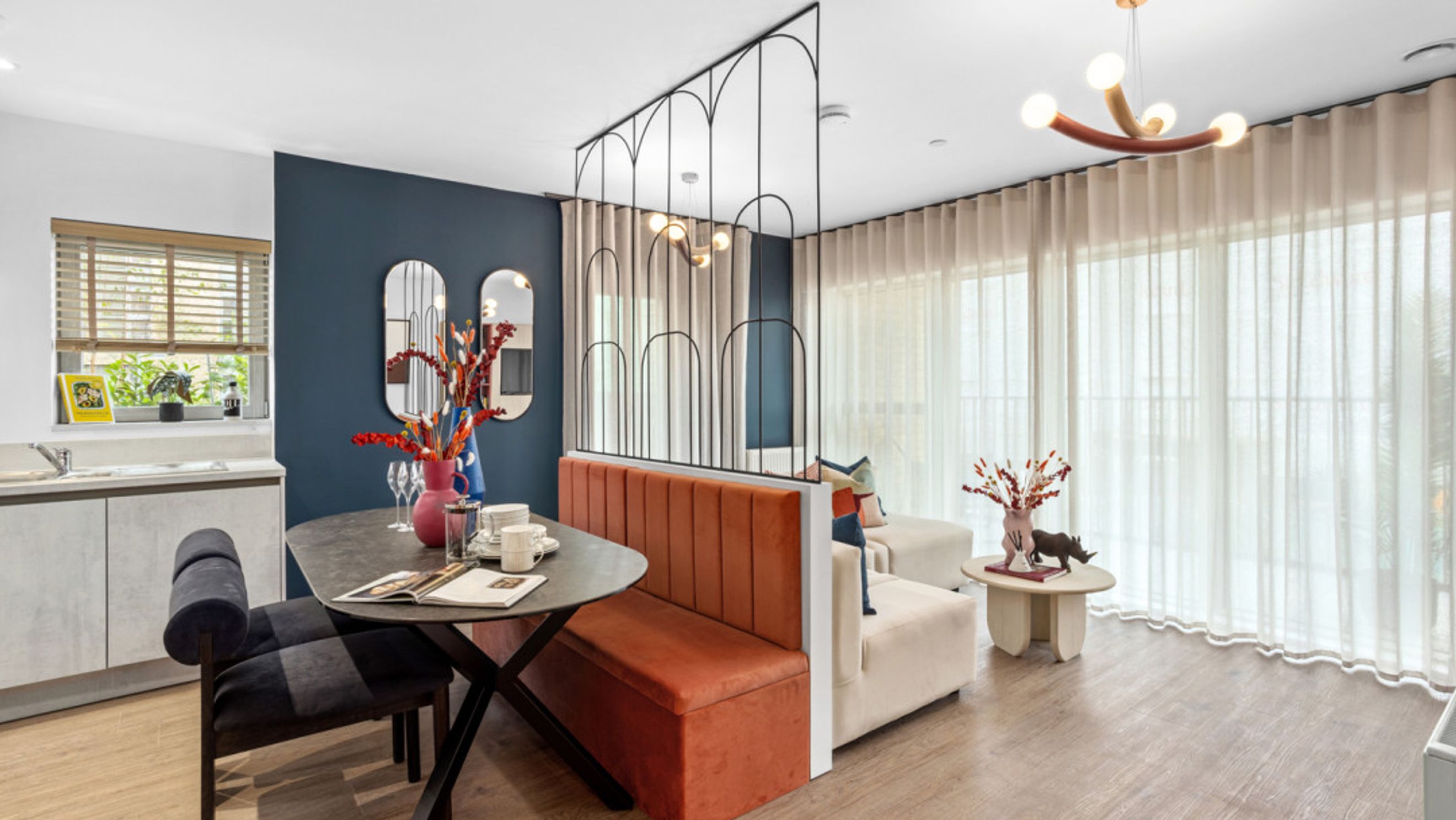 * Integrated appliances including oven, ceramic hob, fridge/freezer, dishwasher and extractor
