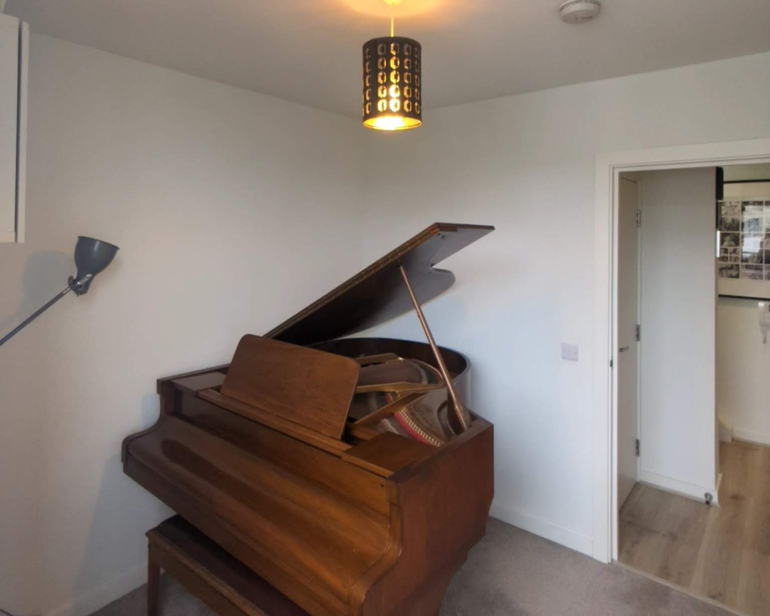 The home is arranged over two levels and offers generous space throughout. The lower level comprises a welcoming hallway leading into a bright open-plan living and kitchen area, designed to highlight natural light and provide a practical and comfortable space for everyday living. The kitchen comes fitted with modern integrated appliances, ensuring a sleek and functional layout. Also on this floor is a flexible study/fourth bedroom and a convenient WC.