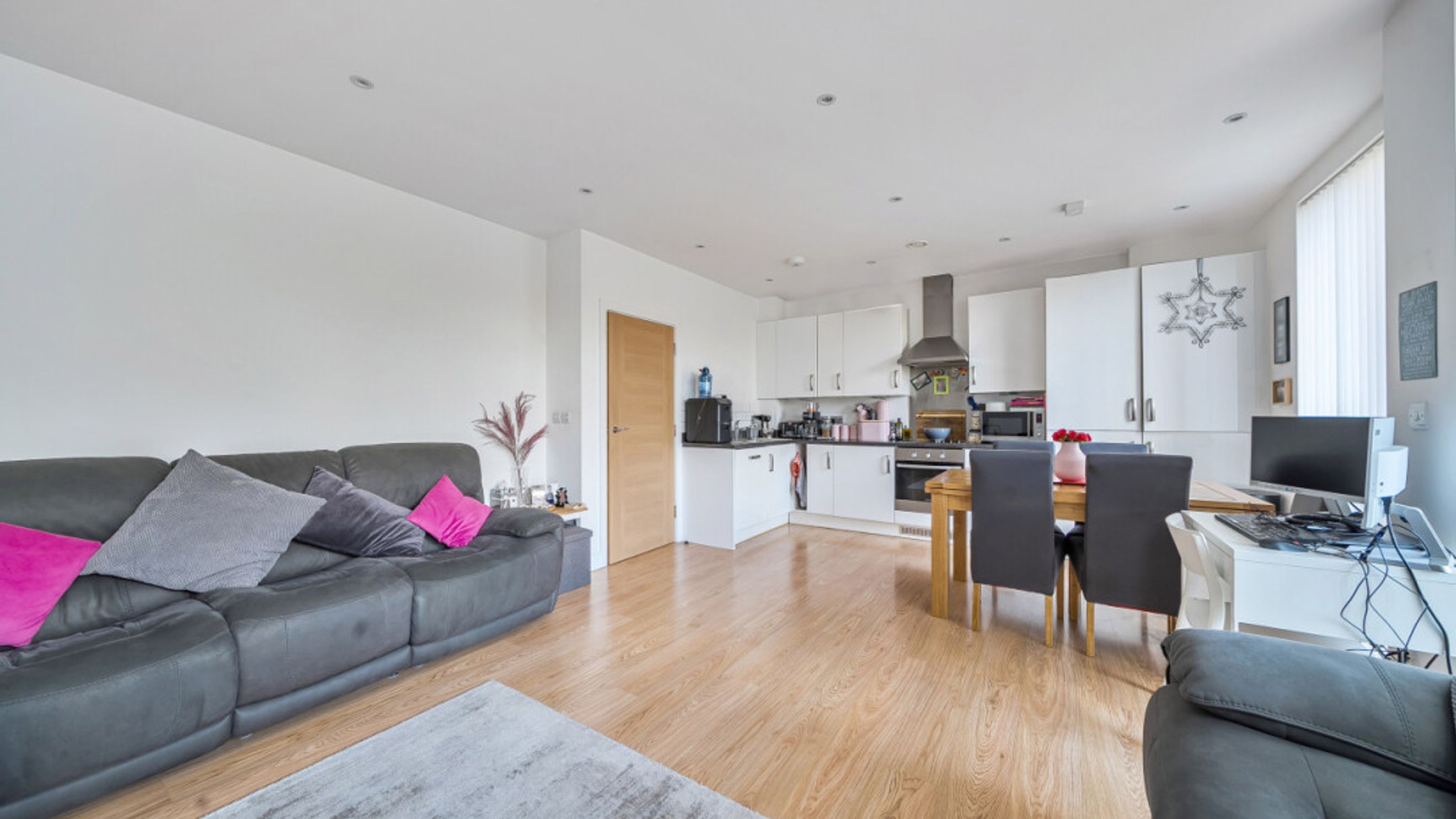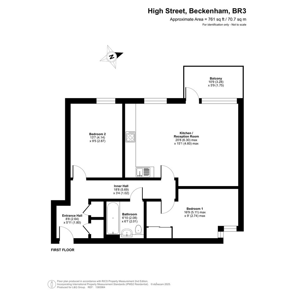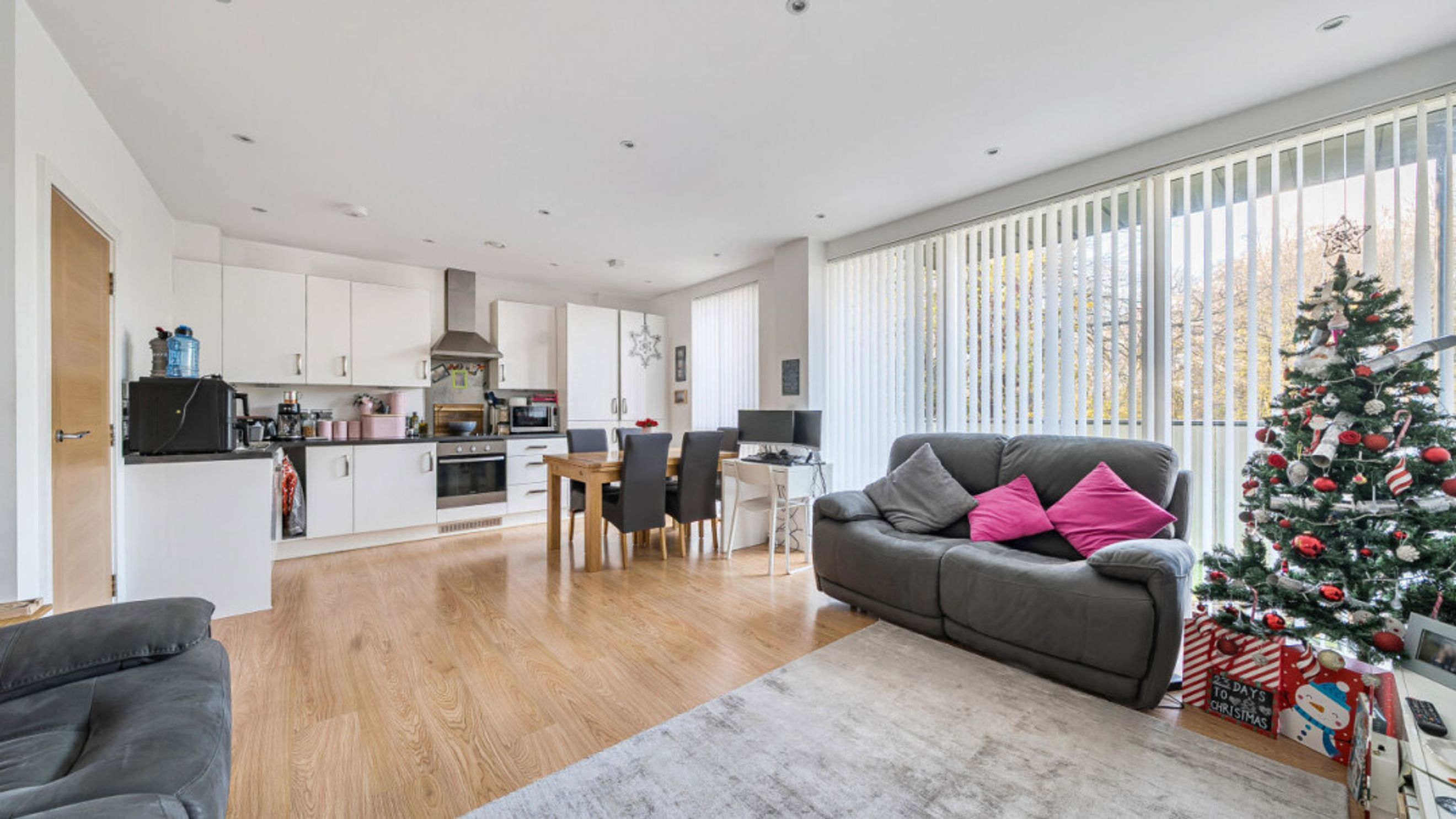 This bright and spacious well presented dual aspect first floor apartment consists of a stylish open-plan kitchen and living area, flooded with natural light from wide floor-length windows and door to a private west facing balcony. There are two well proportioned double bedrooms, one west facing and the second, east facing, with built in storage. A modern family bathroom completes the accommodation