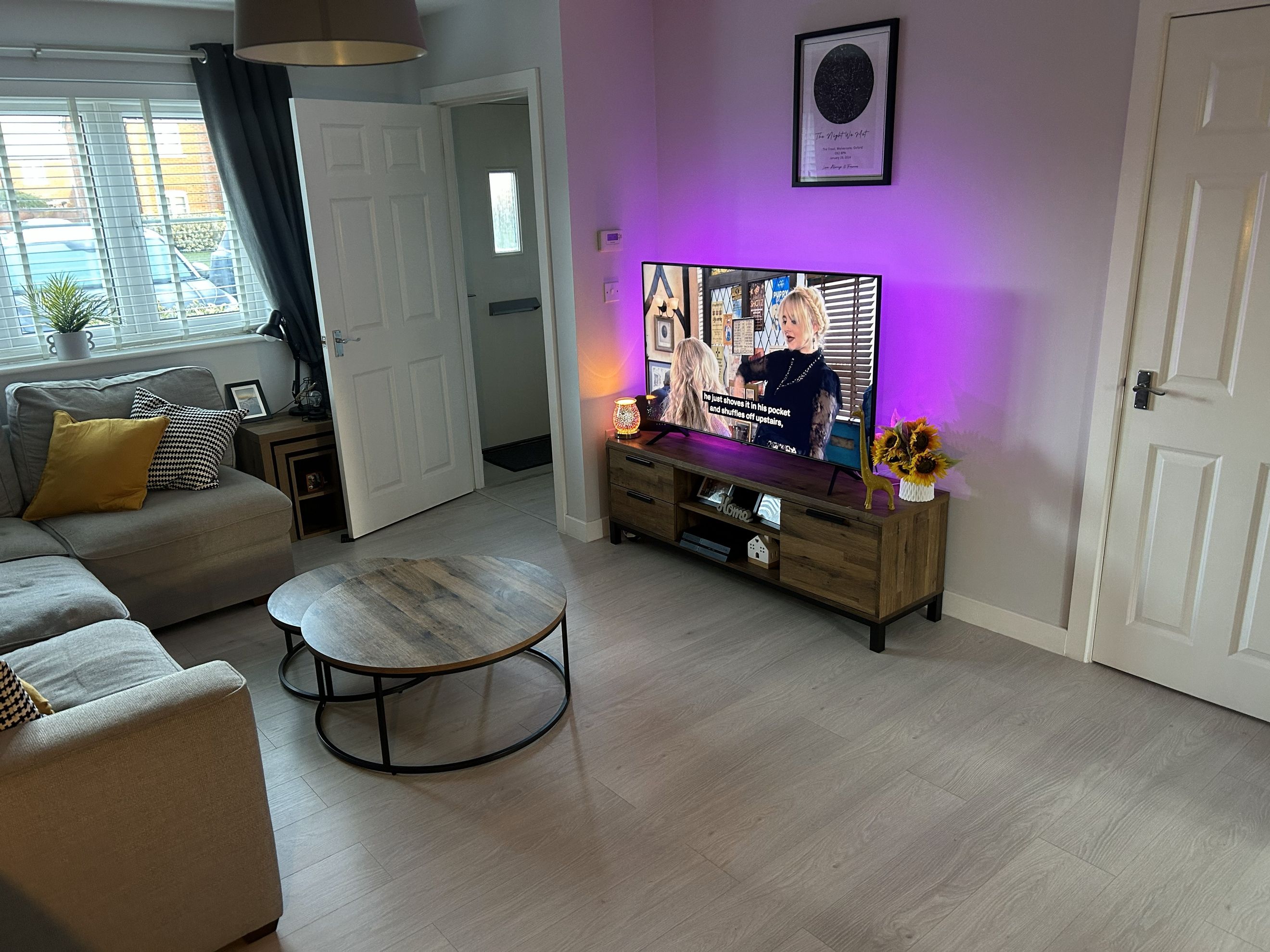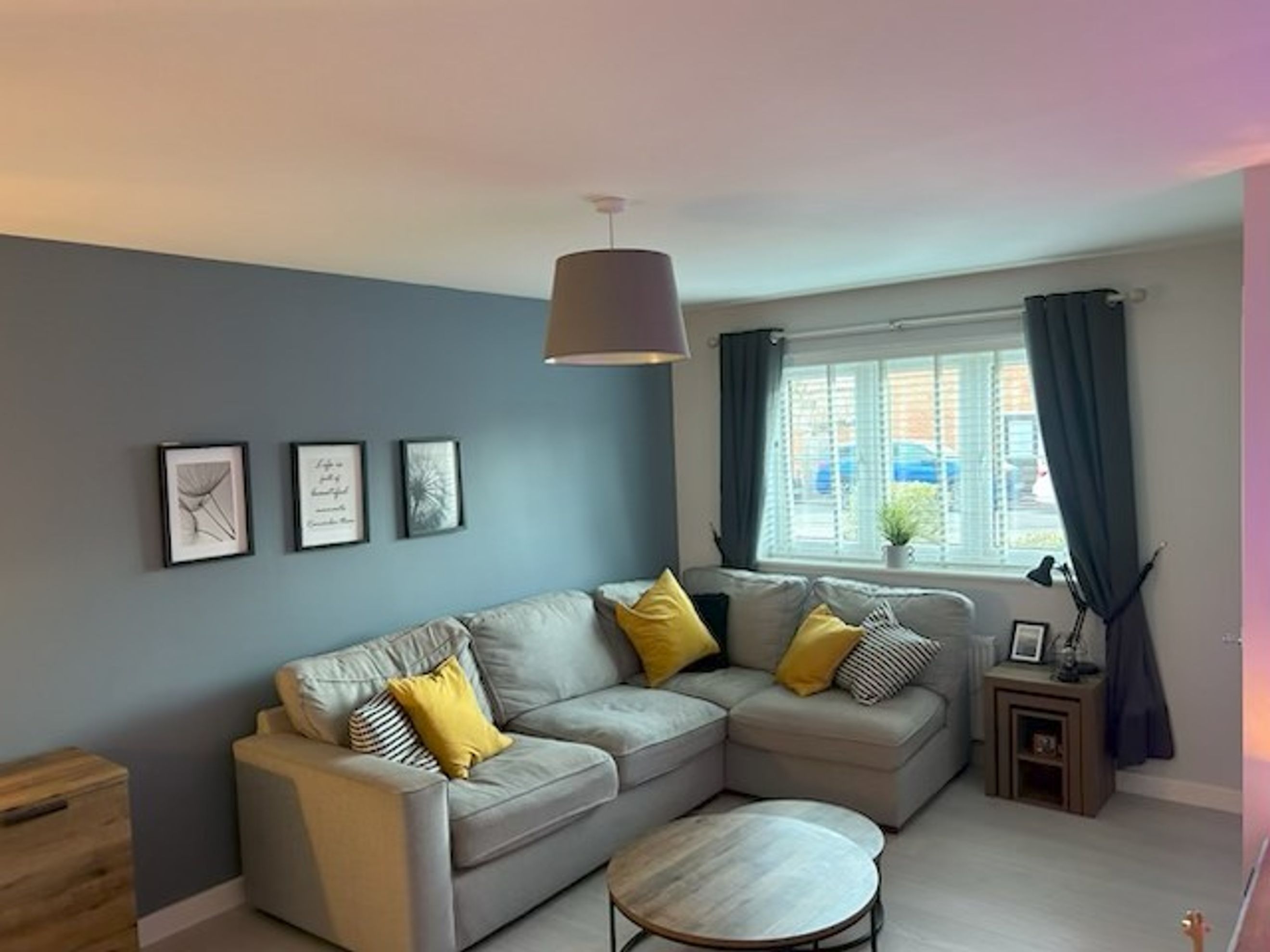 The property features an entrance hall leading into a spacious lounge at the front of the property, where you will also find a large storage cupboard. The kitchen is contemporary fitted and opens with double patio doors directly onto the enclosed rear garden with an extended patio area — ideal for entertaining or relaxing.
