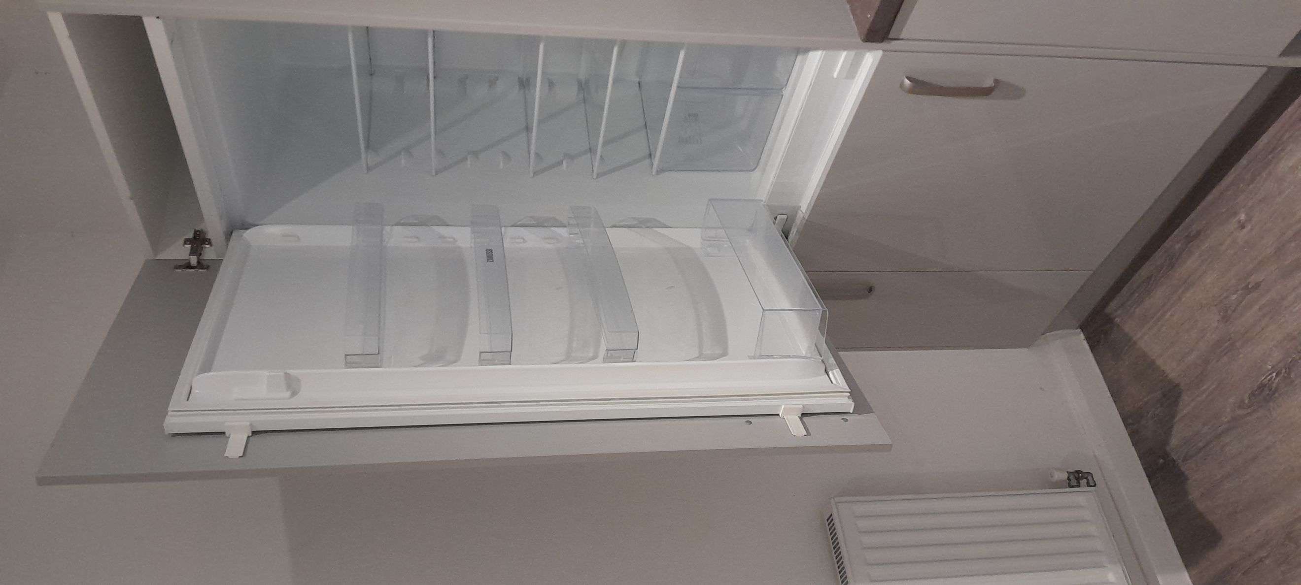 Built in cooker, fridge/freezer.