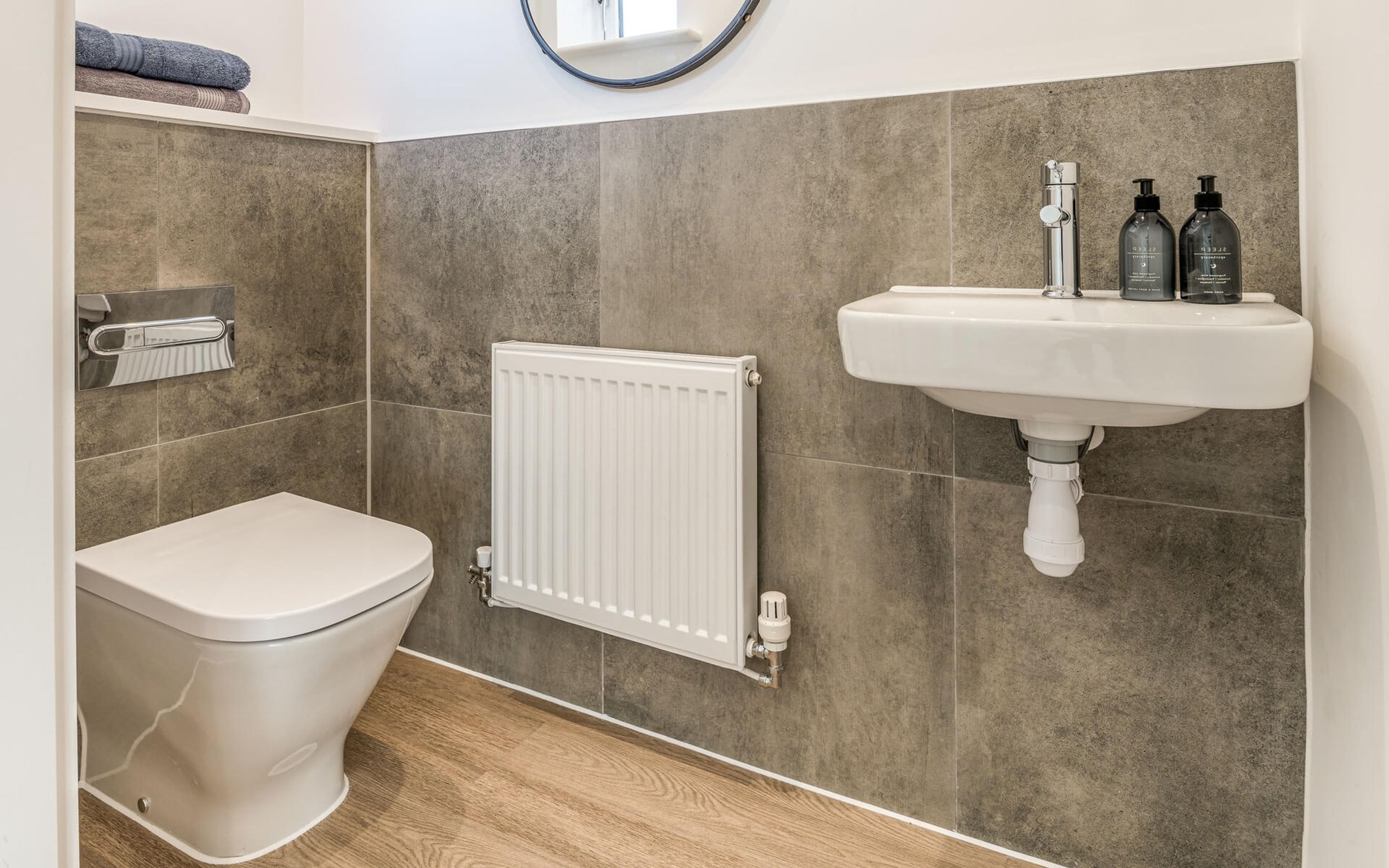 On the ground floor, the entrance door opens into a spacious living/dining area with large windows to the front. This bright and welcoming space is ideal for both relaxing and entertaining, with convenient under-stairs storage cupboard ensuring everyday essentials can be kept neatly out of sight. The L-shaped kitchen can be found to the rear, complete with integrated appliances including a fridge/freezer, oven, hob, exposed extractor, as well as dedicated washing machine space. From here, enter the lobby for access to the rear garden and guest cloakroom.