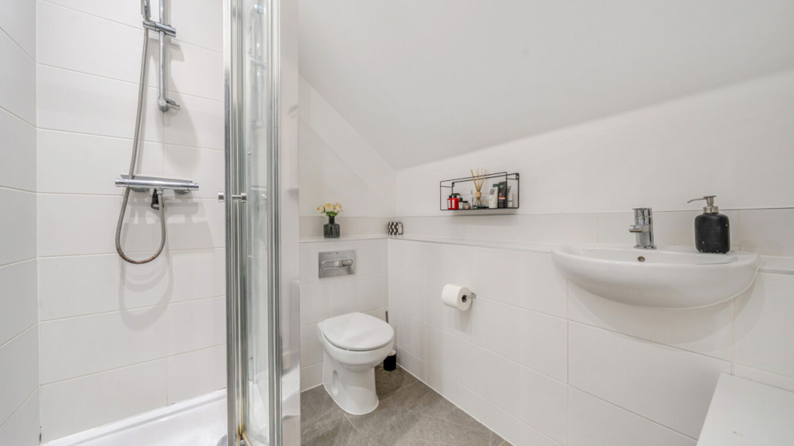 hob, fridge/freezer, dishwasher and integrated extractor. A washing machine/dryer and Eco Bins are also included. There is also a cloakroom/WC. On the first floor are two well proportioned double bedrooms, one with fitted wardrobe, and a contemporary family bathroom. On the third floor find a further double bedroom with in-built storage and en-suite shower room.