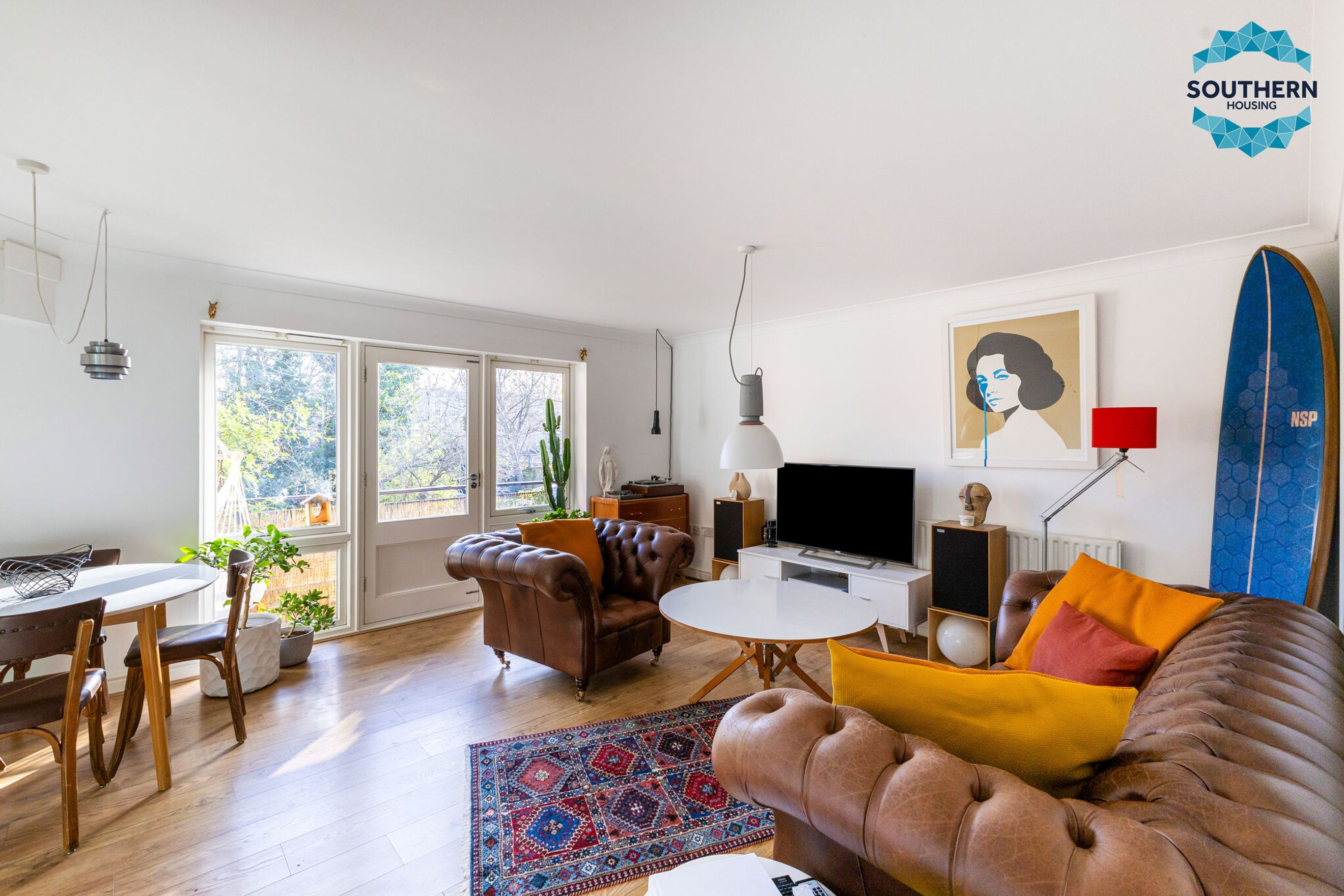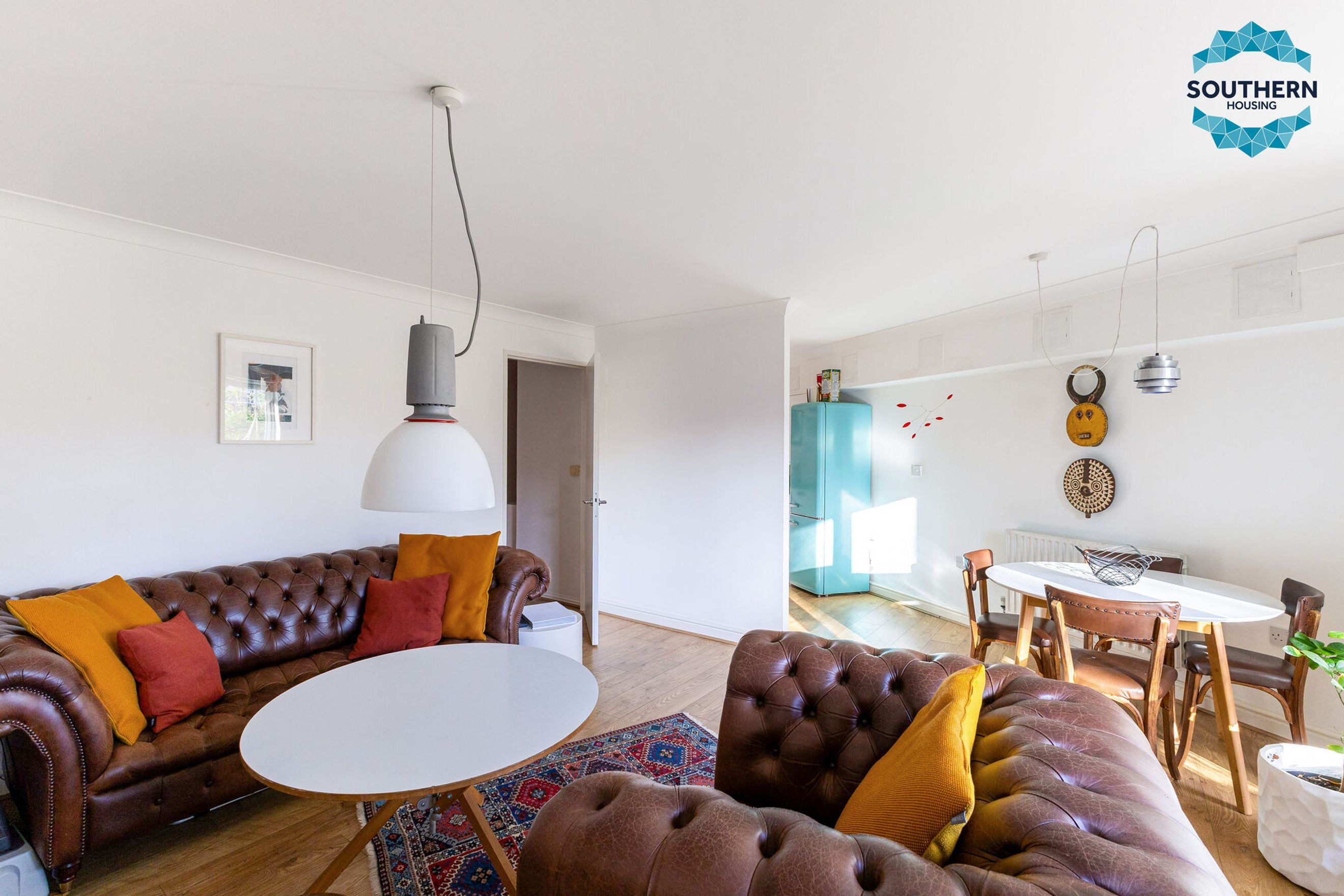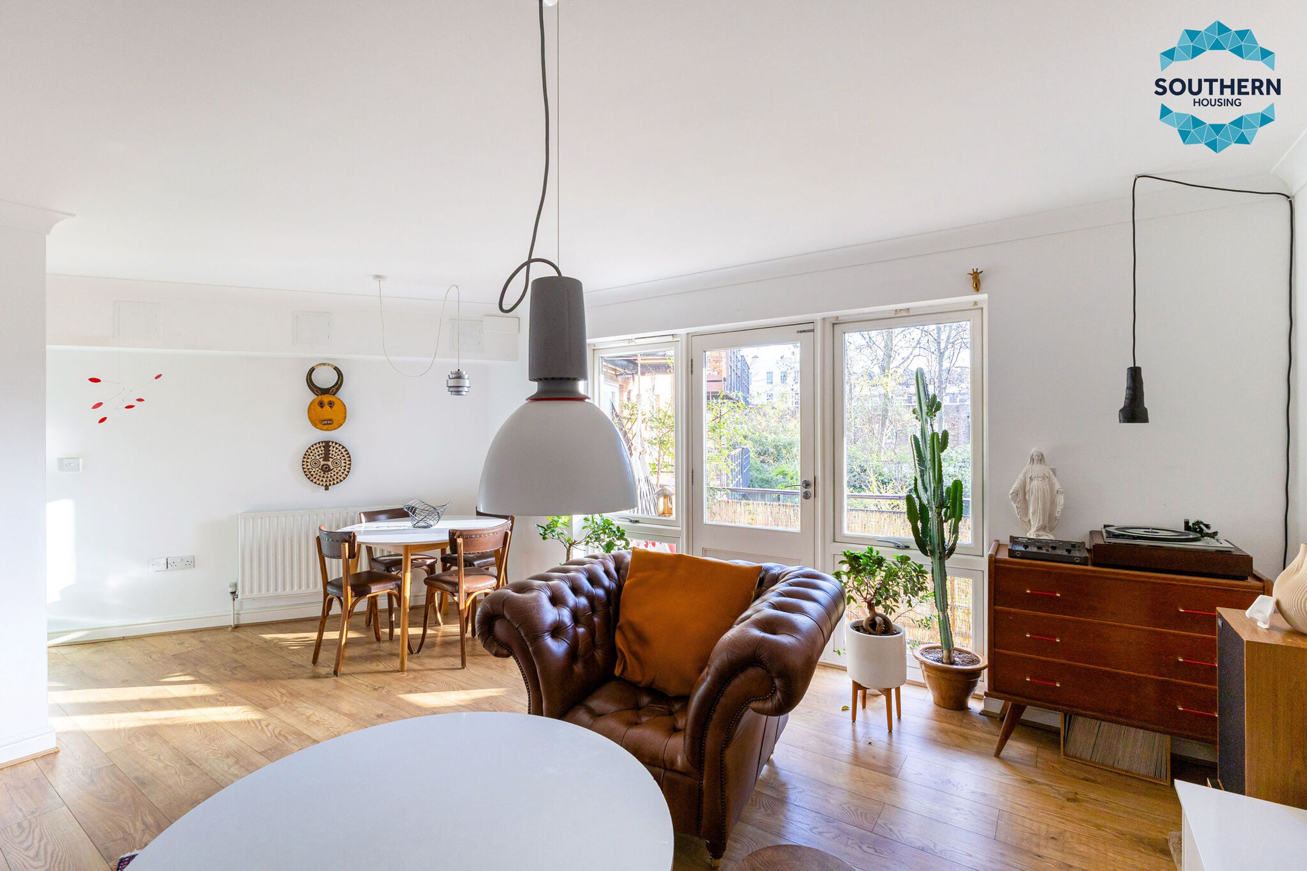 The heart of the home is the spacious open-plan living area, seamlessly connected to a newly fitted modern kitchen. The living room offers ample space to create distinct lounge and dining zones, while large windows and doors flood the space with natural light and open onto your own private balcony. The kitchen features a contemporary design with generous storage and worktop space, complete with an integrated hob, extractor fan, and oven.