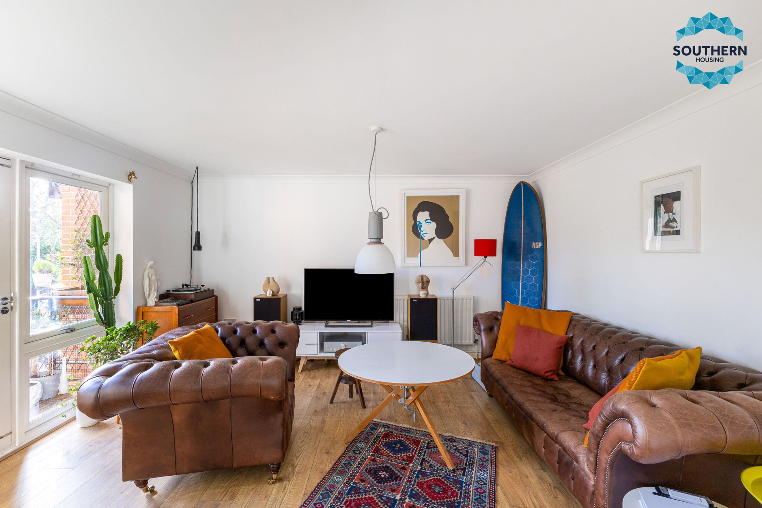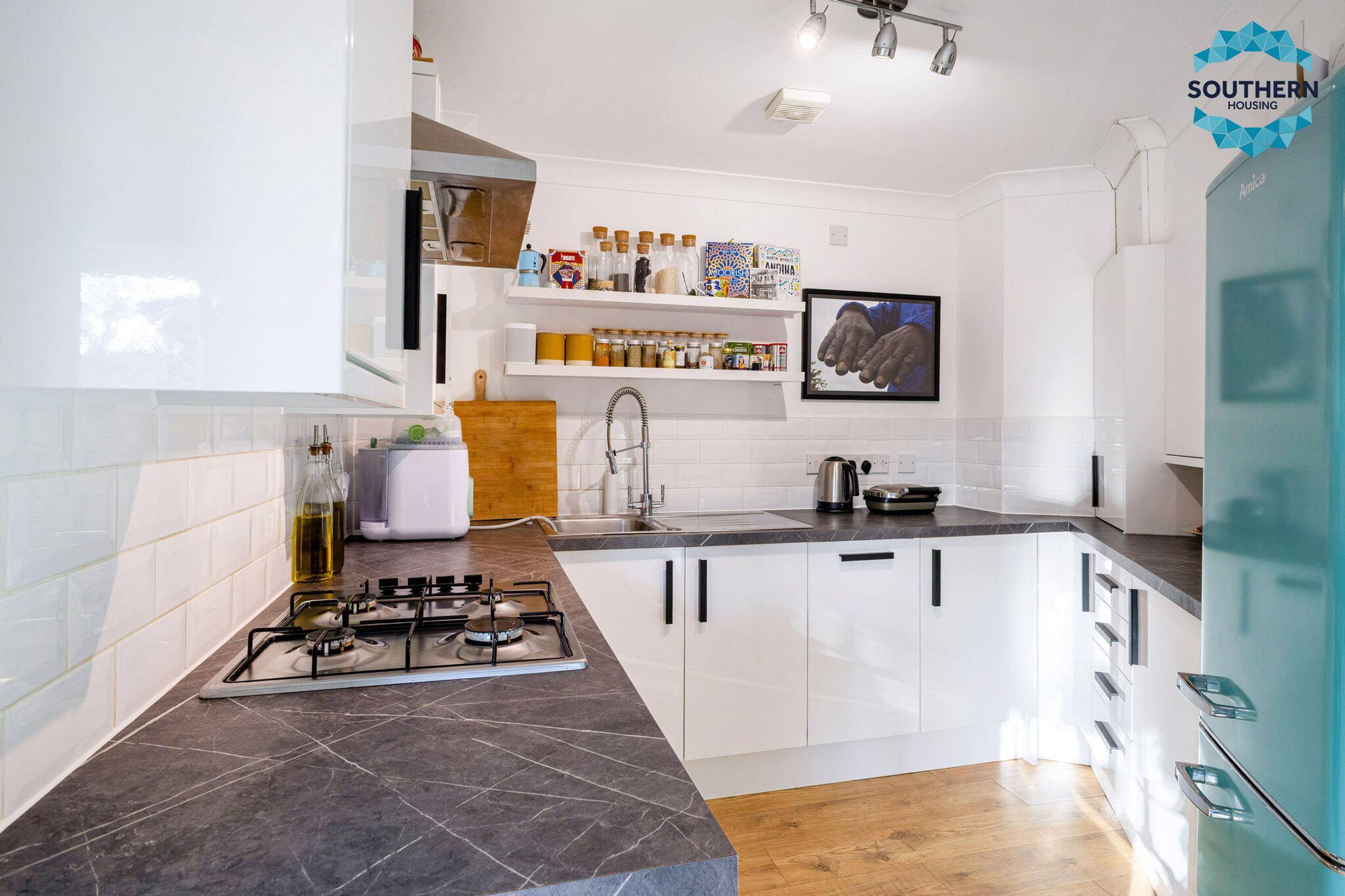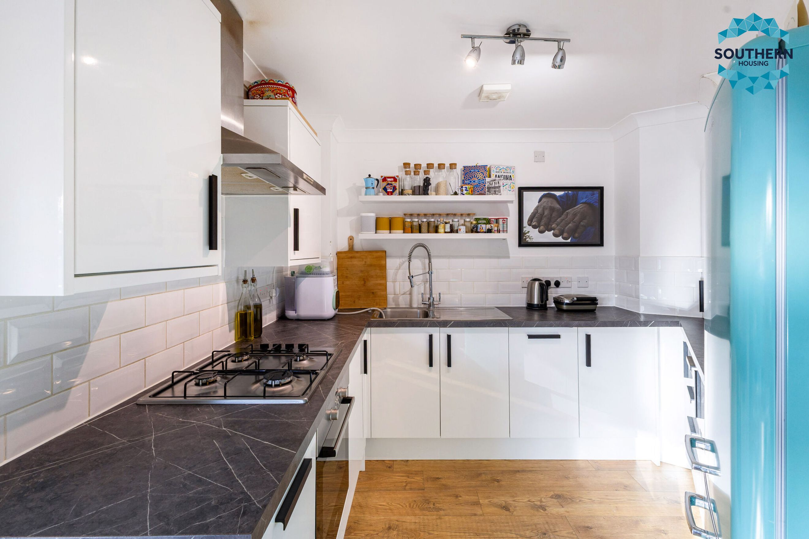 The heart of the home is the spacious open-plan living area, seamlessly connected to a newly fitted modern kitchen. The living room offers ample space to create distinct lounge and dining zones, while large windows and doors flood the space with natural light and open onto your own private balcony. The kitchen features a contemporary design with generous storage and worktop space, complete with an integrated hob, extractor fan, and oven.