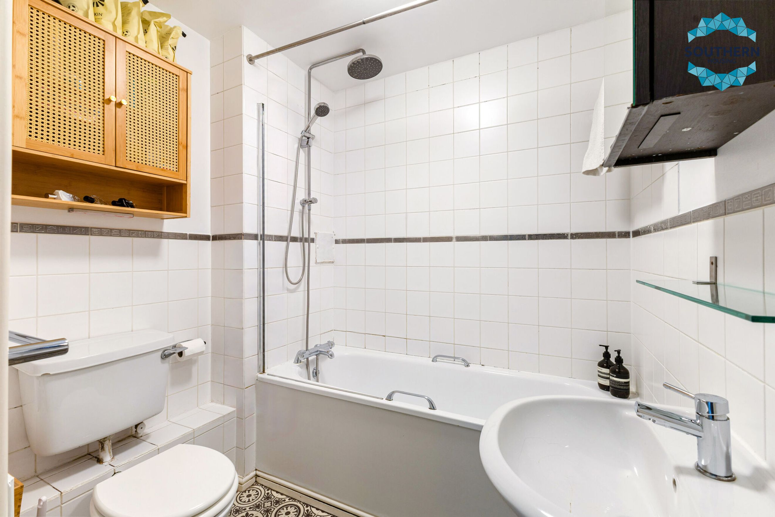 Completing the apartment is a modern family bathroom, featuring a shower over the bath.