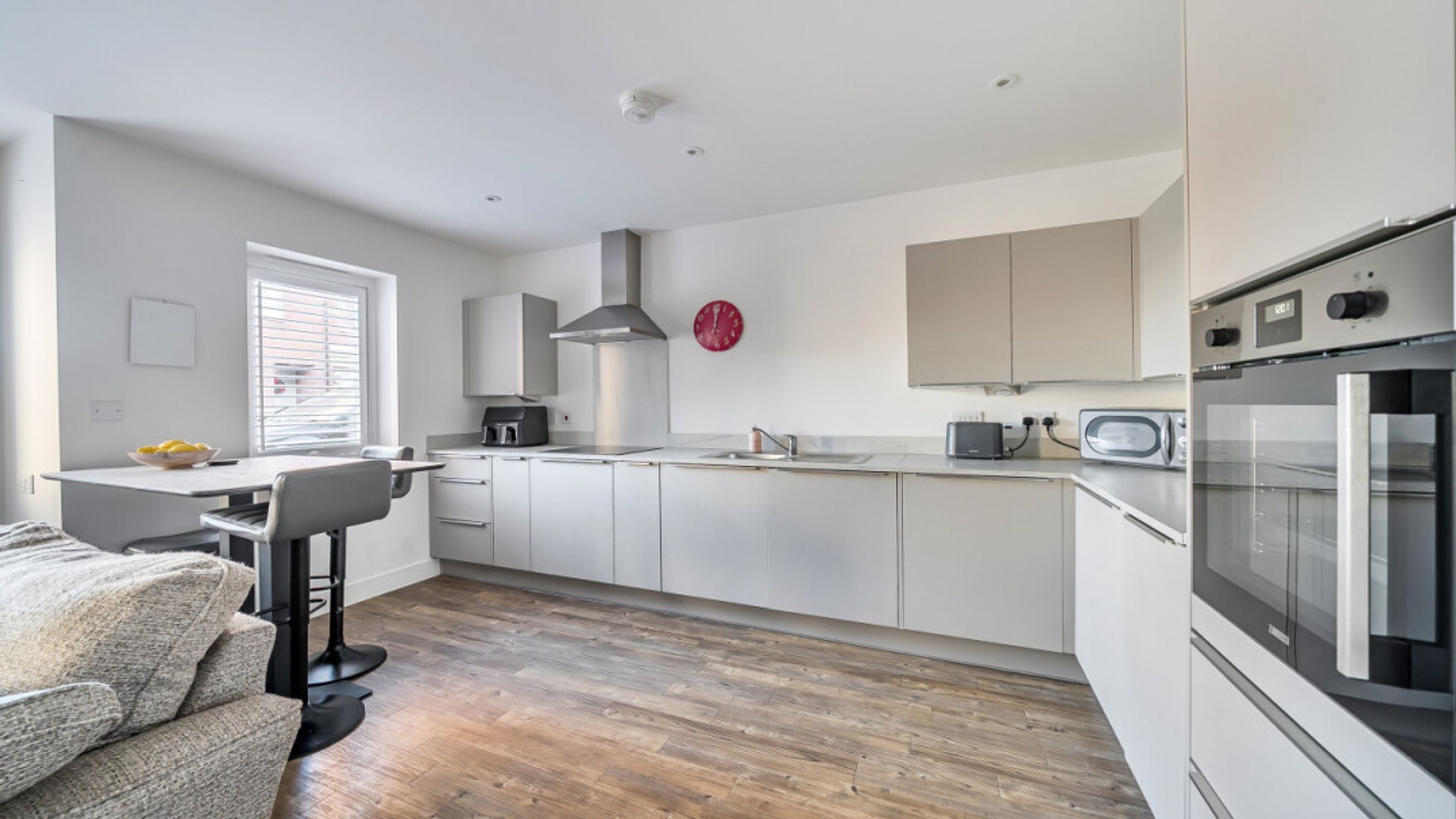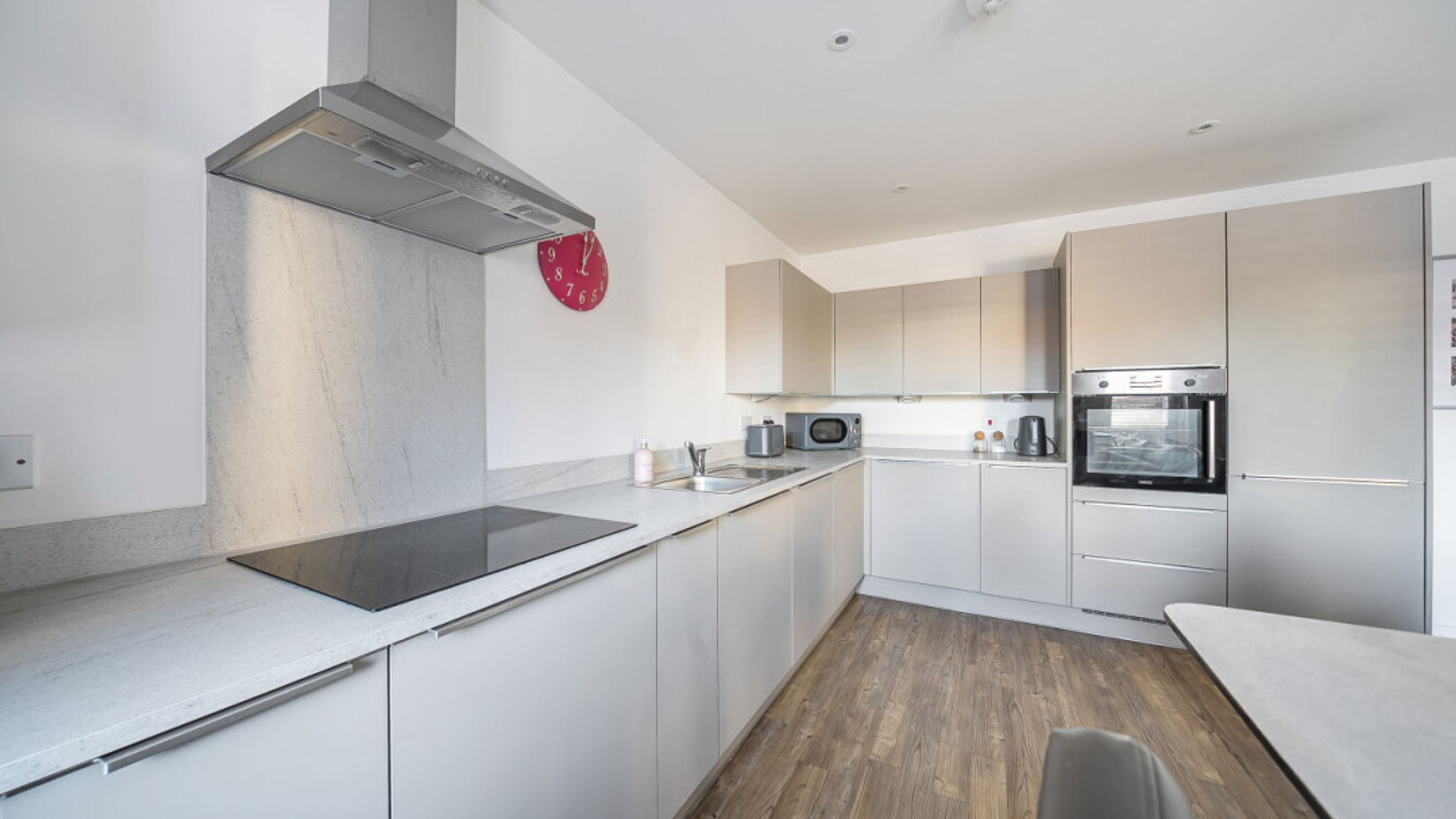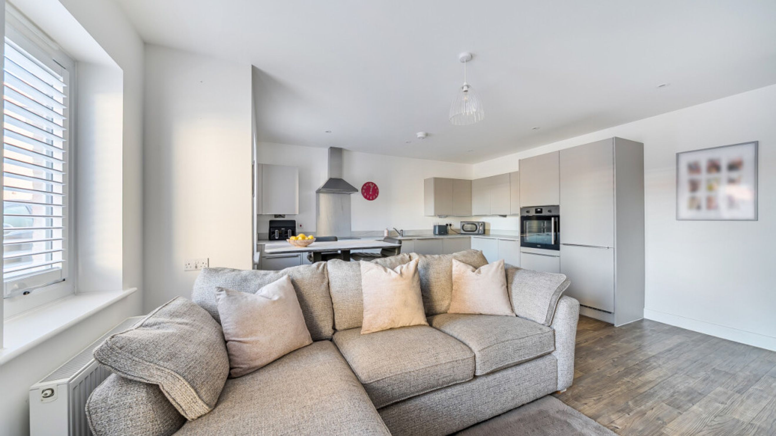 Internally, the home comprises a modern open-plan kitchen and living area. The kitchen is fitted with matt grey wall and base units, under-cupboard lighting and a light grey stone-effect worktop, offering generous counter space, along with integrated appliances including a fridge freezer, oven, hob, extractor fan and dishwasher.
