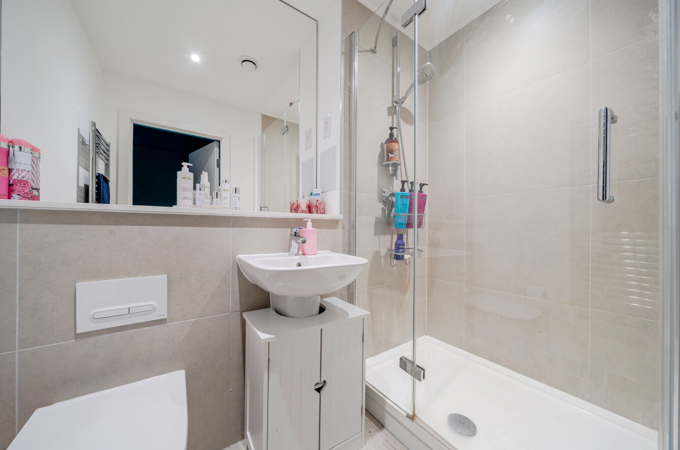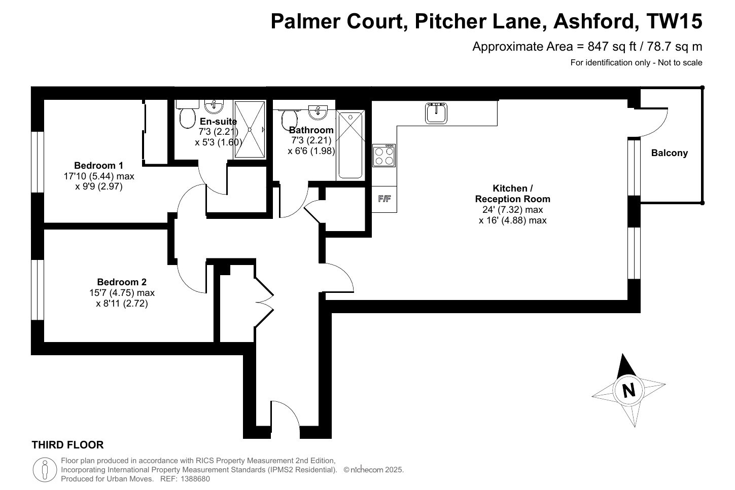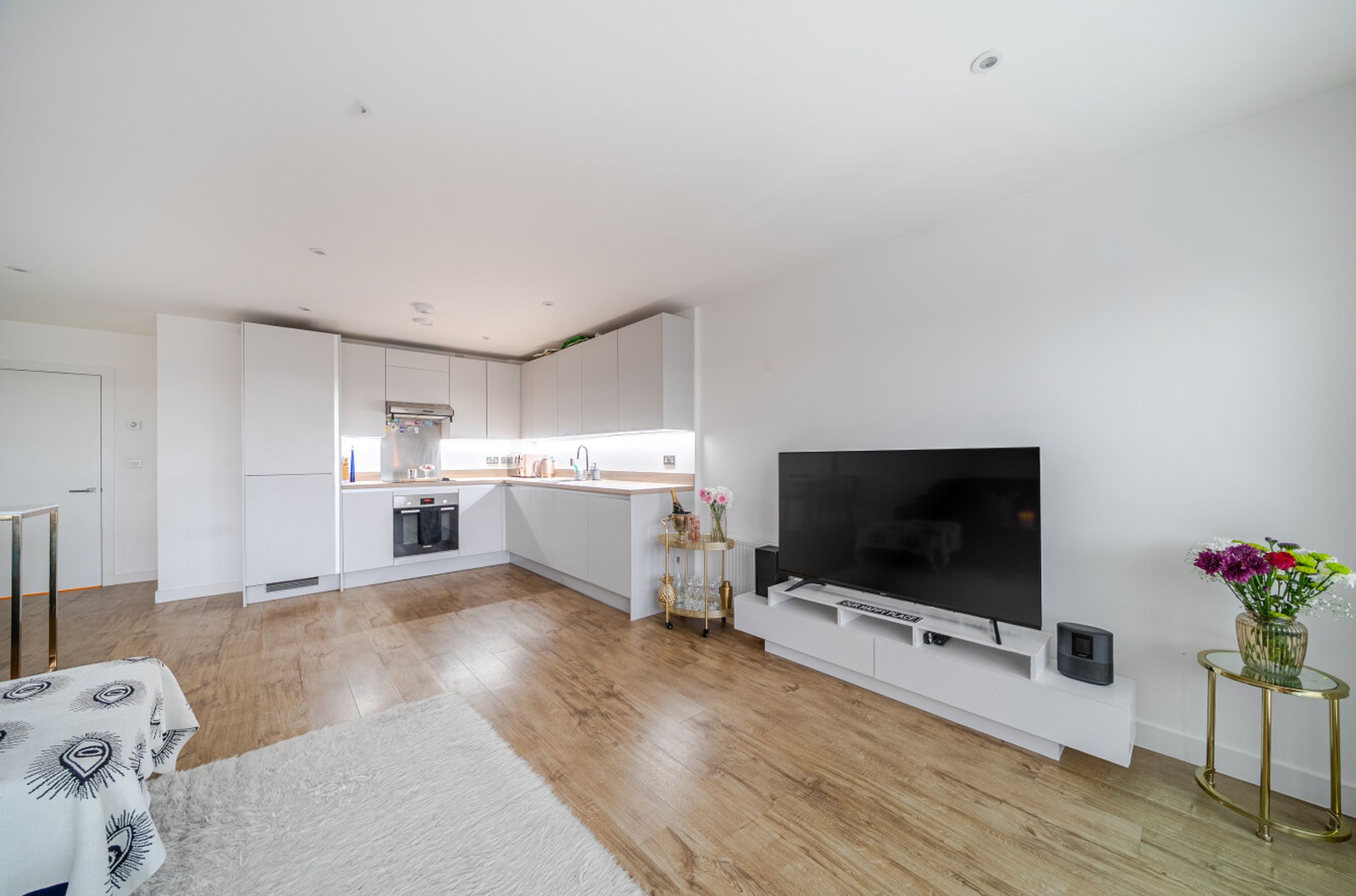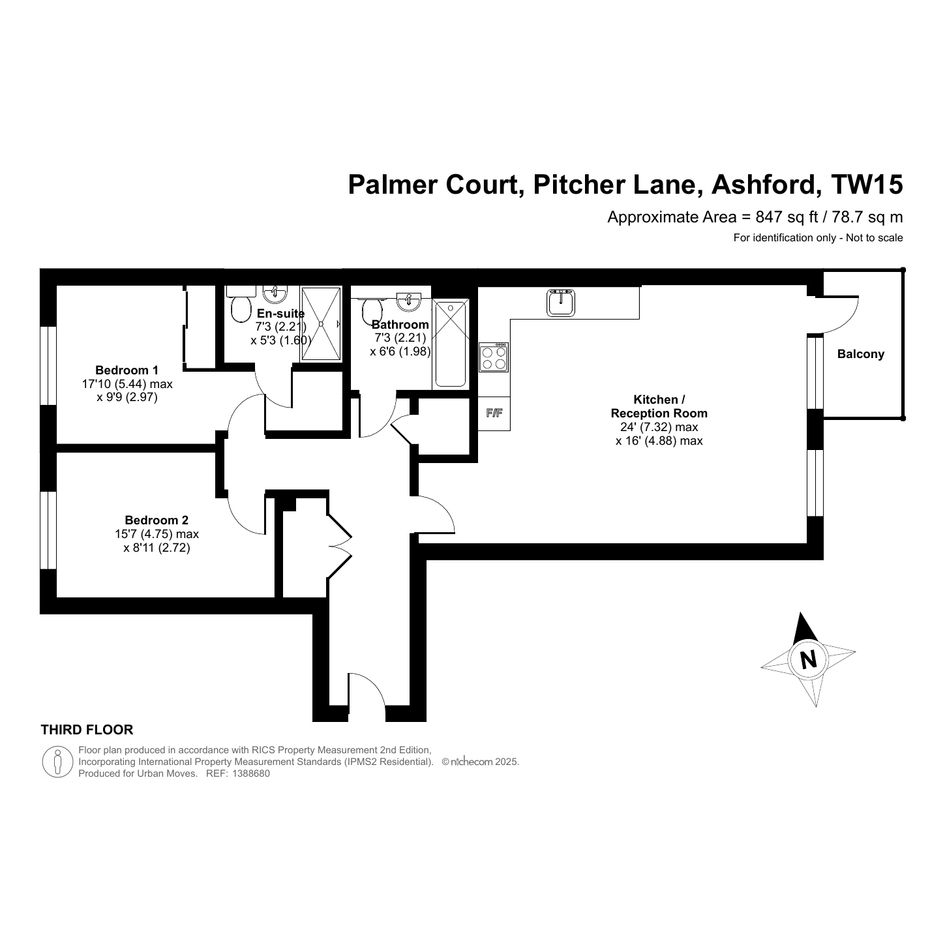 A smartly-presented apartment on the third floor of this recently-constructed development. The property has a large reception room with attractive flooring and an open-plan kitchen area featuring handle-less units and integrated appliances. A door leads out onto an east/south-east-facing balcony. There is a main bedroom with fitted wardrobe and en-suite shower room plus a second, good-sized, double bedroom and a simple yet stylish bathroom. A large utility cupboard has been provided in the entrance hallway and well insulated walls, high performance glazing and a communal heating/hot water system all contribute towards a very good energy-efficiency rating. Palmer Court has a raised communal garden overlooking a public green. There is a communal cycle store and Ashford Station, for rail services between Weybridge / Windsor & Eton Riverside and London Waterloo, is only a short walk away. Ofsted list five primary schools within a mile radius, all rated either 'Good' or 'Outstanding'. This particular apartment comes with the use of two parking spaces - one outside and one in the underground car park.