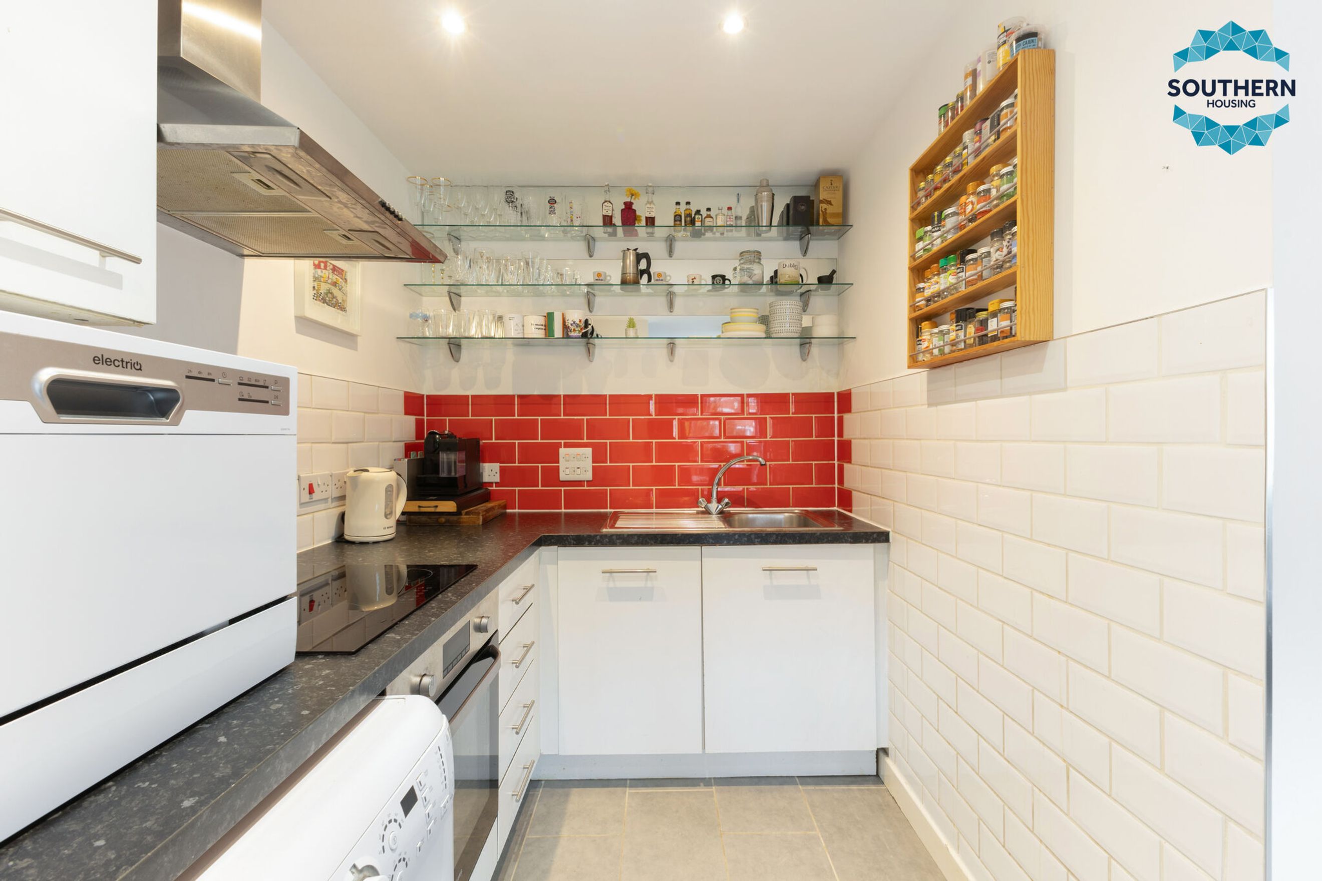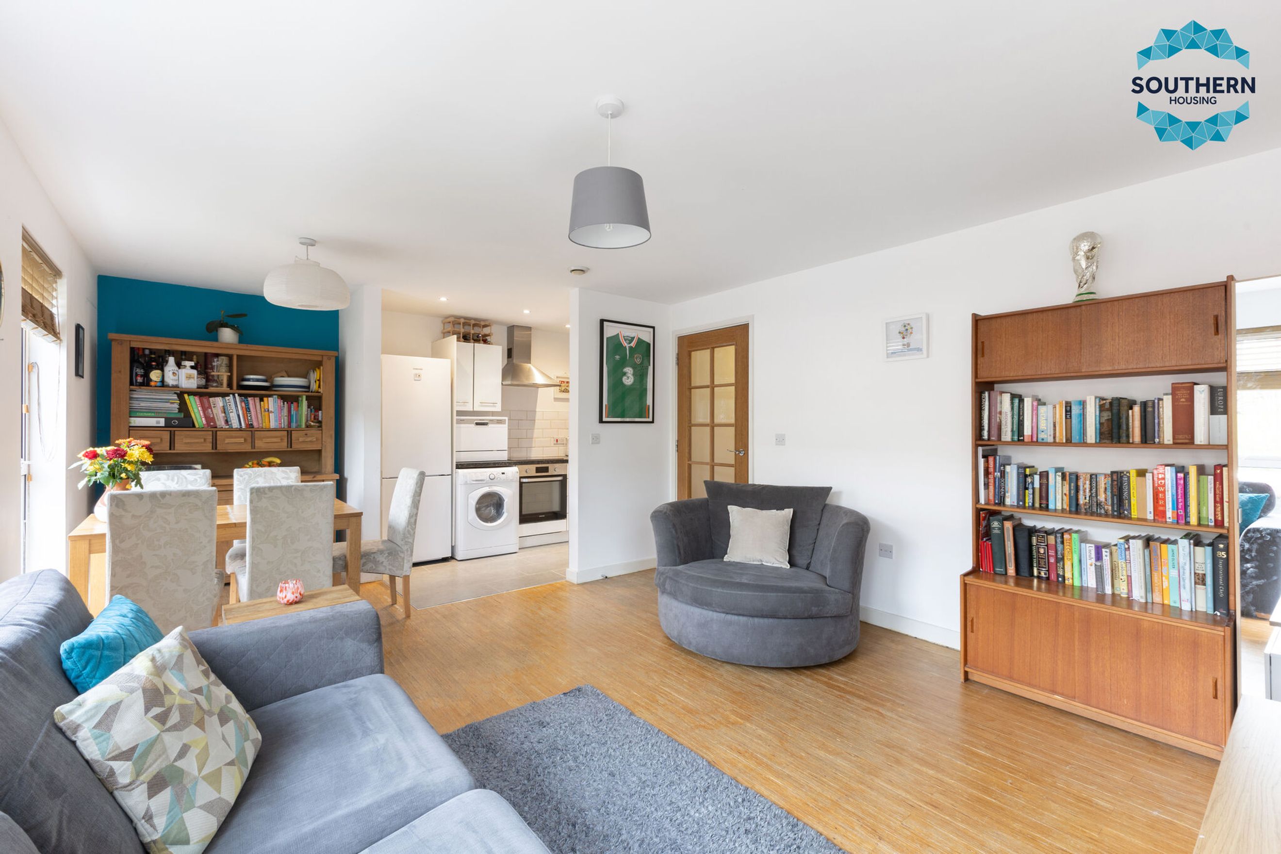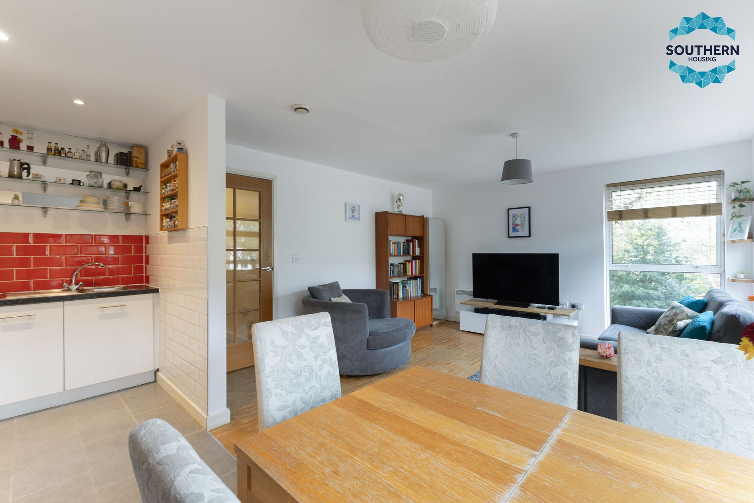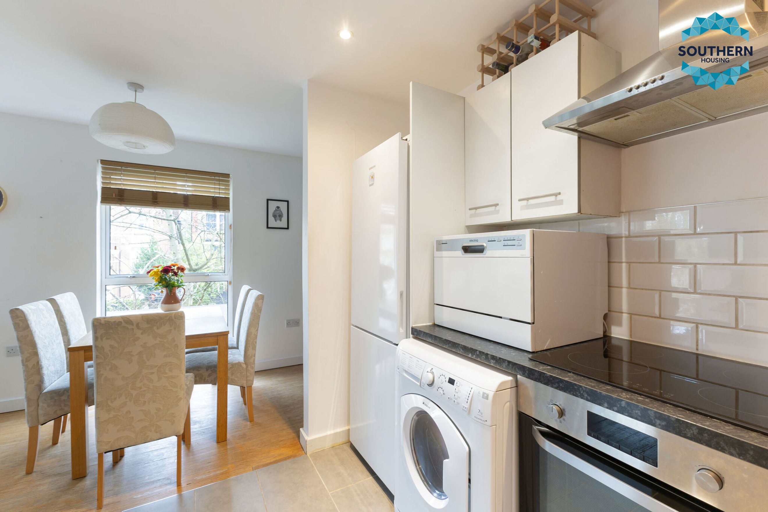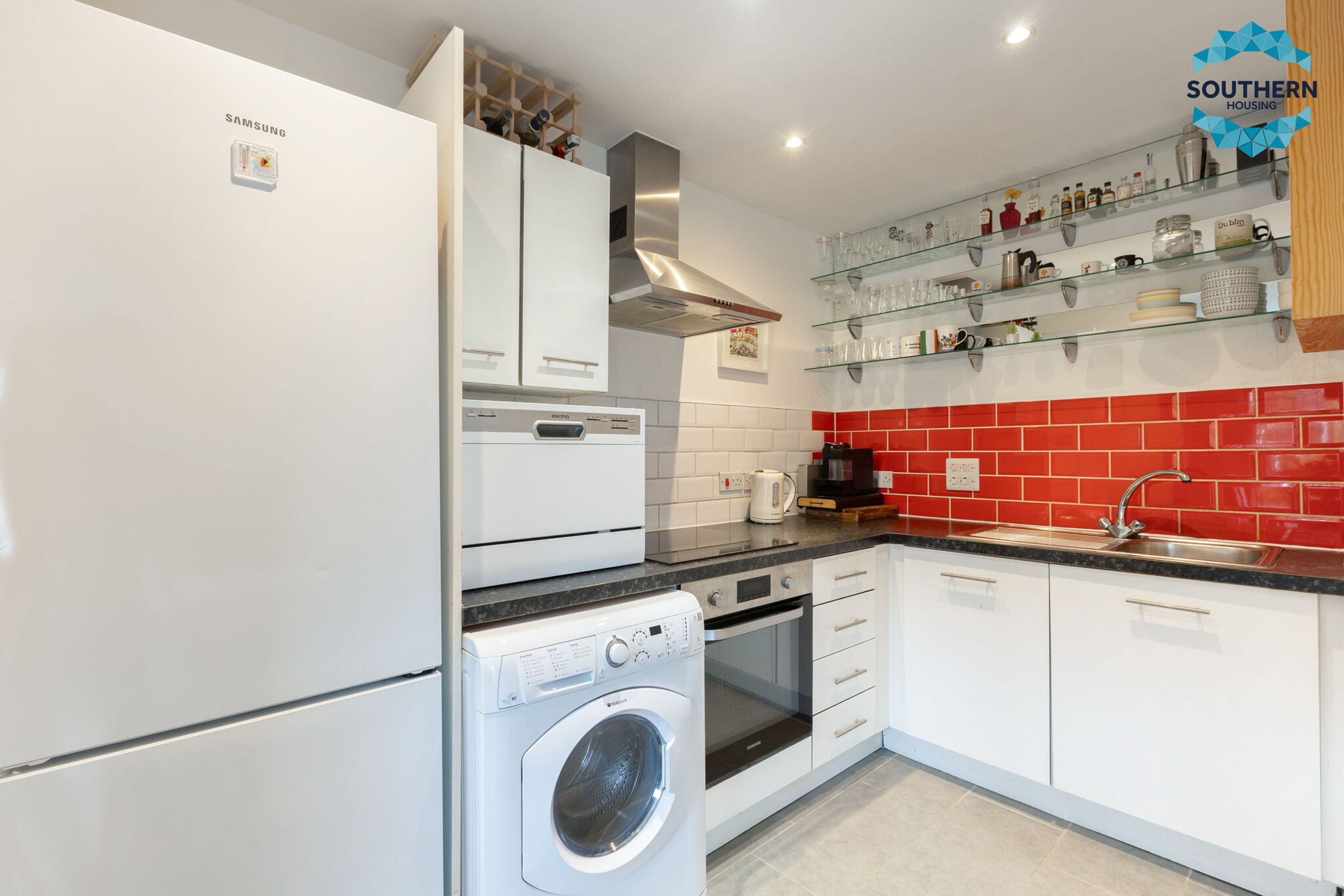 The property welcomes you with a bright hallway that features two generous storage cupboards, ideal for keeping household items neatly organised. At the heart of the home is a spacious open-plan living area that provides an excellent setting for both relaxing and entertaining. The modern kitchen is fitted with high-quality integrated appliances, including an oven, stove, and extractor fan, along with ample worktop and cupboard space to support everyday cooking with ease.