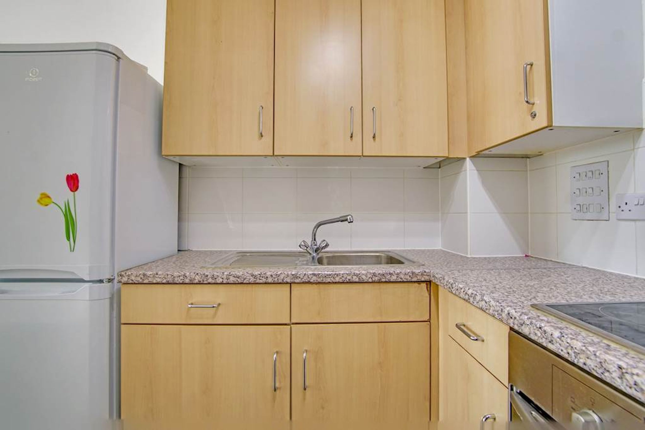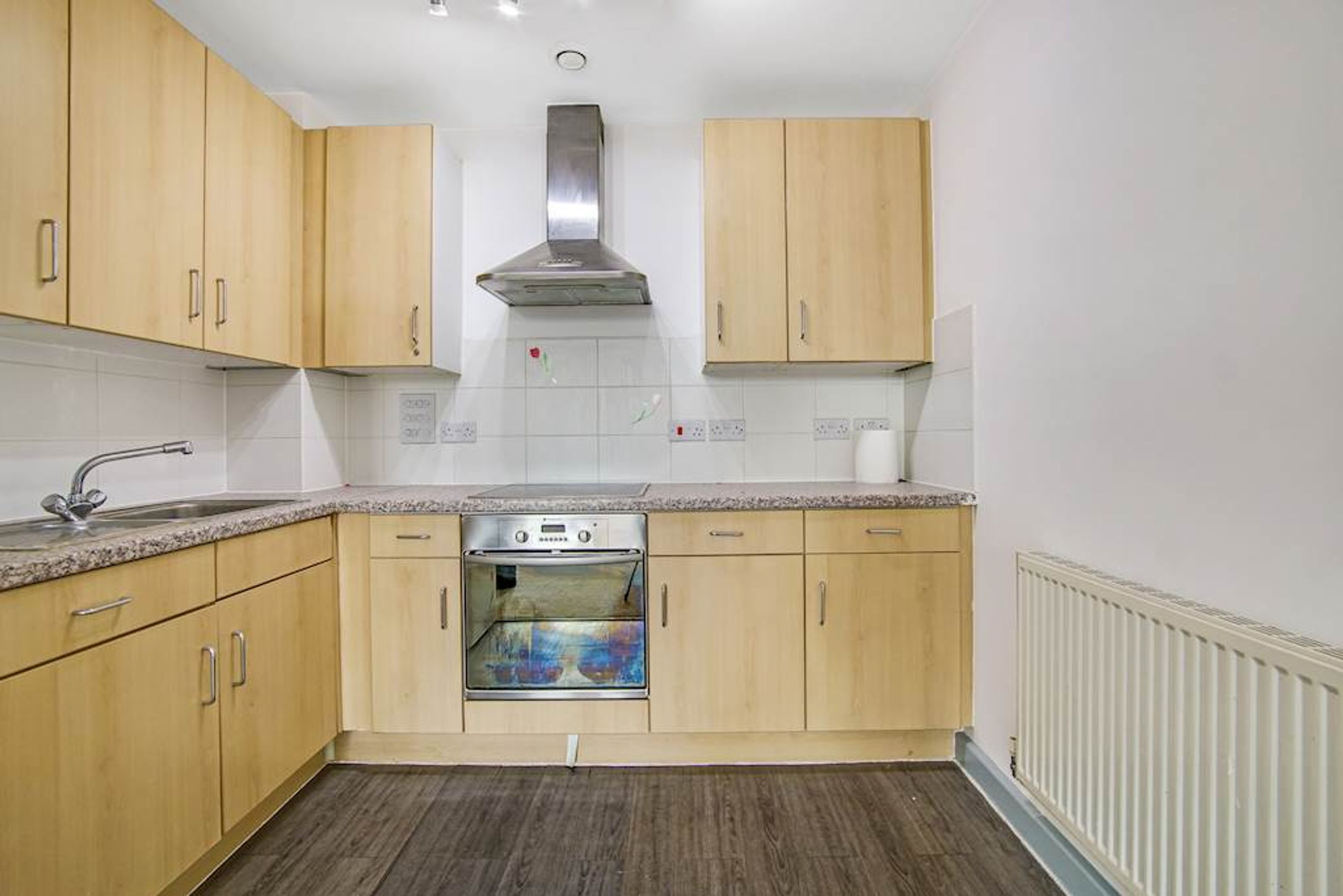 The open-plan living room and kitchen form the heart of the apartment, offering an excellent space for both relaxing and entertaining. The kitchen is smartly appointed with timber-effect units, granite-effect worktops, tiled splashbacks, and a range of appliances including a ceramic hob, stainless steel oven, and extractor hood, with space for a fridge/freezer. The living area benefits from full-height east-facing windows that flood the space with natural light, along with carpeting, a radiator, and a cupboard housing the recently installed electric boiler for central heating.