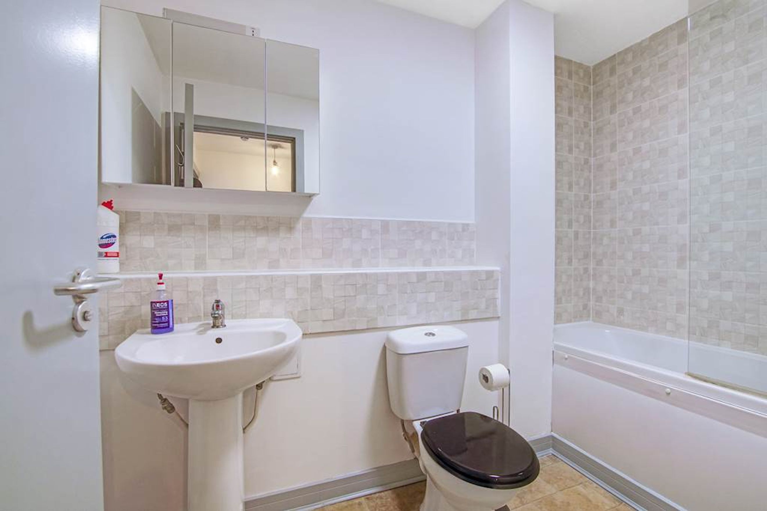 The contemporary bathroom is neatly finished with a bath and integrated shower with glass screen, complemented by full-height tiling around the bathing area. A close-coupled WC, pedestal wash hand basin with mirrored cabinet and shaver light, radiator, and ventilation complete this clean and functional space.