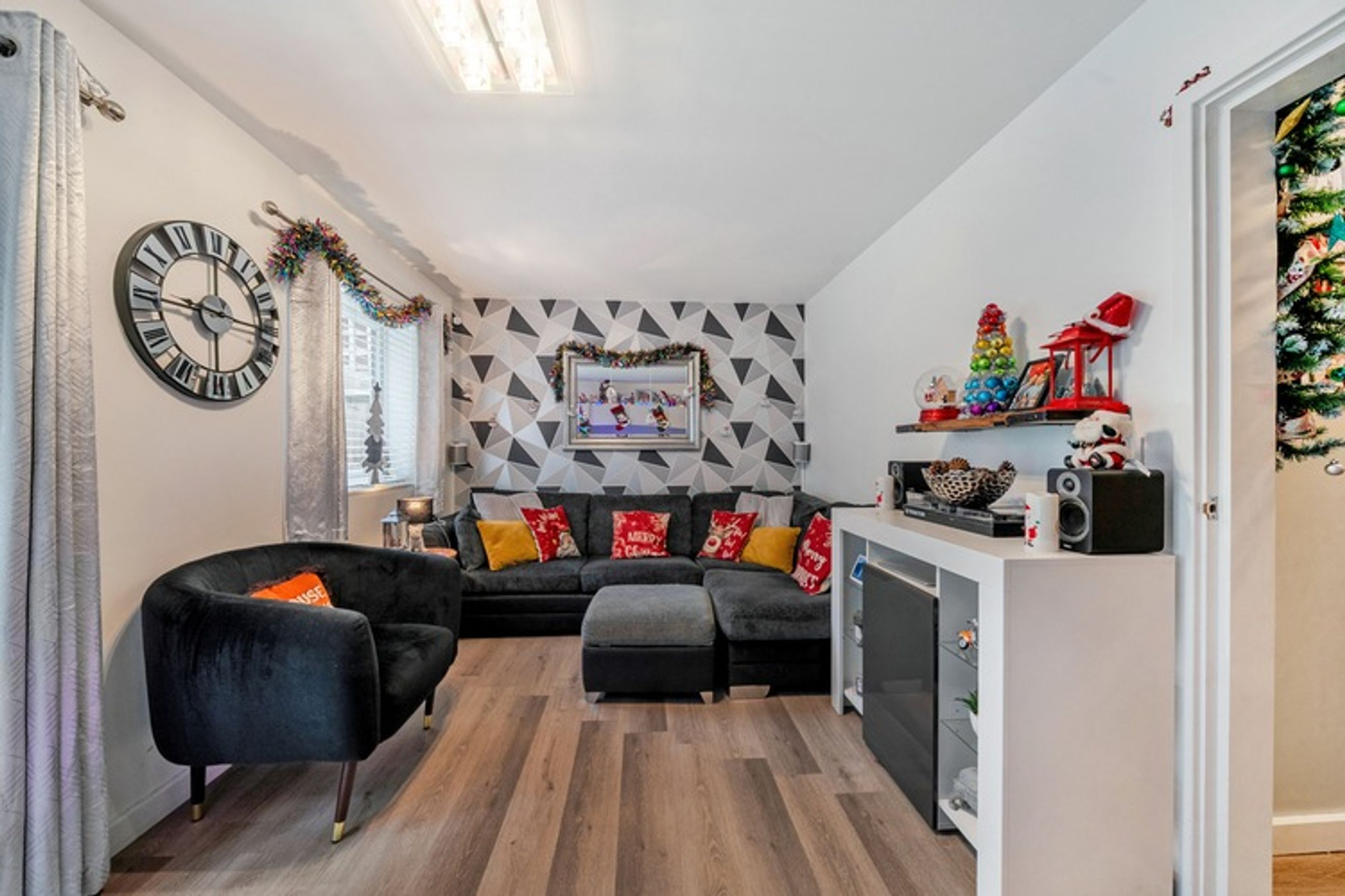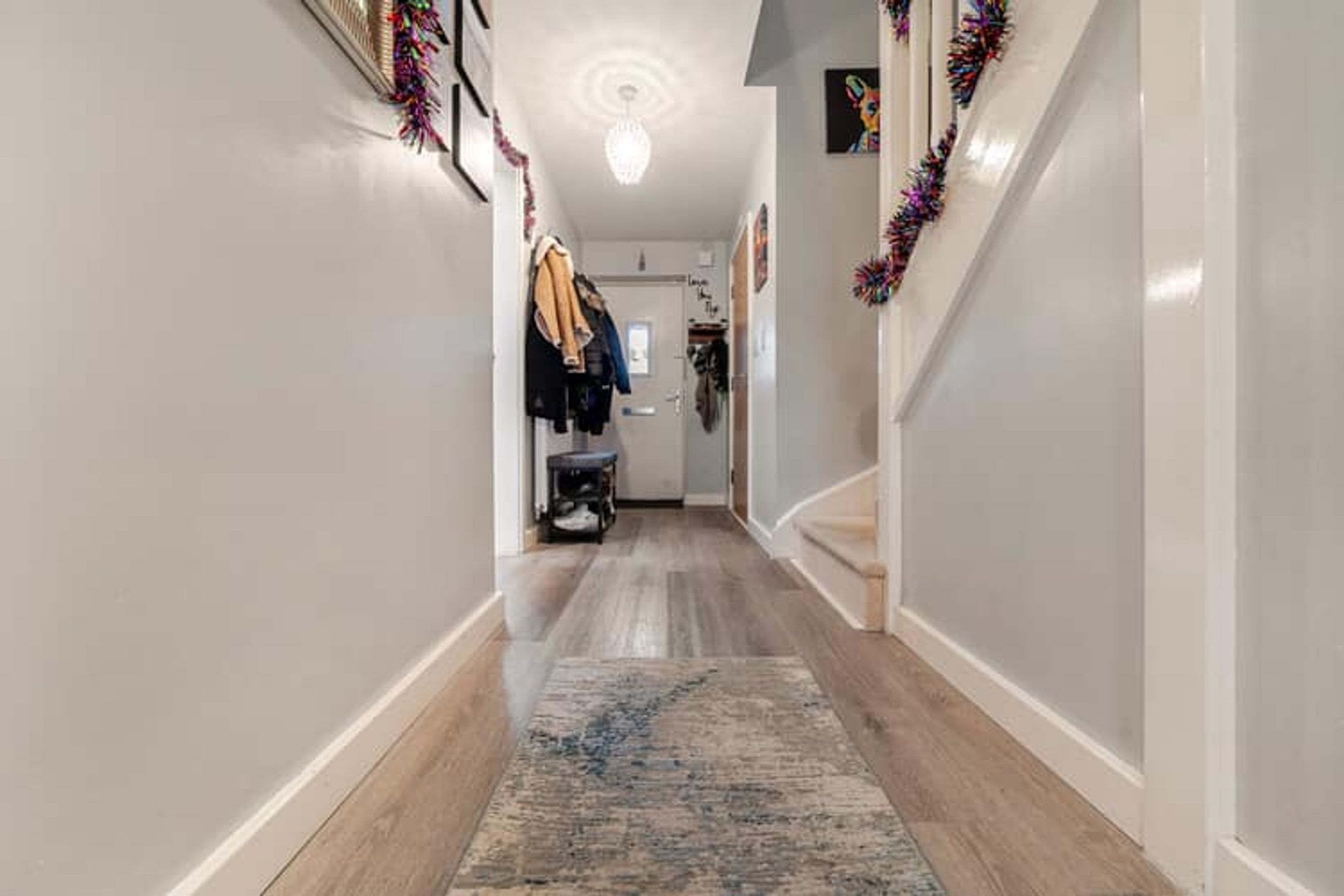Outside, there is a private rear garden, a room extension with a bar and allocated parking. Perfect for small families.