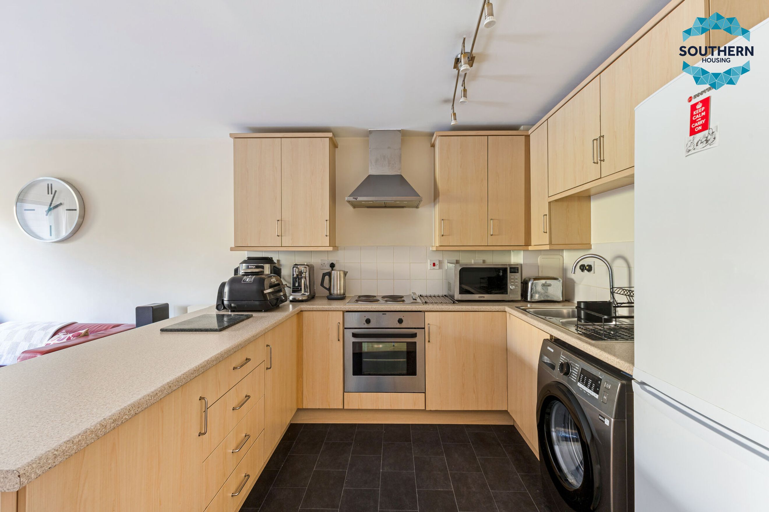 The property benefits from an open-plan living and kitchen area, creating a spacious and versatile area for both relaxing and hosting. The kitchen is thoughtfully arranged and well-equipped, offering a generous amount of worktop space and ample cupboard storage. Integrated appliances include an oven, stove, and extractor fan, providing a sleek and functional cooking environment that blends seamlessly with the living space.
