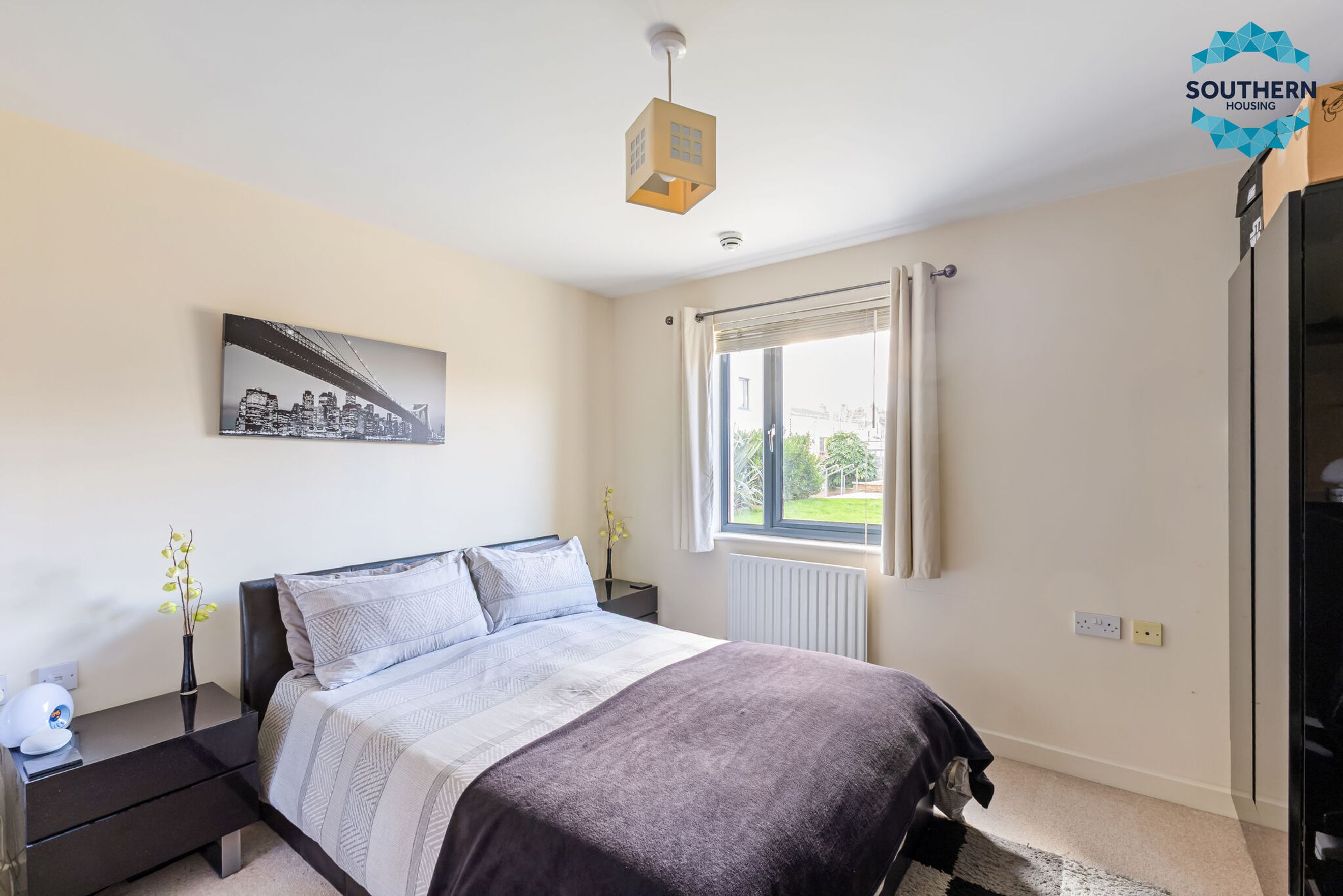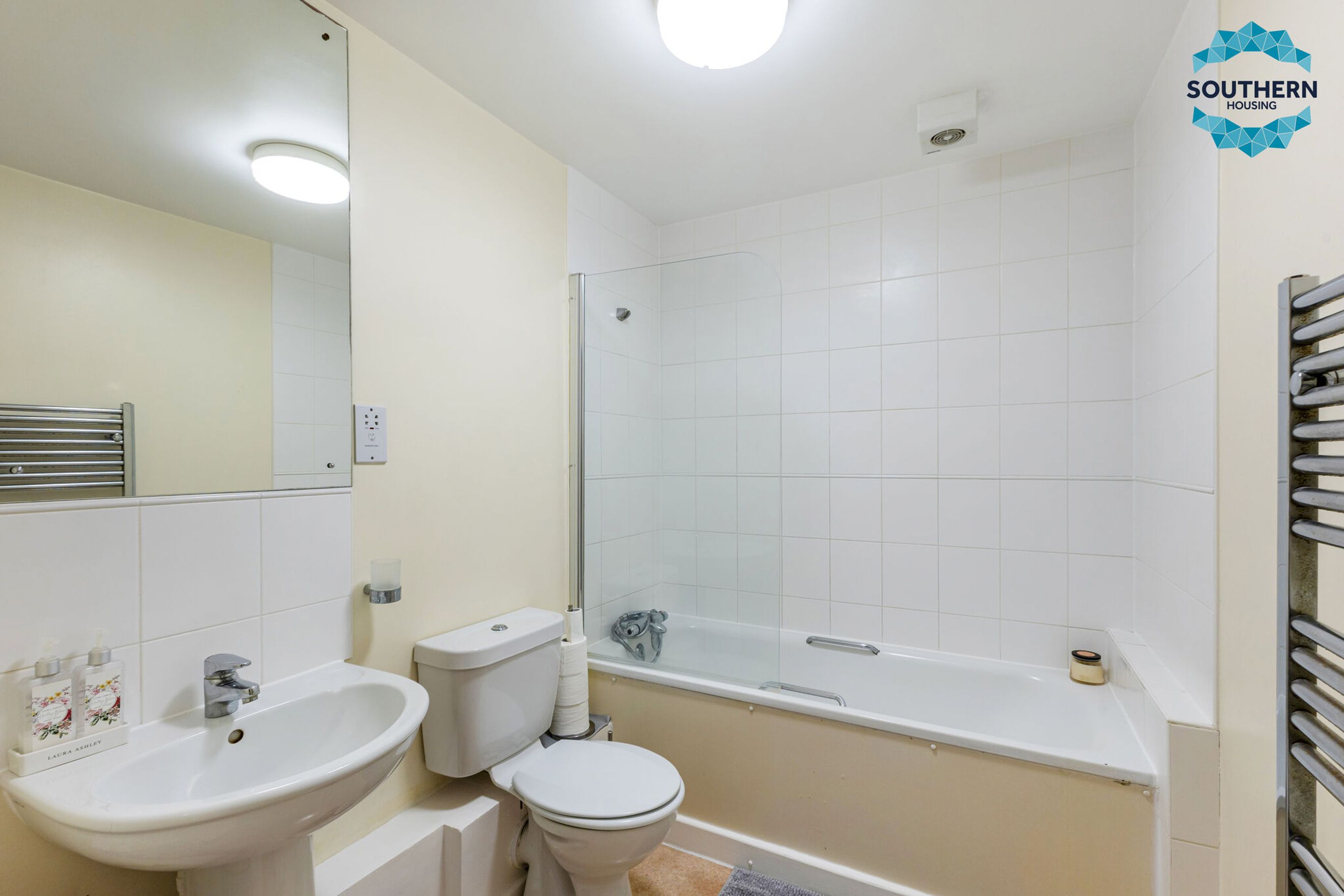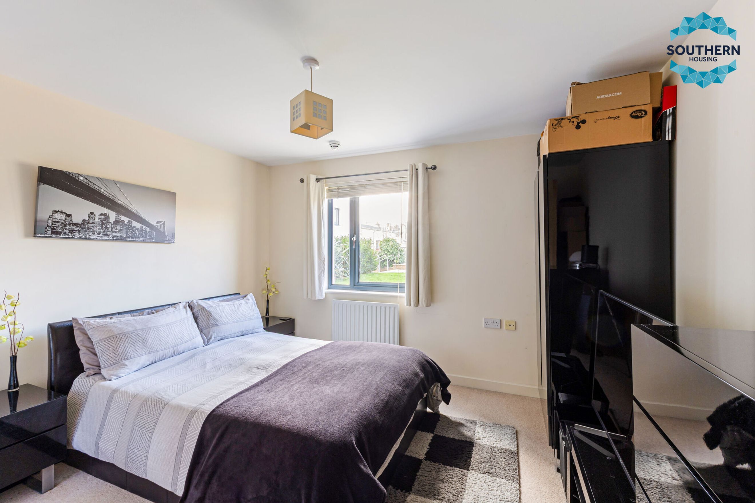 Both bedrooms are well-sized and adaptable, suitable for use as comfortable sleeping accommodation, a home office, or guest space. The modern bathroom is finished to a clean, contemporary standard and features a full-sized bath with an overhead shower. Additional practicality is provided by two separate storage cupboards located in the hallway, offering valuable space for household essentials and keeping the living areas clutter-free.