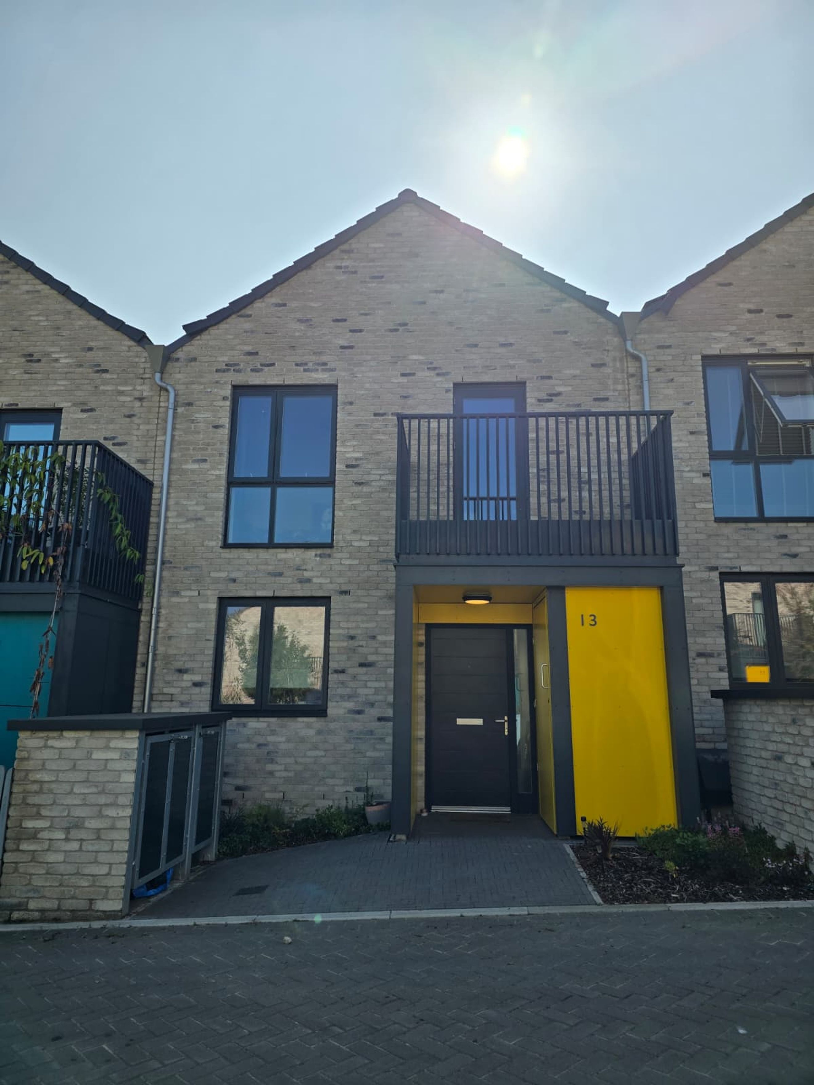 This mid-terrace house was built in 2022 and boasts a generous rear garden, front garden with bin storage, an external cycle cupboard and a balcony.