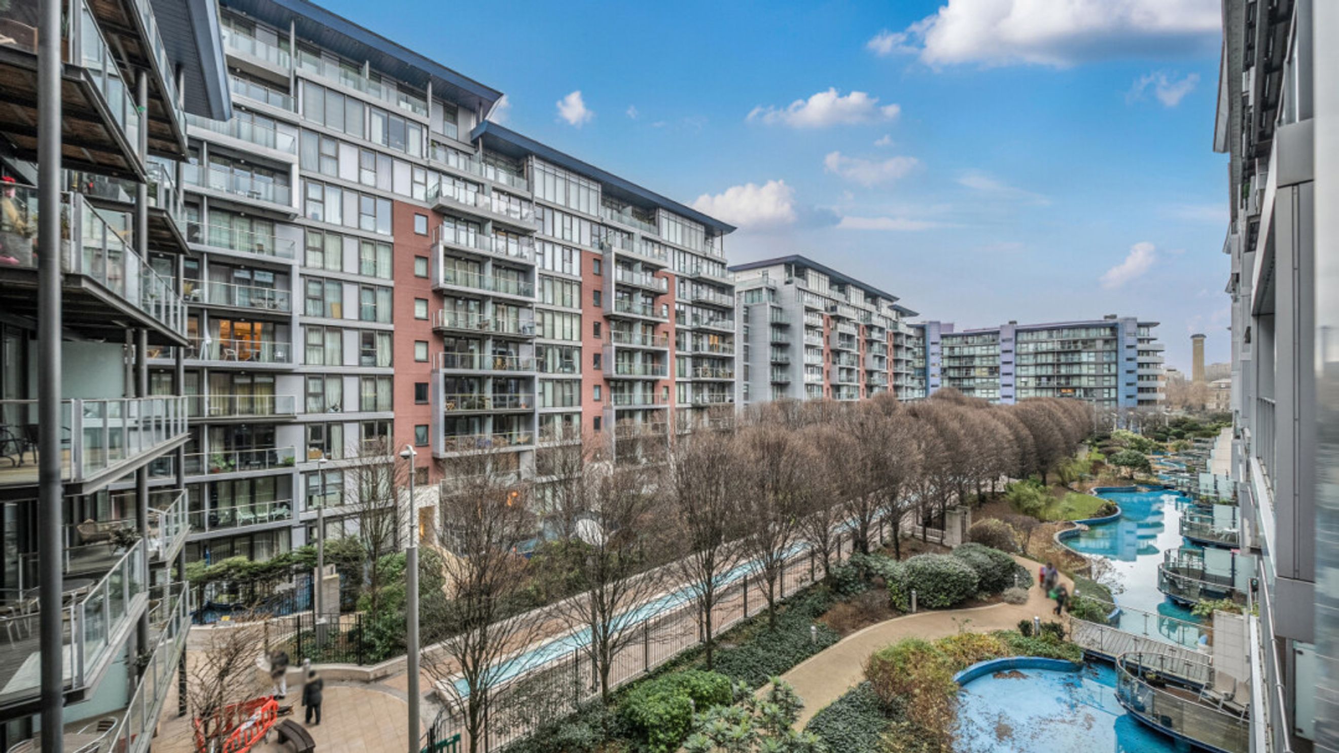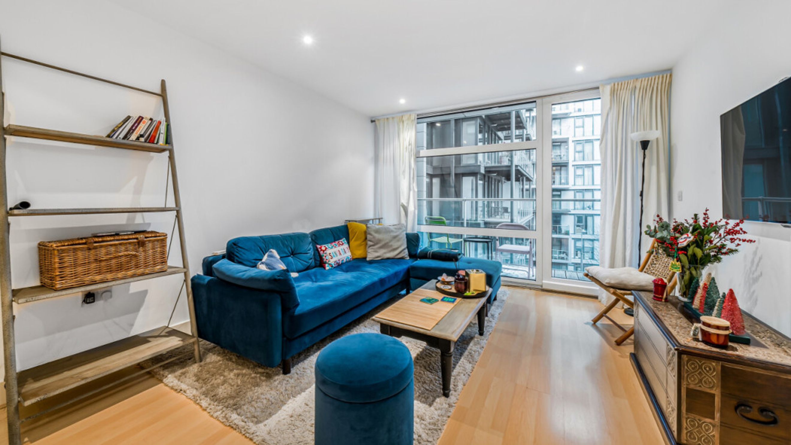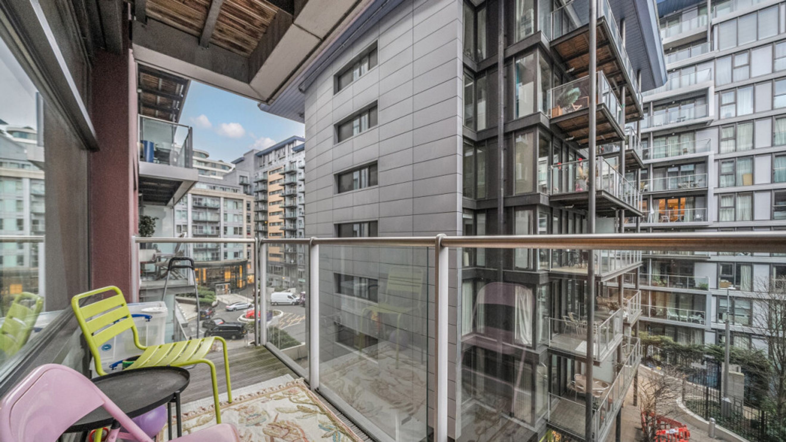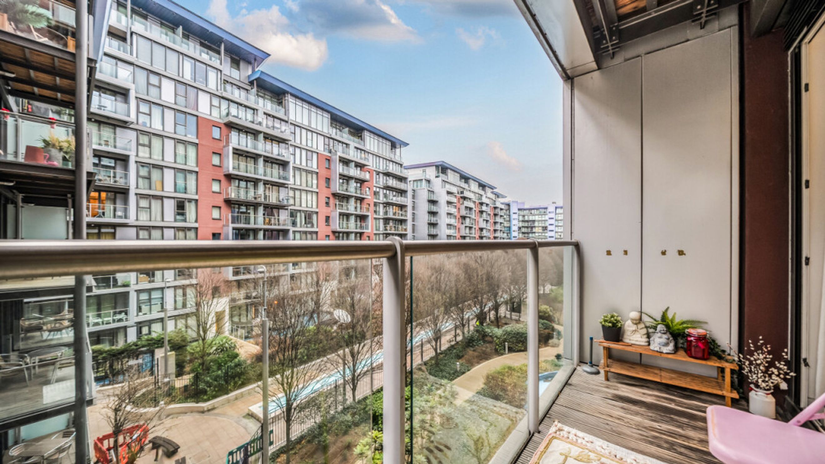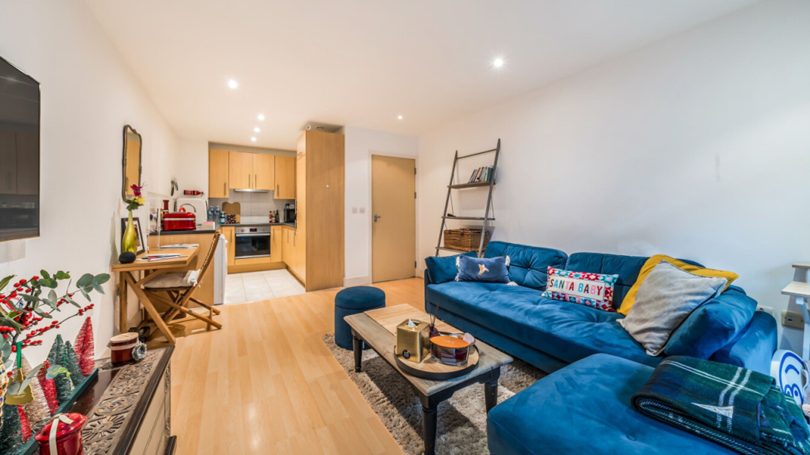 This bright west facing apartment consists of an open-plan kitchen and living area, flooded with natural light from wide floor-length windows opening onto a private balcony overlooking the communal gardens. The kitchen is fitted with Beech wall and white base units, and a grey granite effect worktop and includes an integrated fridge/freezer, oven, hob, and extractor fan. There is a spacious double bedroom including a fitted wardrobe and the bathroom comes complete with a white three-piece suite with a shower over bath and a tile surround.