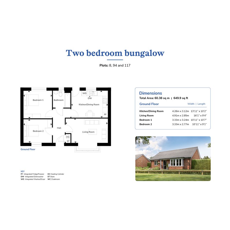 Plot 8 is a 649 square foot, two bedroom detached bungalow with a modern, open plan living area finished to a high standard, with a range of integrated appliances, private garden and 2 parking spaces at Benson Grange, available to purchase through Shared Ownership from a 40% share.