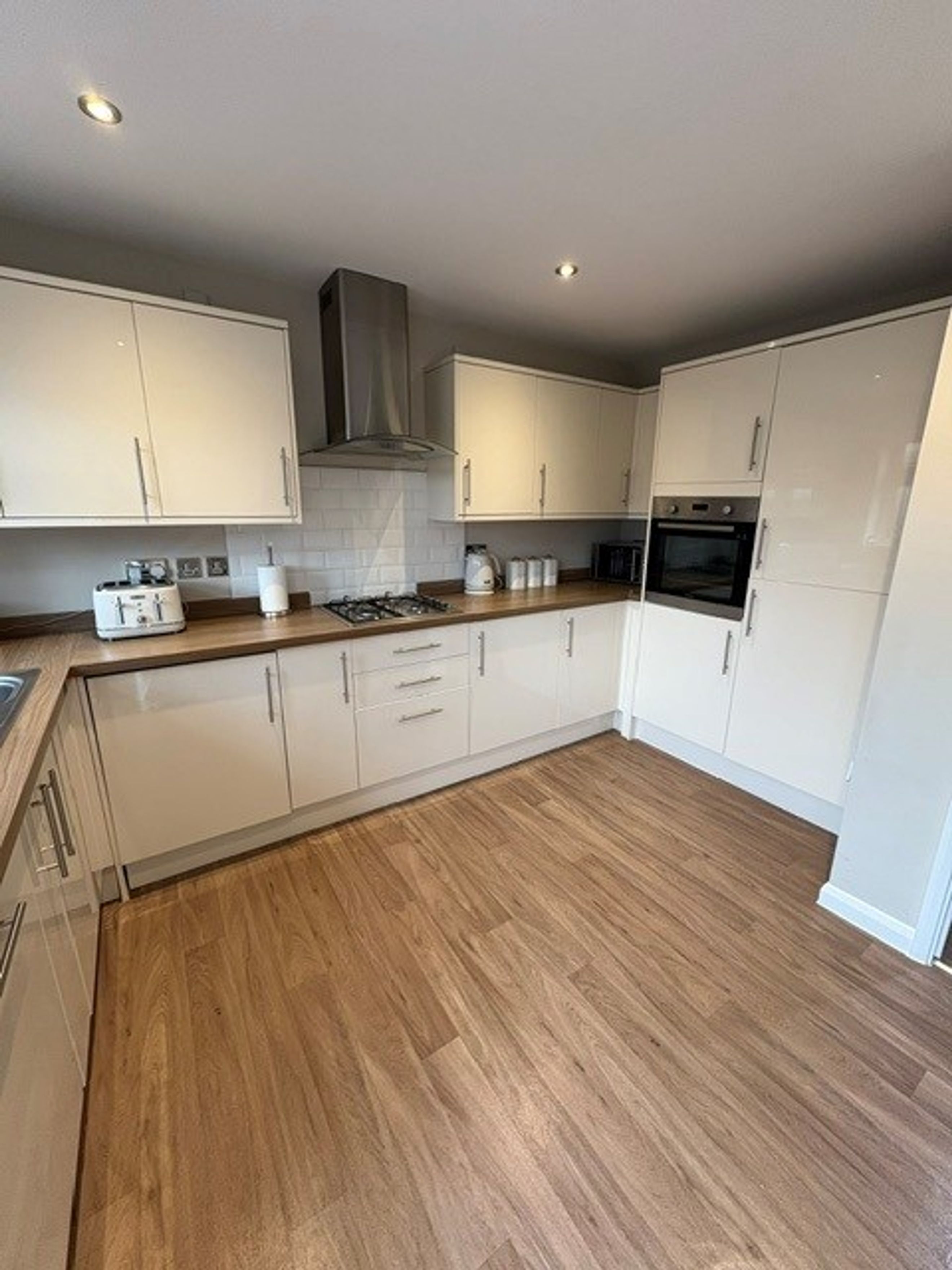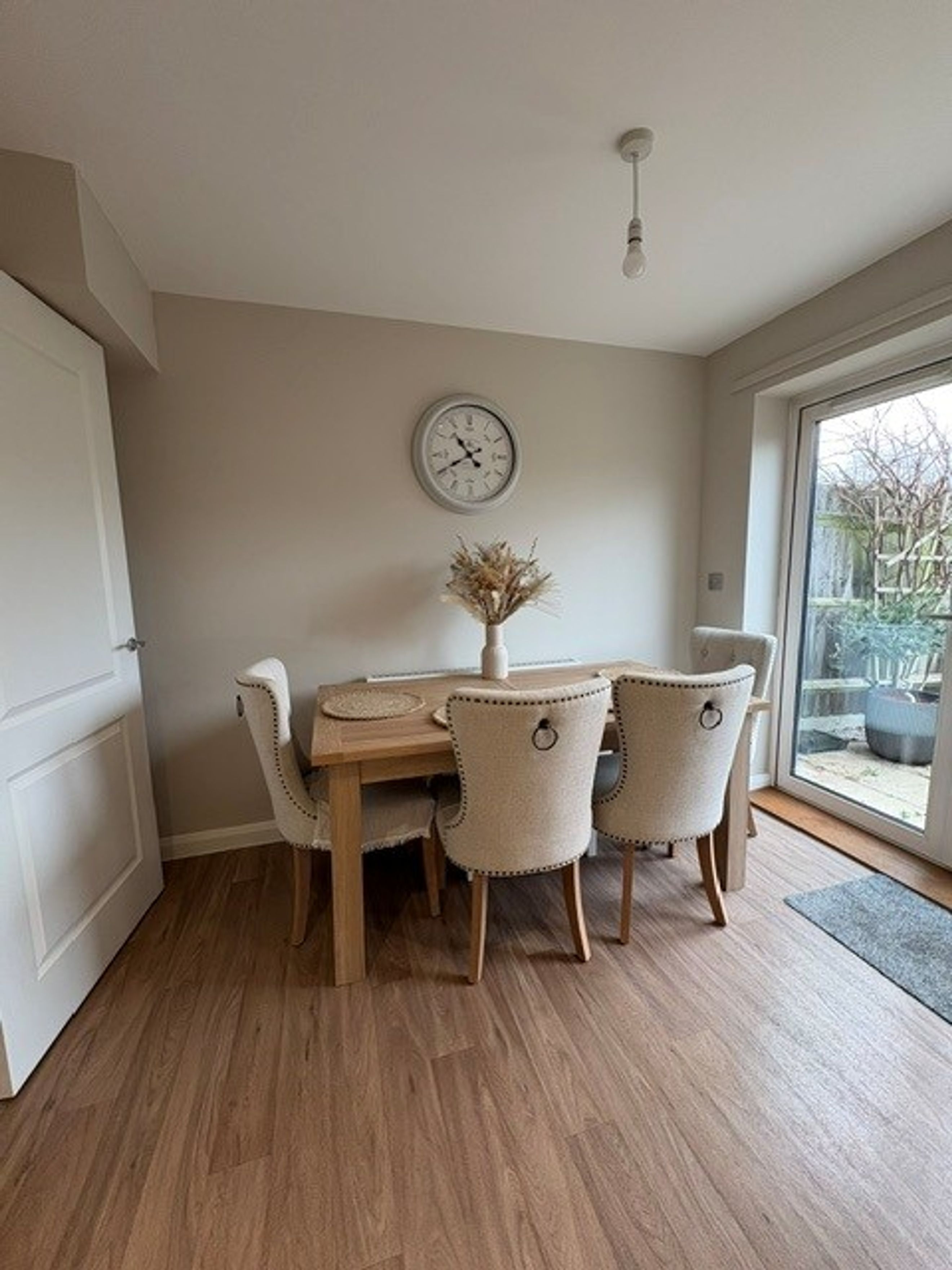 On the ground floor there is a modern kitchen diner with integrated washing machine, dishwasher and fridge freezer with doors opening to the patio and garden. The kitchen leads to the downstairs WC and living area.