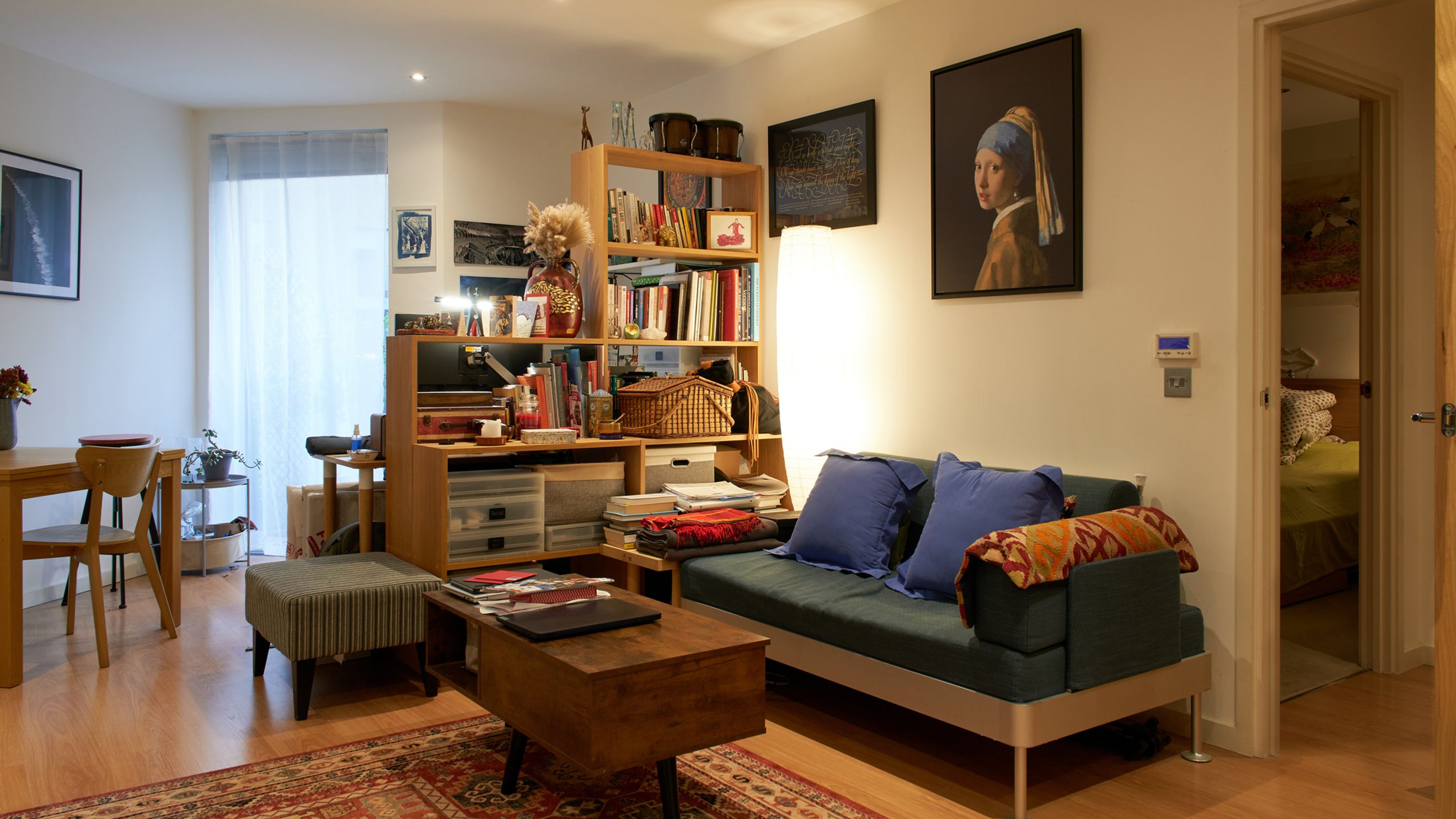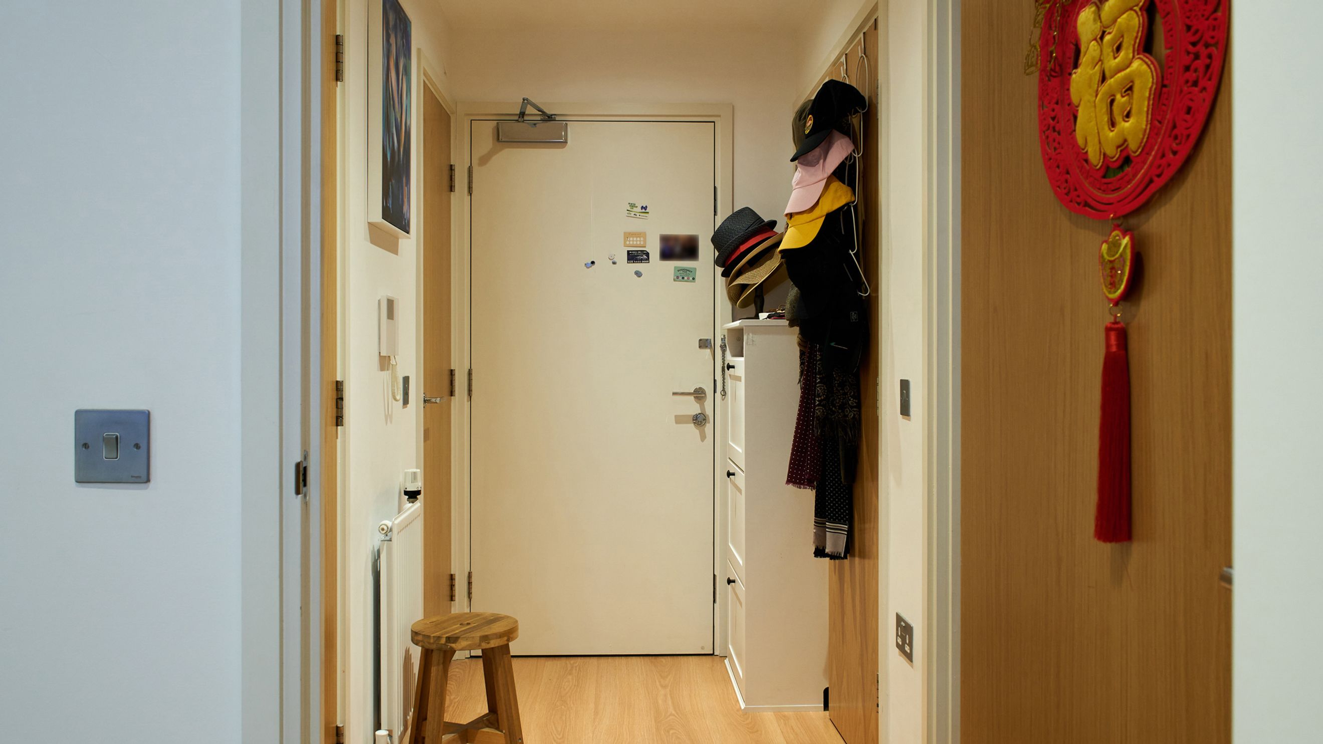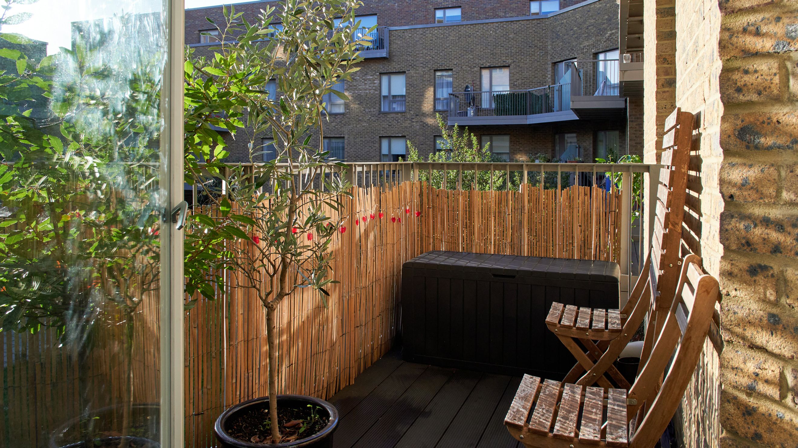 The flat offers a comfortable and well-proportioned living space, ideally suited for a young couple or first-time buyers. The living area features wooden flooring and opens onto a south-facing balcony, creating a bright and welcoming environment with plenty of natural light throughout the day.