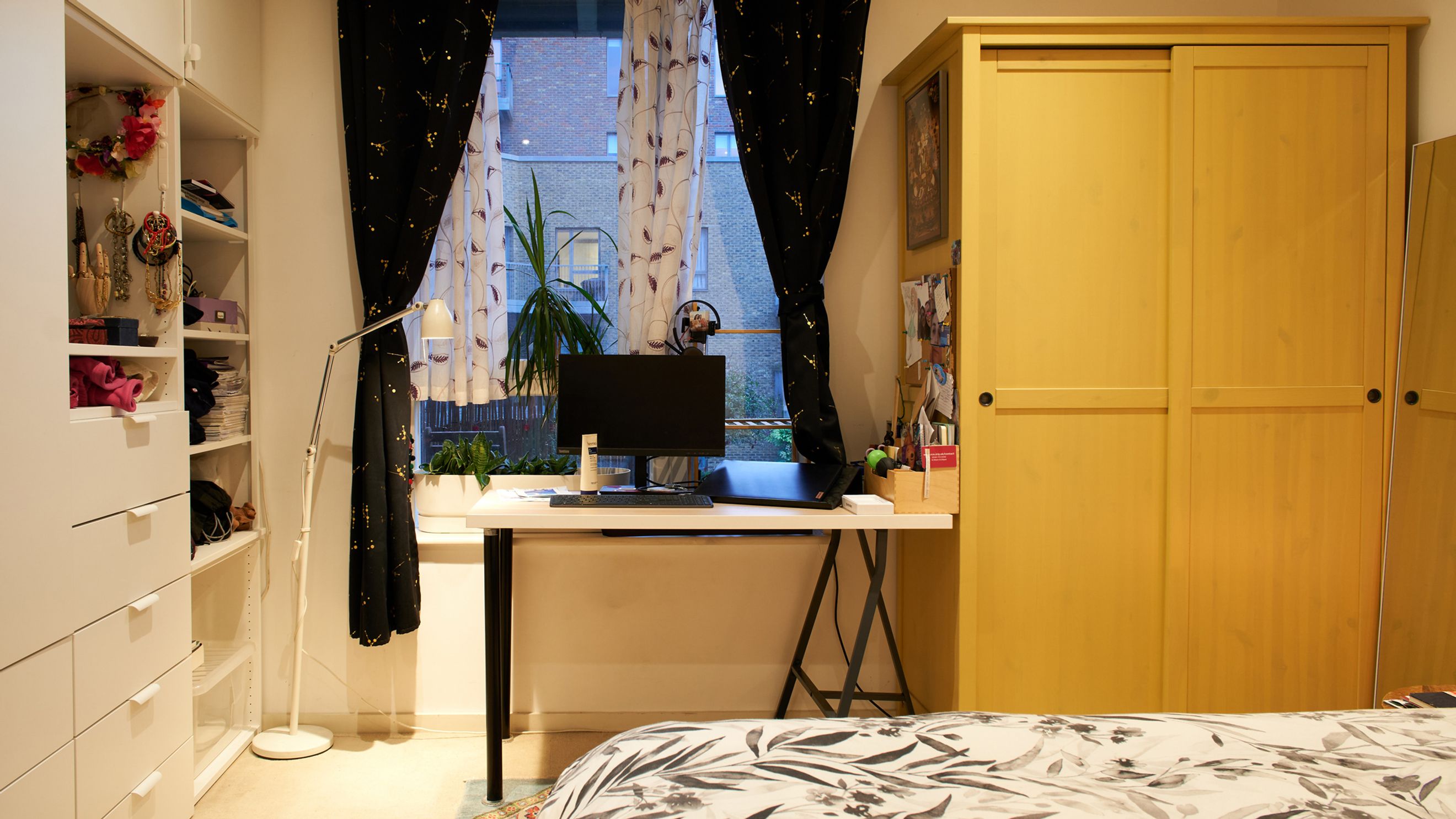 The bedroom is a cosy and relaxing space, finished with carpeting and complemented by a fitted wardrobe that provides practical storage without compromising floor space. The kitchen is fitted with standard white goods and integrated cabinetry, offering a functional and tidy layout for everyday living.