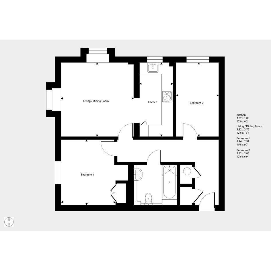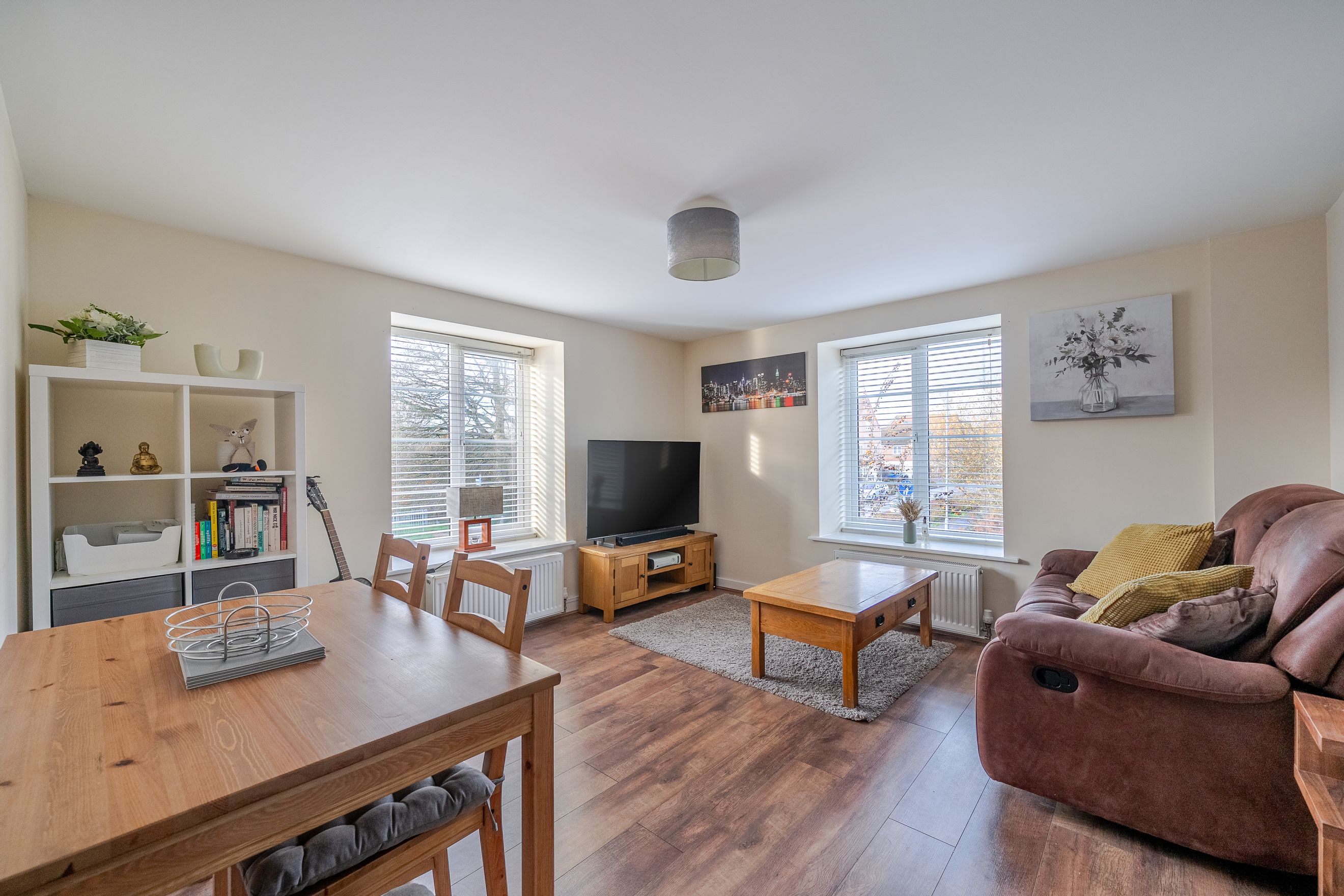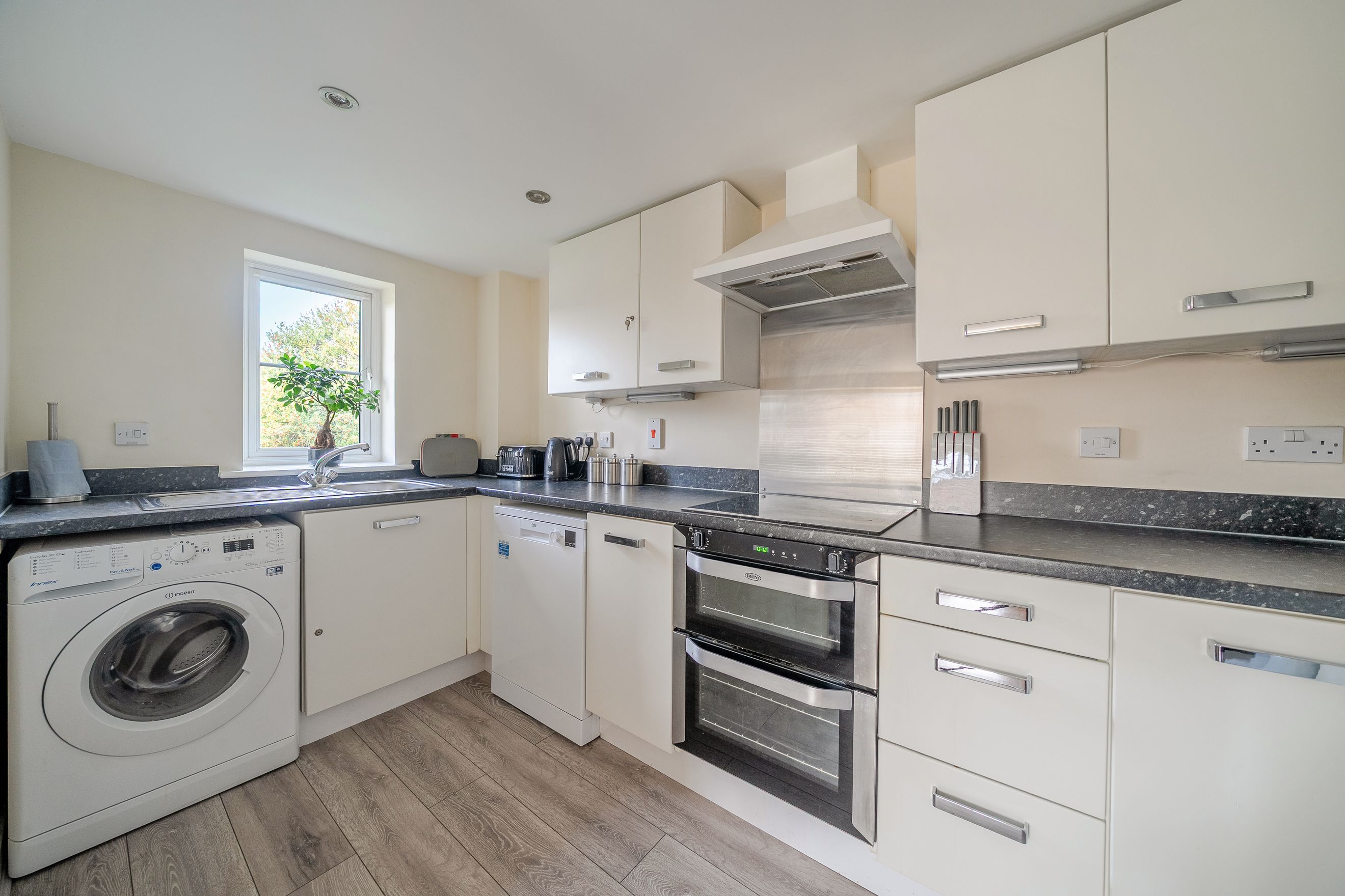 Featuring an open-plan living area with dual-aspect windows. The kitchen has an integrated oven, hob and hood.