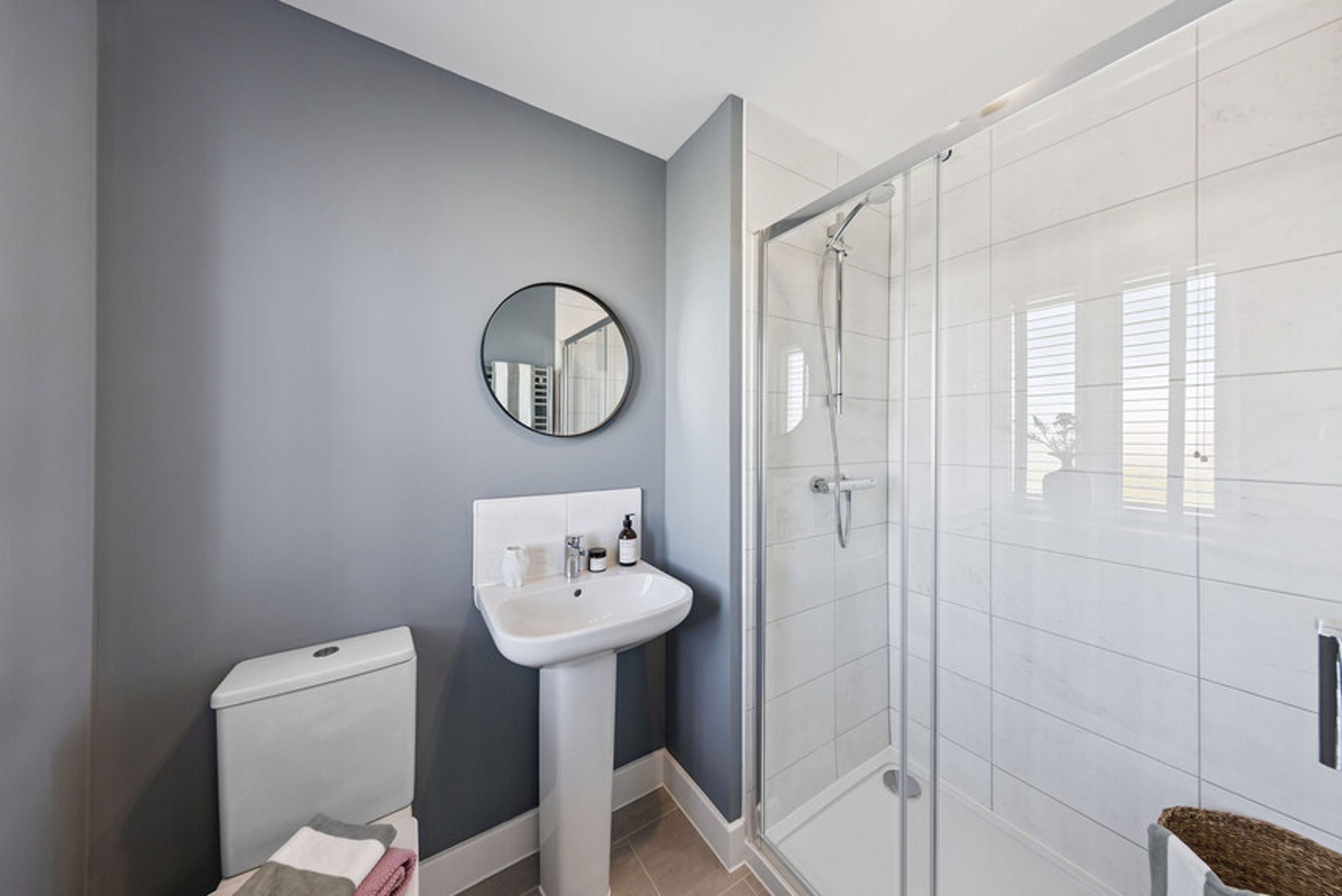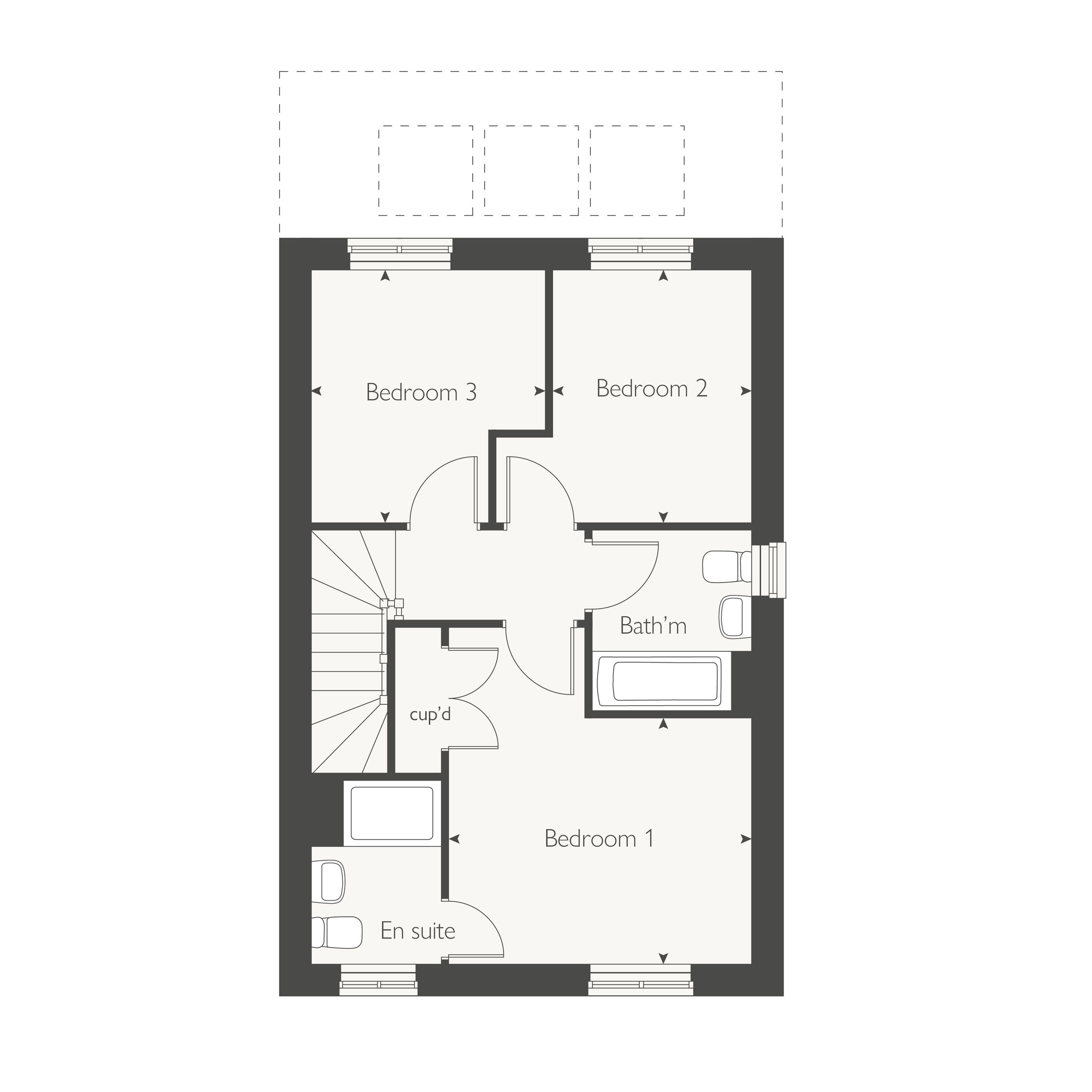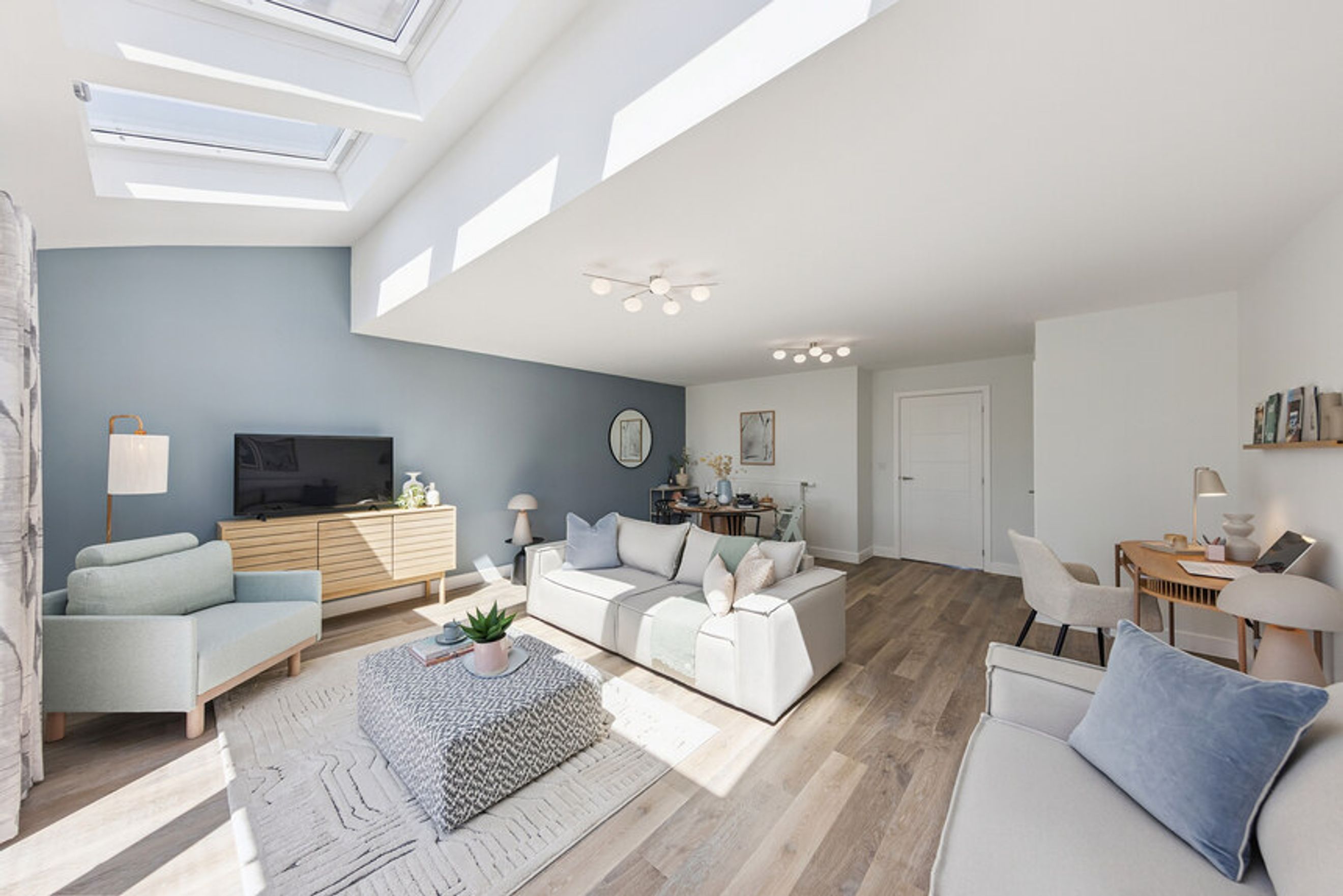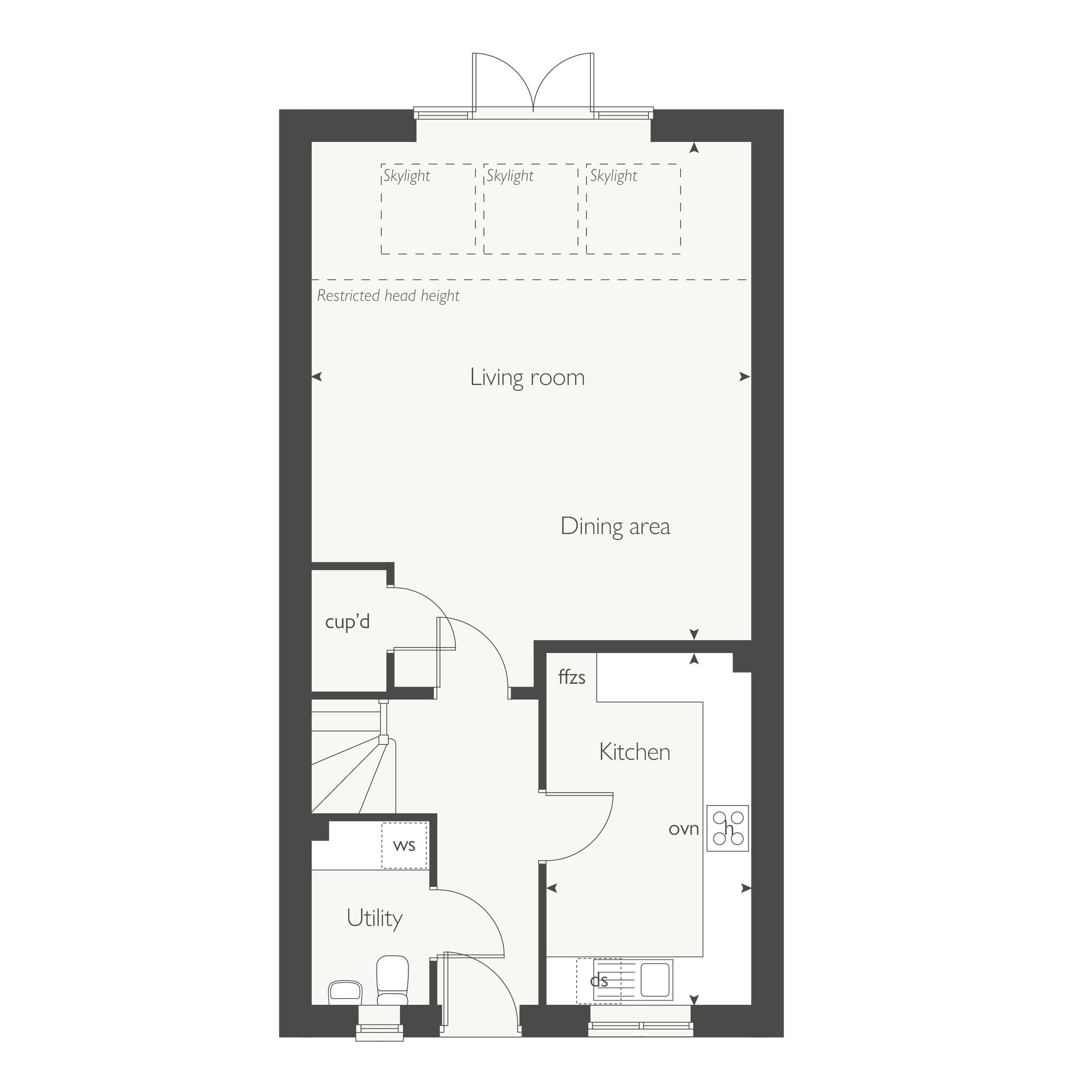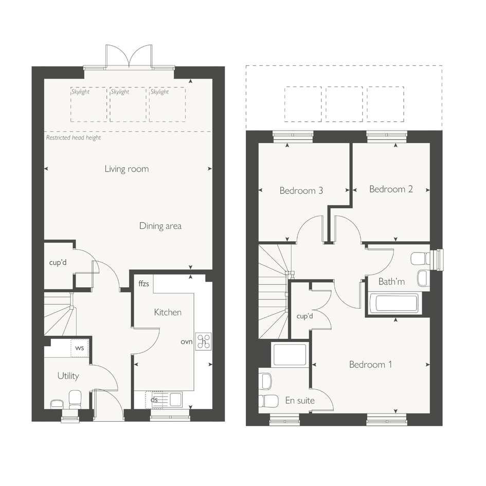 Nutmeg features a bright, open‑plan living and dining room with skylights and French doors that lead straight into the rear garden. At the front, a separate kitchen offers a practical layout for cooking, complemented by a dedicated utility room. The ground floor also includes a convenient WC and an under‑stairs cupboard. Upstairs, the home has three well‑proportioned bedrooms: a main bedroom with its own en‑suite, a comfortable double room, and a third bedroom that works well as a single, nursery, or home office. A modern family bathroom completes the layout.