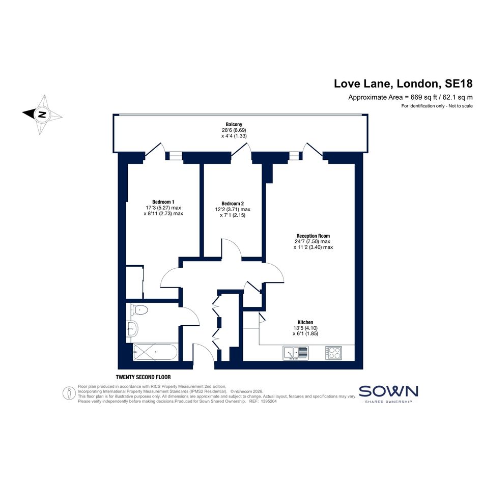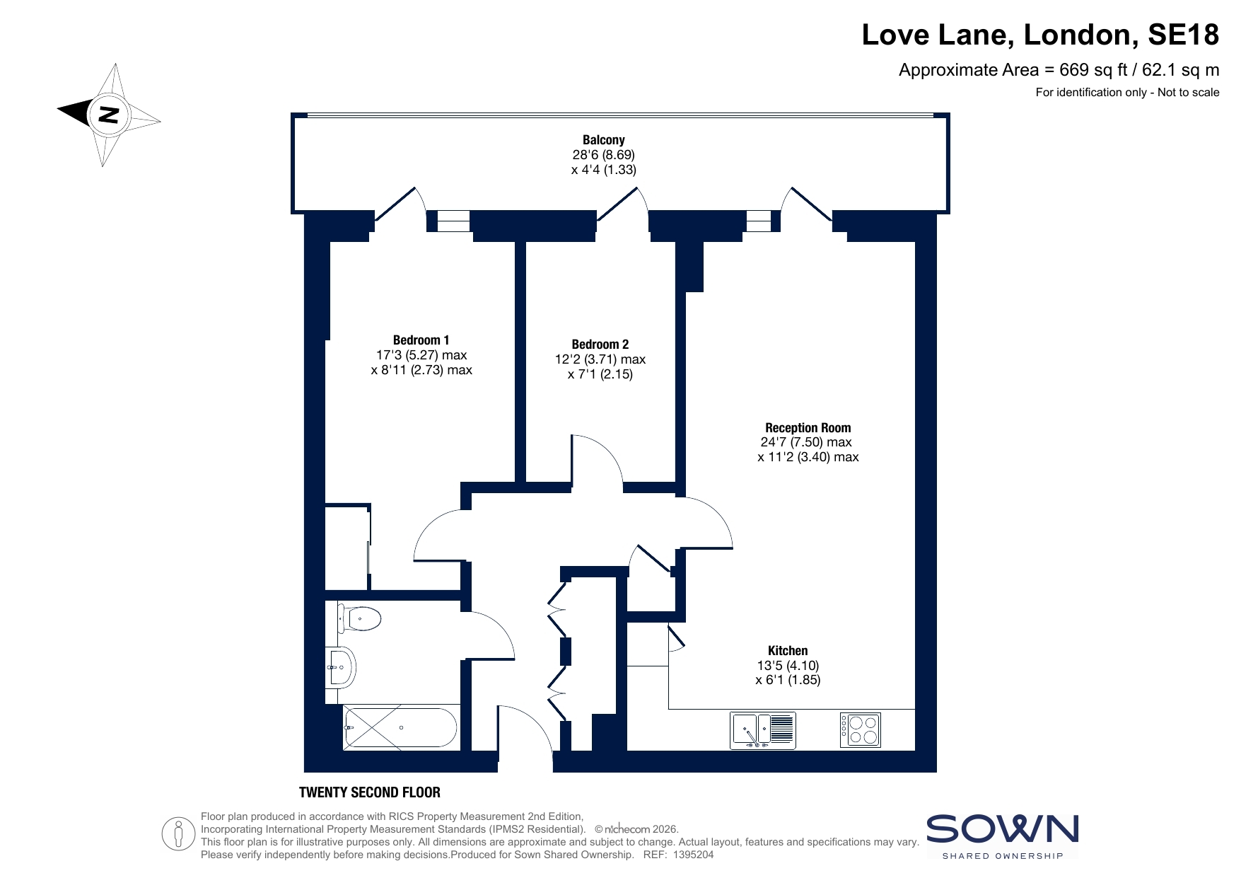 Set on a high floor of a modern development in SE18, this well-proportioned apartment offers an appealing blend of space, light, and functionality, complemented by far-reaching views across London. The property is thoughtfully arranged to suit contemporary living, with a clear separation between living, sleeping, and service areas. The reception room forms the heart of the home, providing a generous and versatile space for both relaxation and entertaining. Large windows draw in natural light and connect seamlessly to a private balcony, creating an ideal spot for morning coffee or evening downtime while enjoying the elevated outlook. The kitchen is positioned conveniently off the main living space and is fitted with practical work surfaces and storage, making it well suited for everyday use. Both bedrooms are well defined and comfortably proportioned, offering flexibility for a main bedroom and guest room, home office, or nursery. A neatly arranged bathroom and additional storage off the hallway enhance the overall practicality of the apartment. Located on the twentieth floor, the property benefits from a sense of privacy and calm, while remaining well placed for local amenities, transport links, and the riverside attractions of Woolwich and the surrounding area.