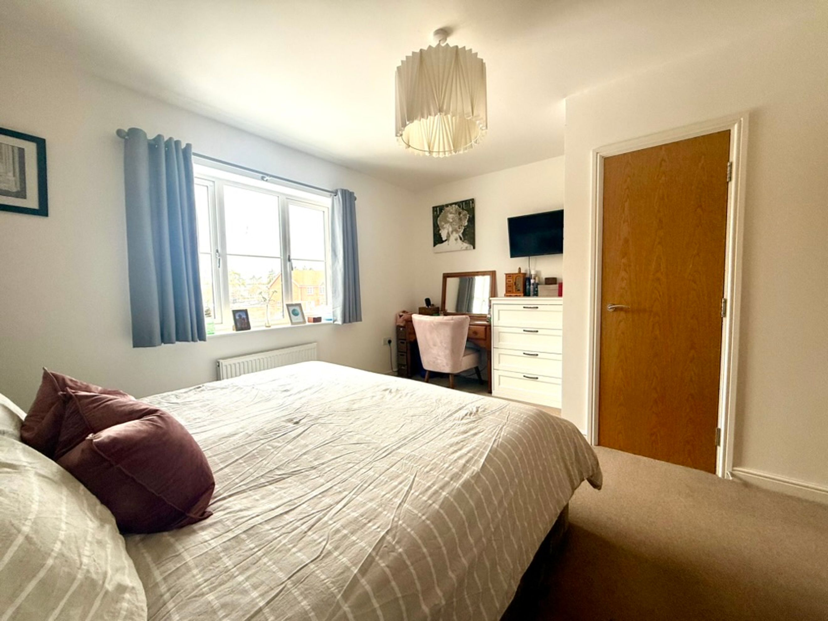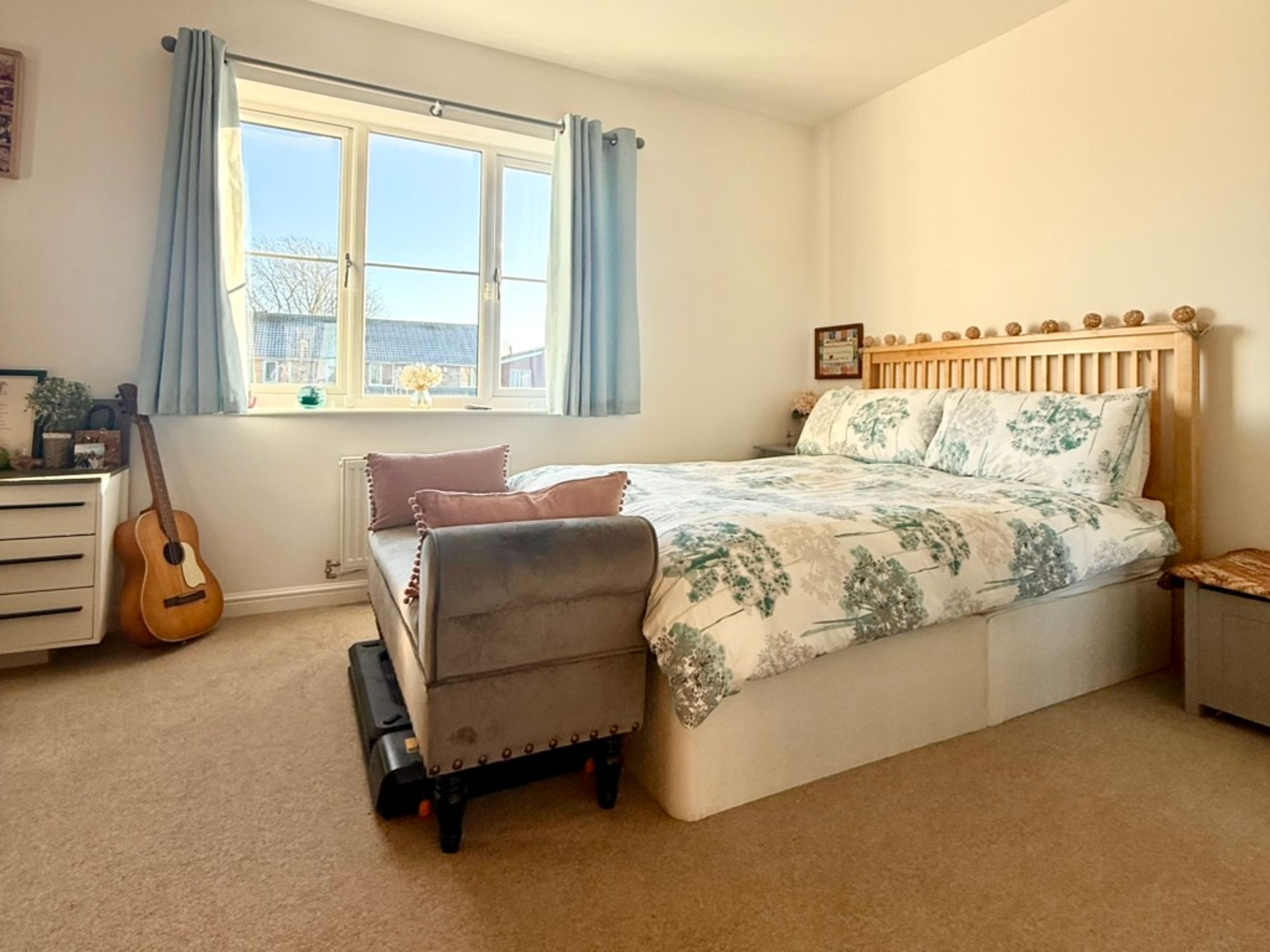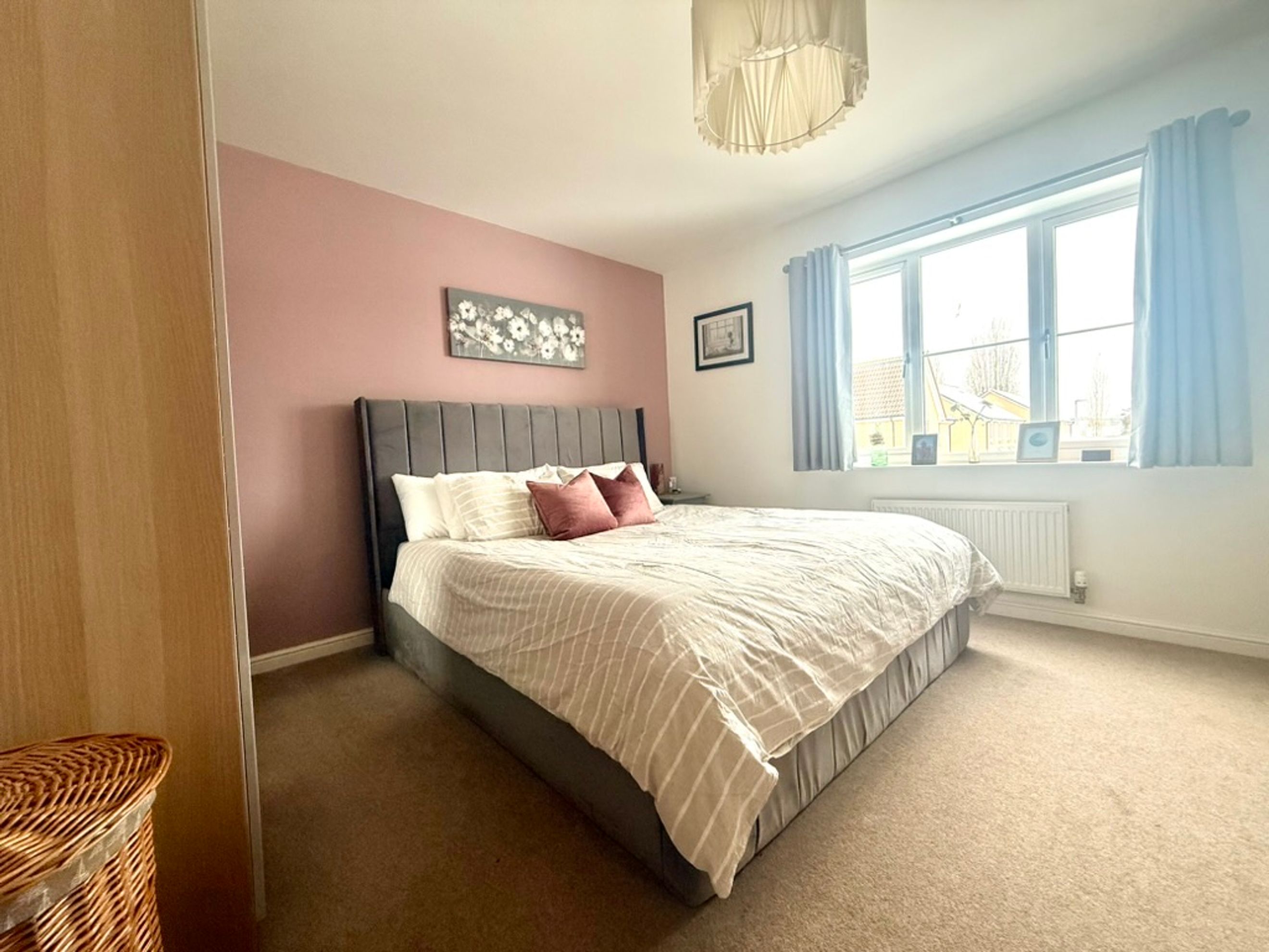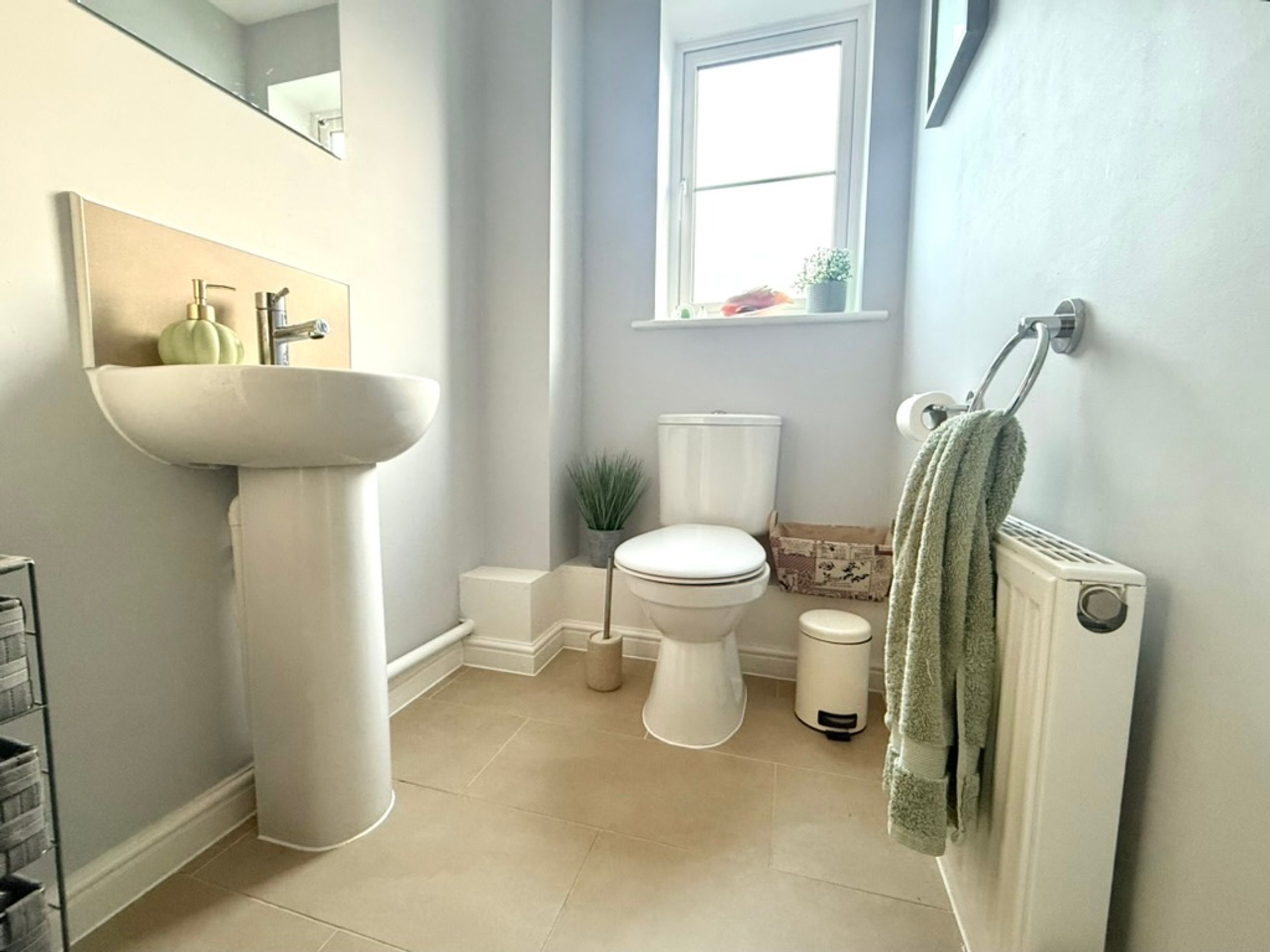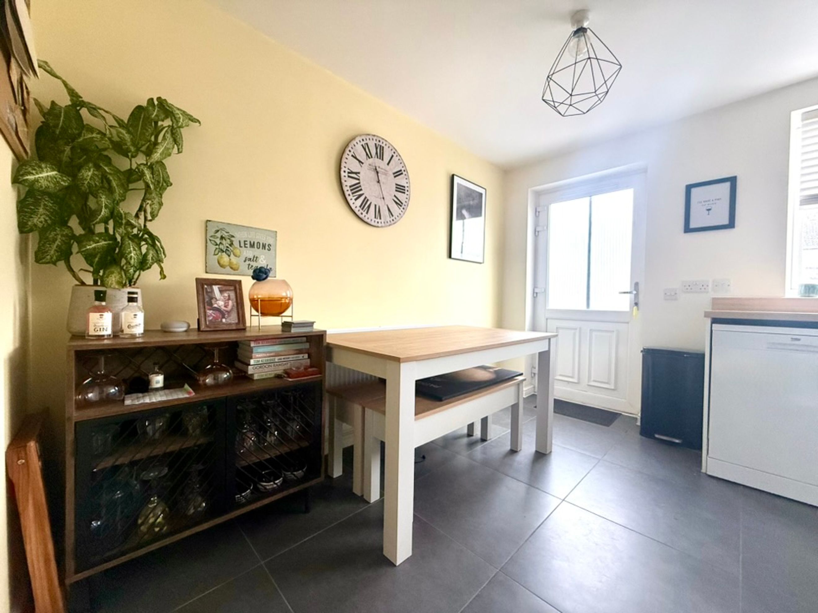 The front door opens into a welcoming entrance hall, leading through to a bright and comfortable living room at the front of the property — a perfect space to relax or entertain. To the rear, the kitchen/breakfast room enjoys views across the garden and is fitted with a range of modern wall and base units, along with an integrated oven, hob and fridge/freezer. There is space for a dishwasher and washing machine, and a door from the dining area opens directly onto the garden, ideal for everyday living and social occasions. A downstairs cloakroom and handy storage cupboard complete the ground floor.